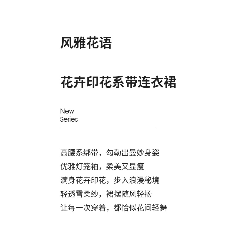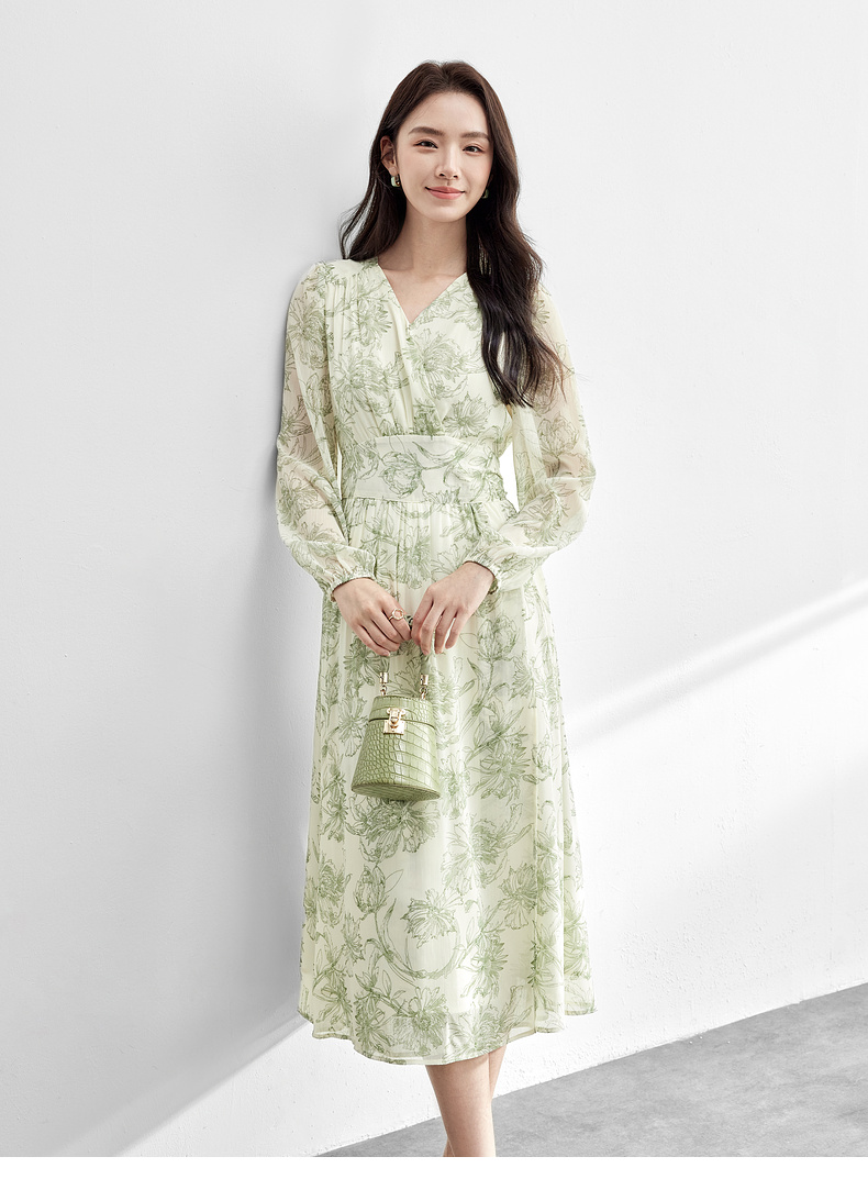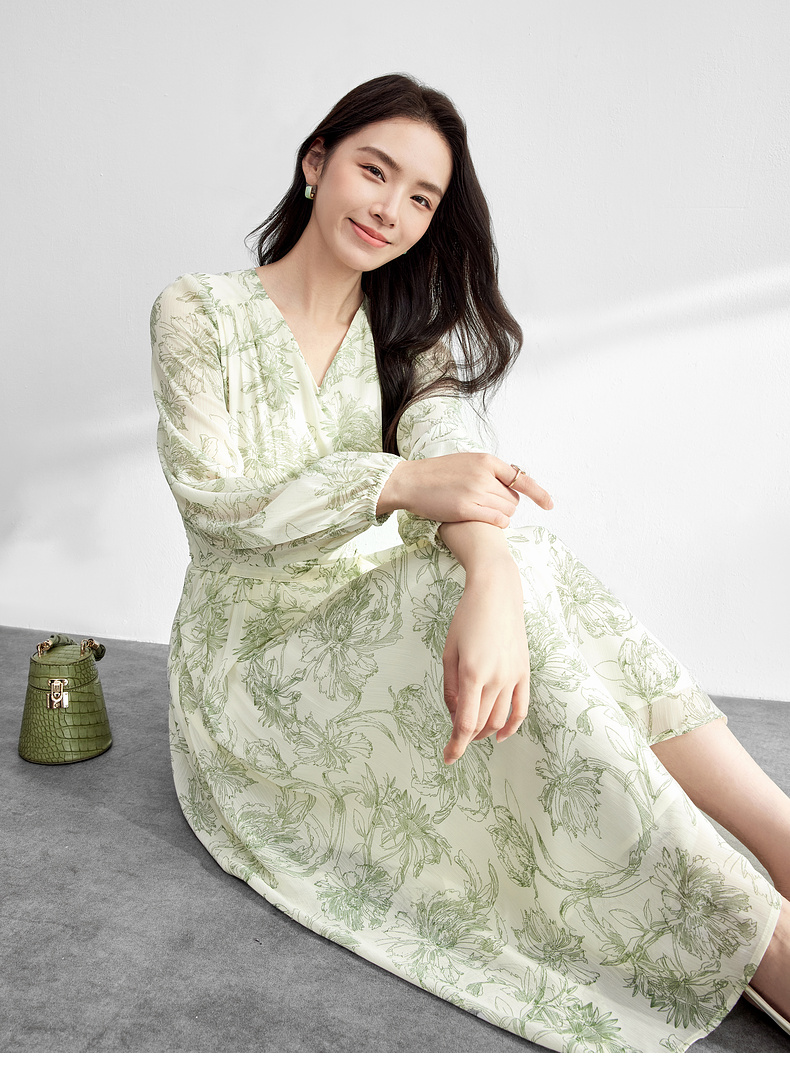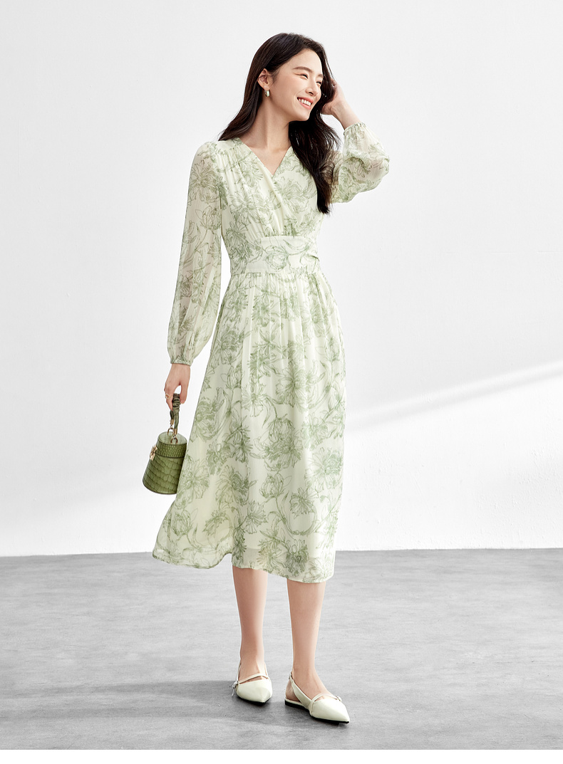 【内购】【花卉印花】优雅度假V领灯笼袖高腰系绑带收腰显瘦中长款连衣裙-151L57736