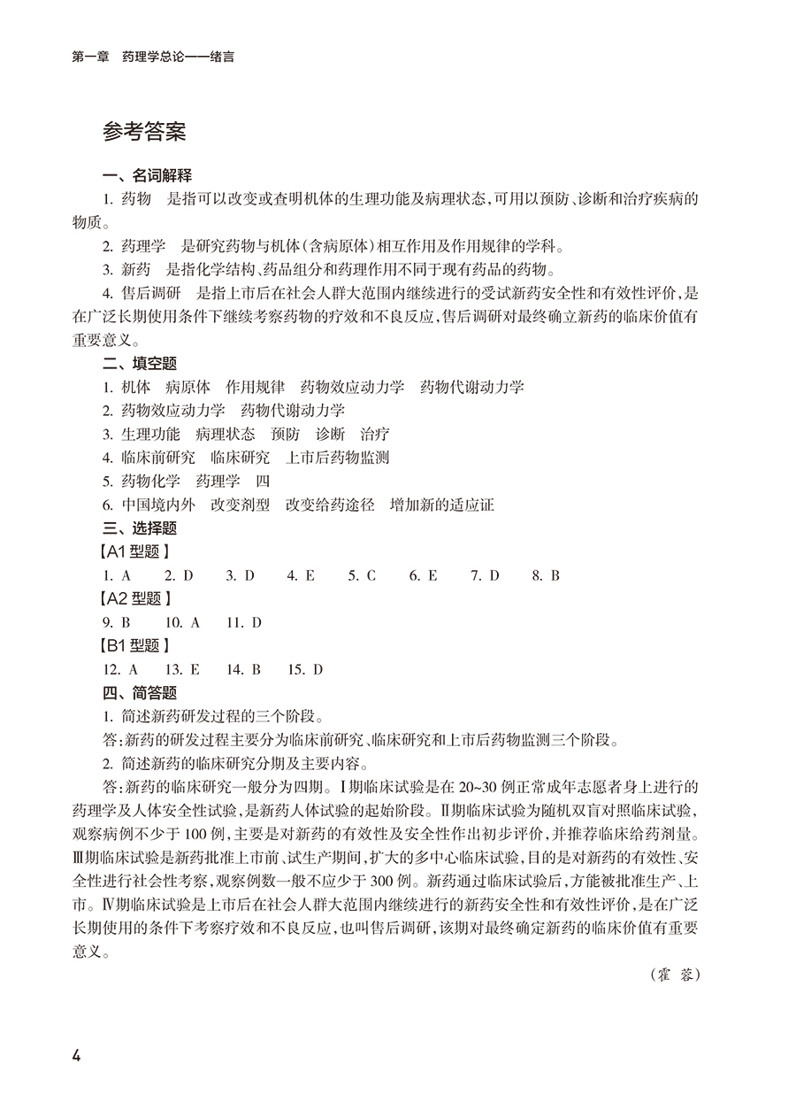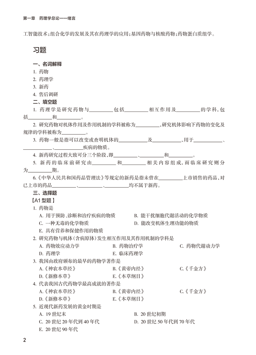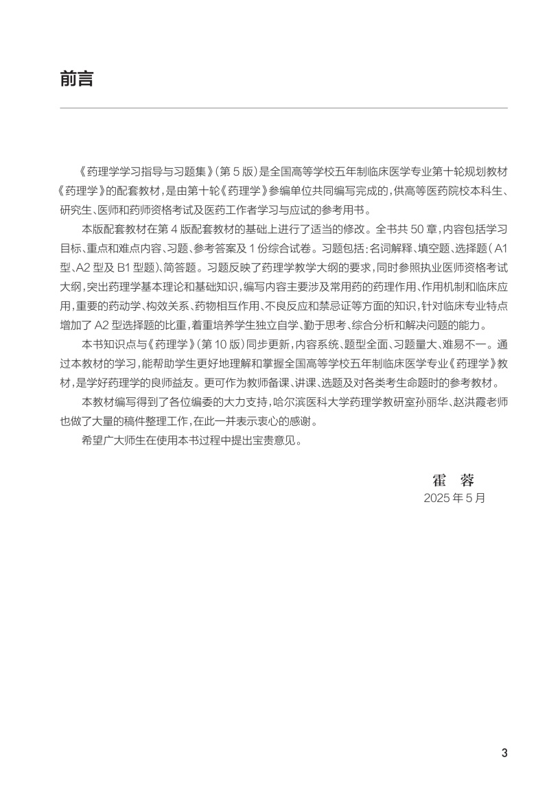 本版全书共50章,内容包括学习目标、重点和难点内容、习题及参考答案。习题包括名词解释、填空题、选择题(A1型、A2型及B1型题)、简答题和论述题。试题反映药理学教学大纲的要求,突出药理学基本理论和基本知识,编写内容主要涉及常用药的药理作用、作用机制和临床应用、重要的药代动力学、构效关系、药物相互作用、不良反应和禁忌证等方面的知识。本版修订将适当增加临床案例分析题,有助于学生更好地理解和掌握《药理学》,同时更加契合临床实践工作及执业医师考试的需求。