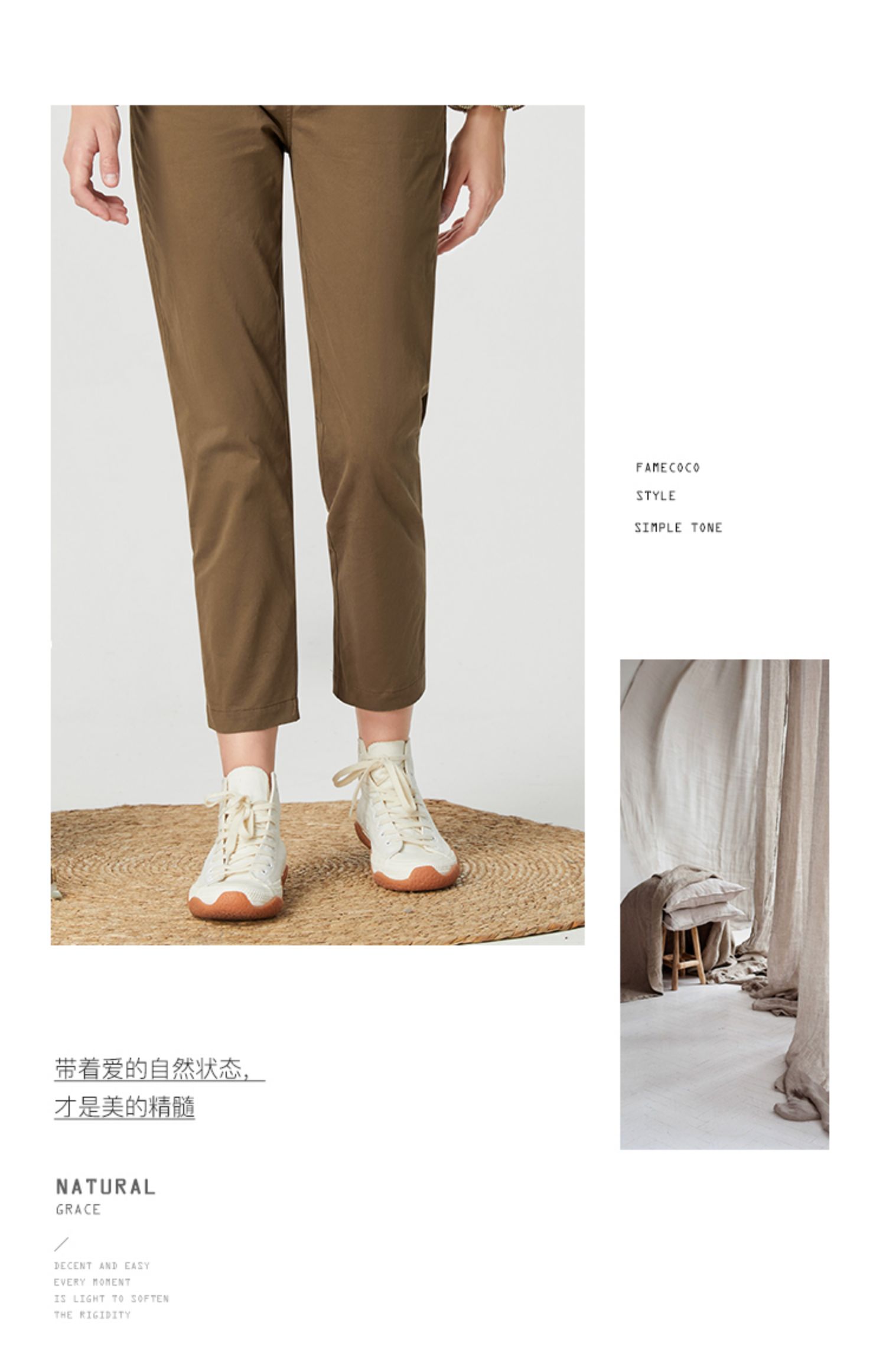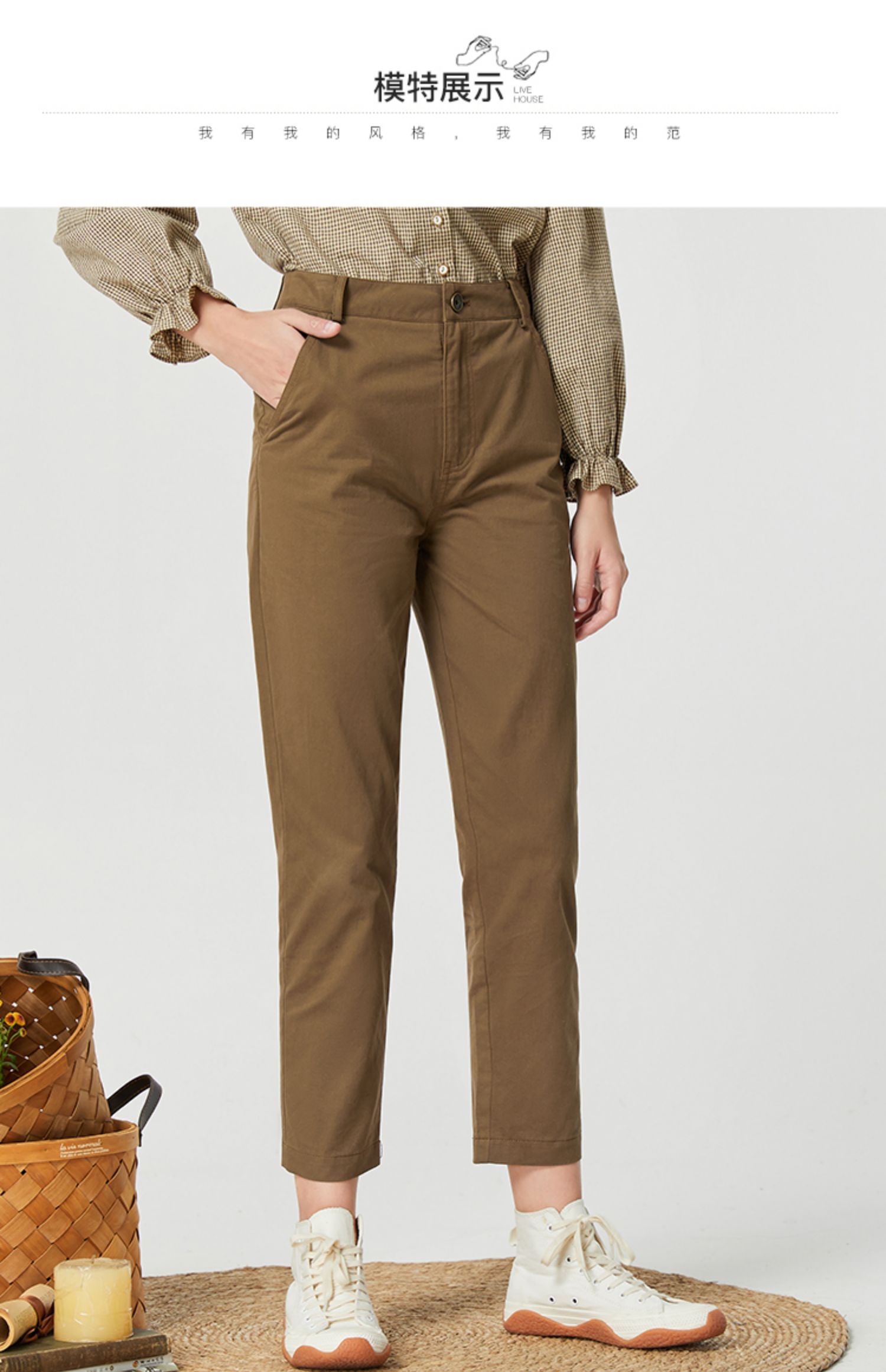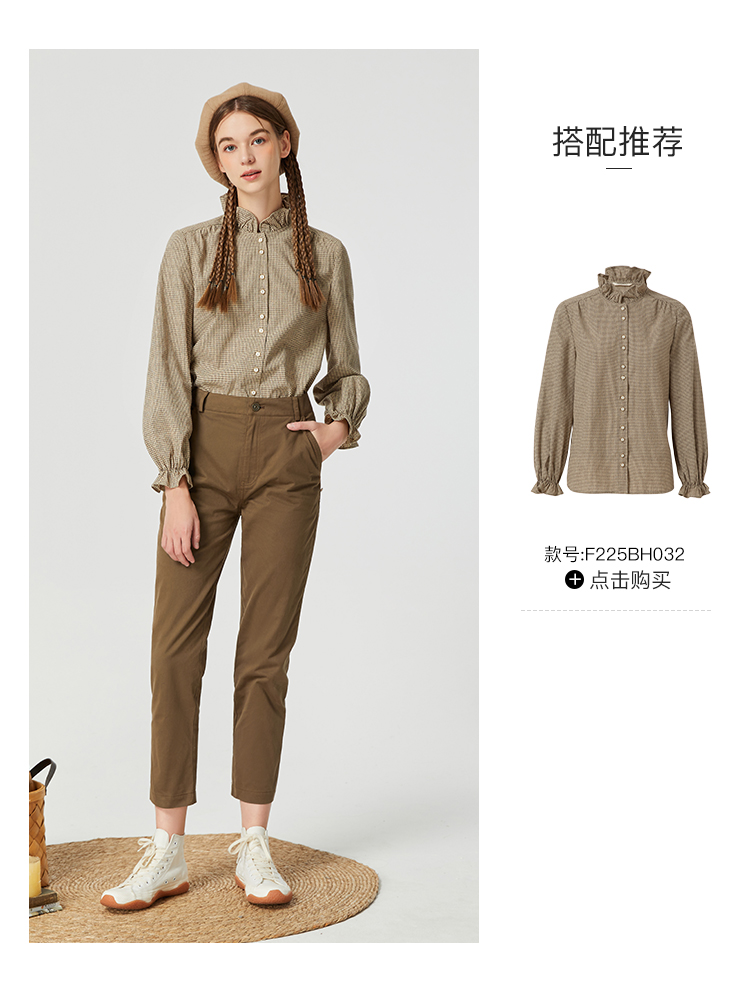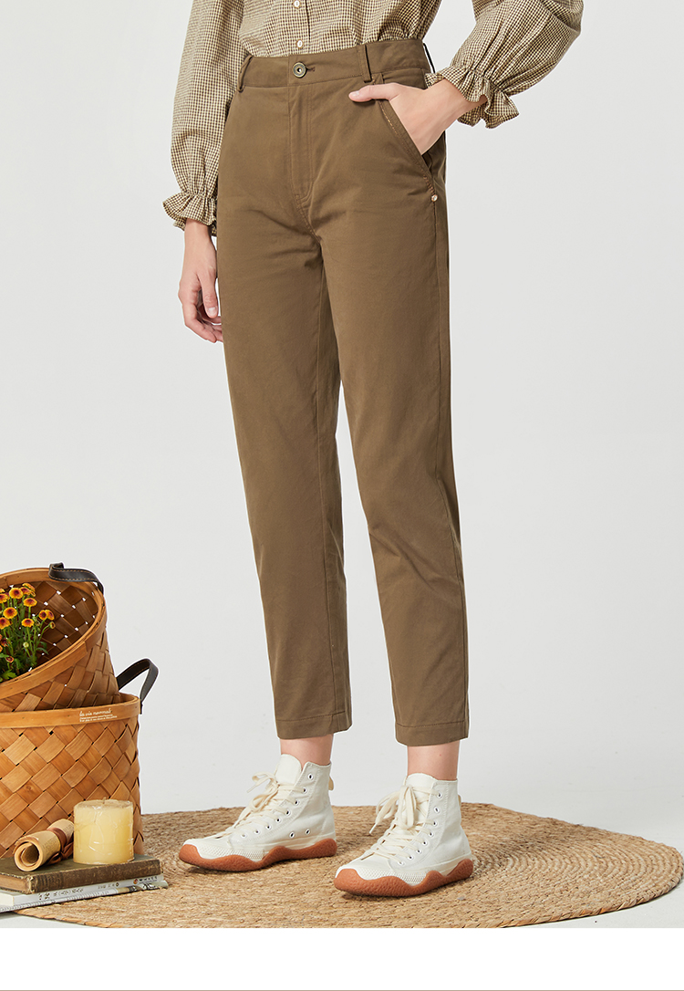 Famecoco范可儿女士休闲裤纯棉咖色秋季直筒裤显瘦百搭高腰小个子F225GA008