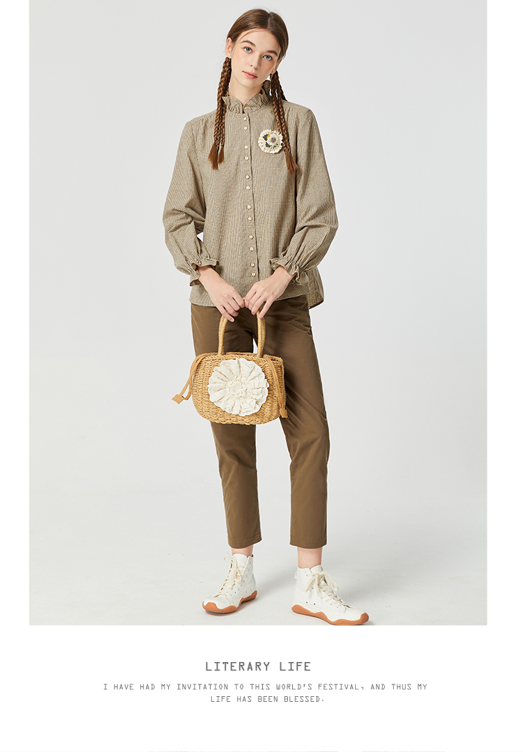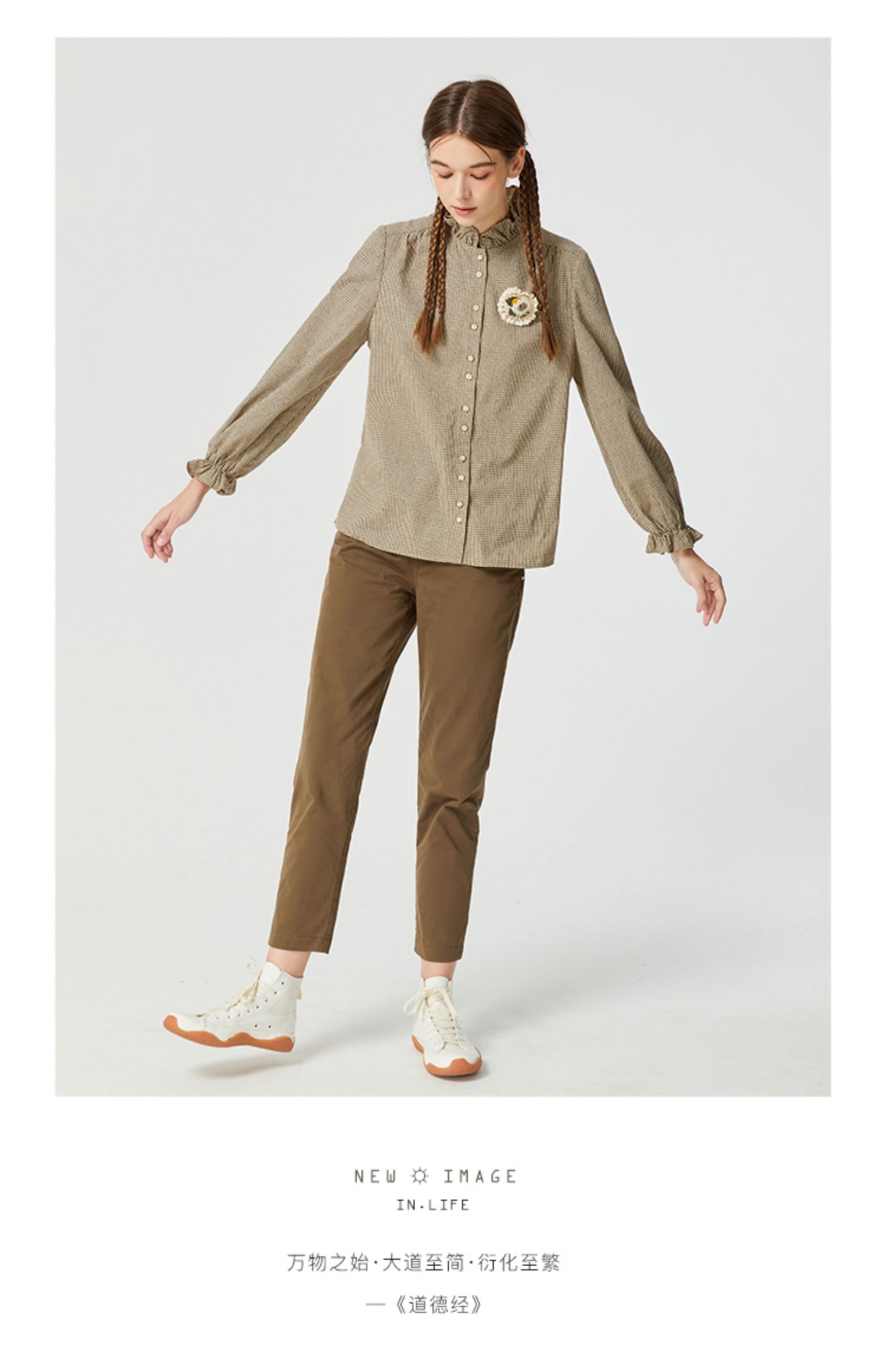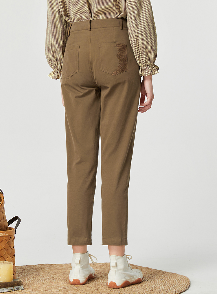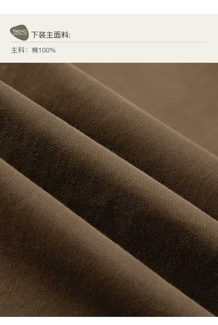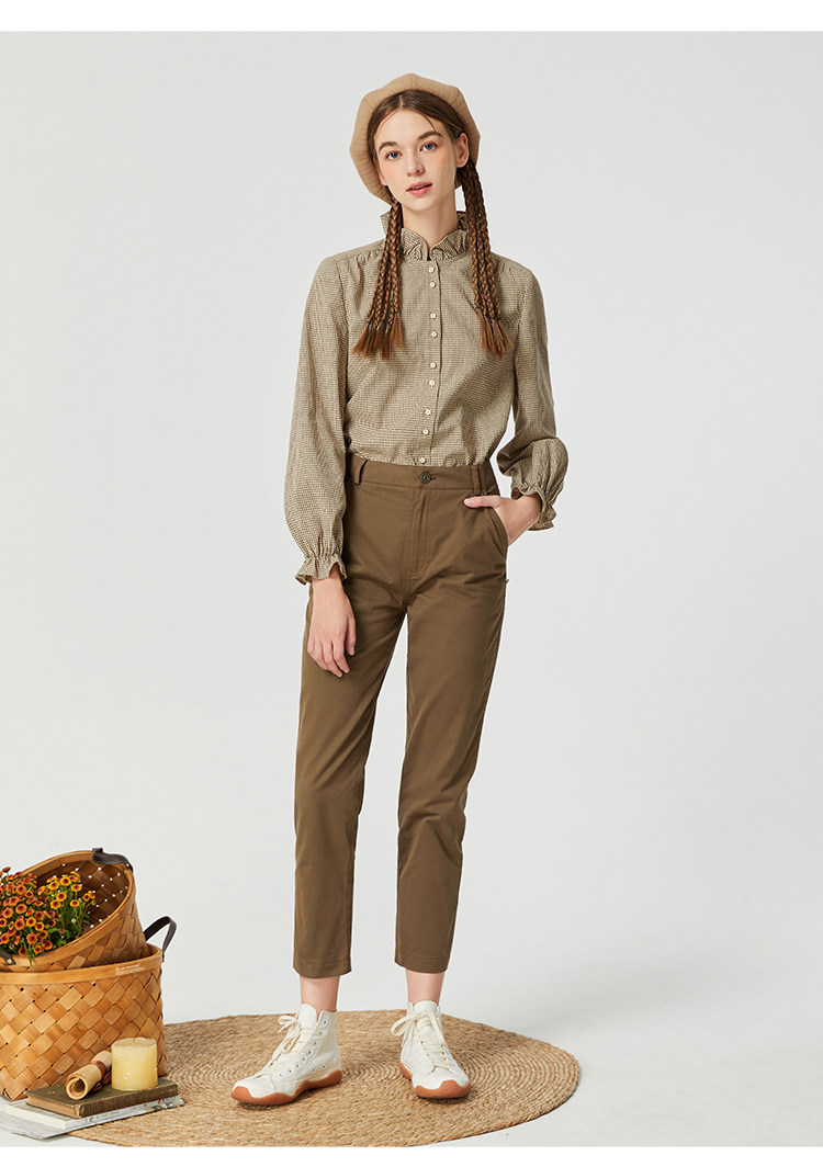 Famecoco范可儿女士休闲裤纯棉咖色秋季直筒裤显瘦百搭高腰小个子F225GA008