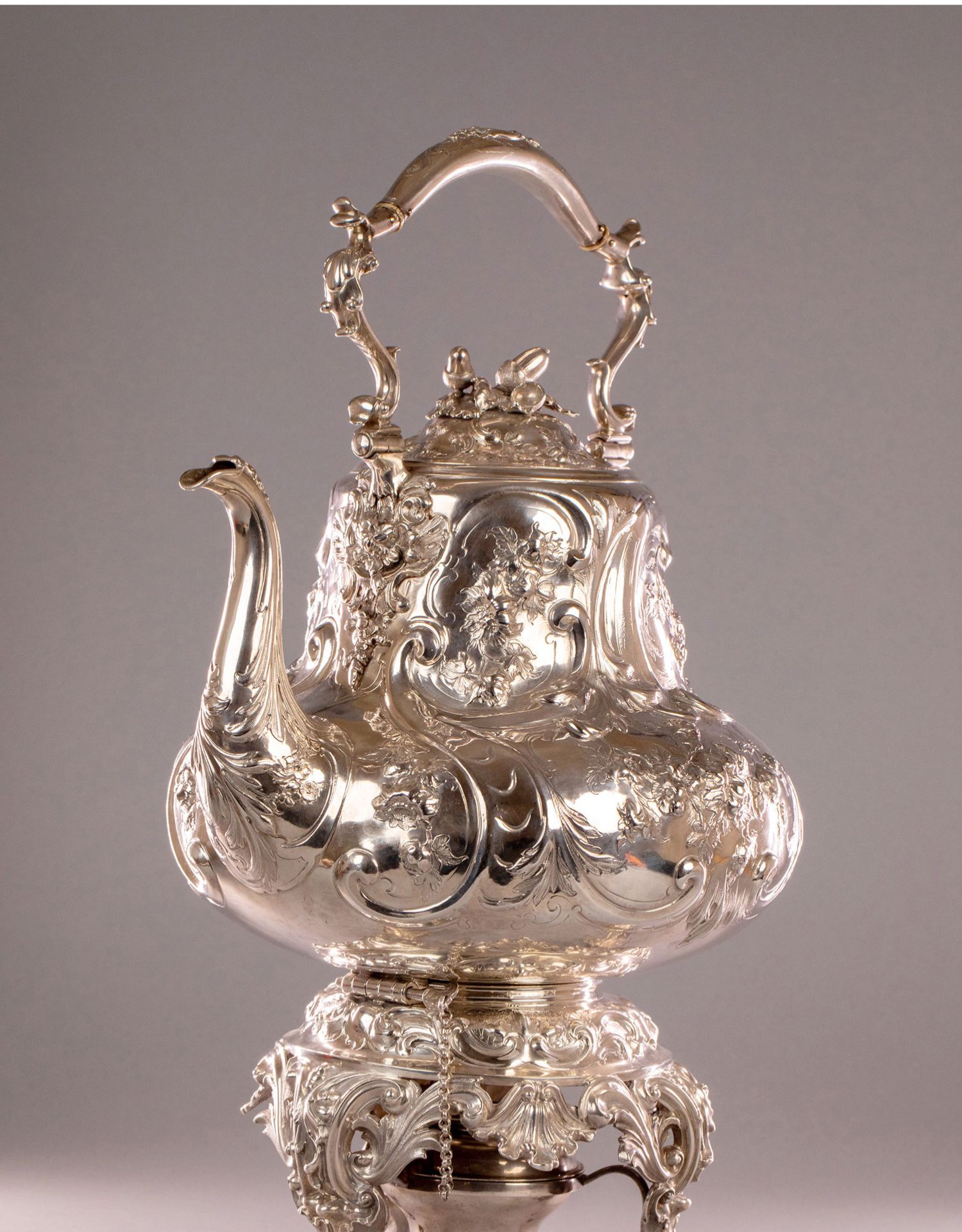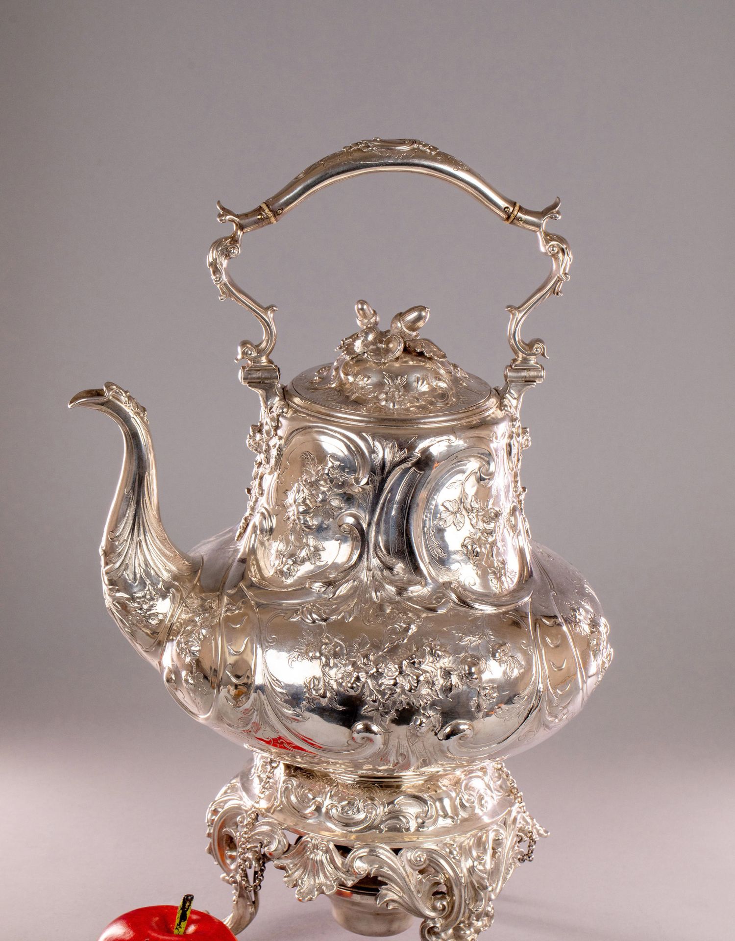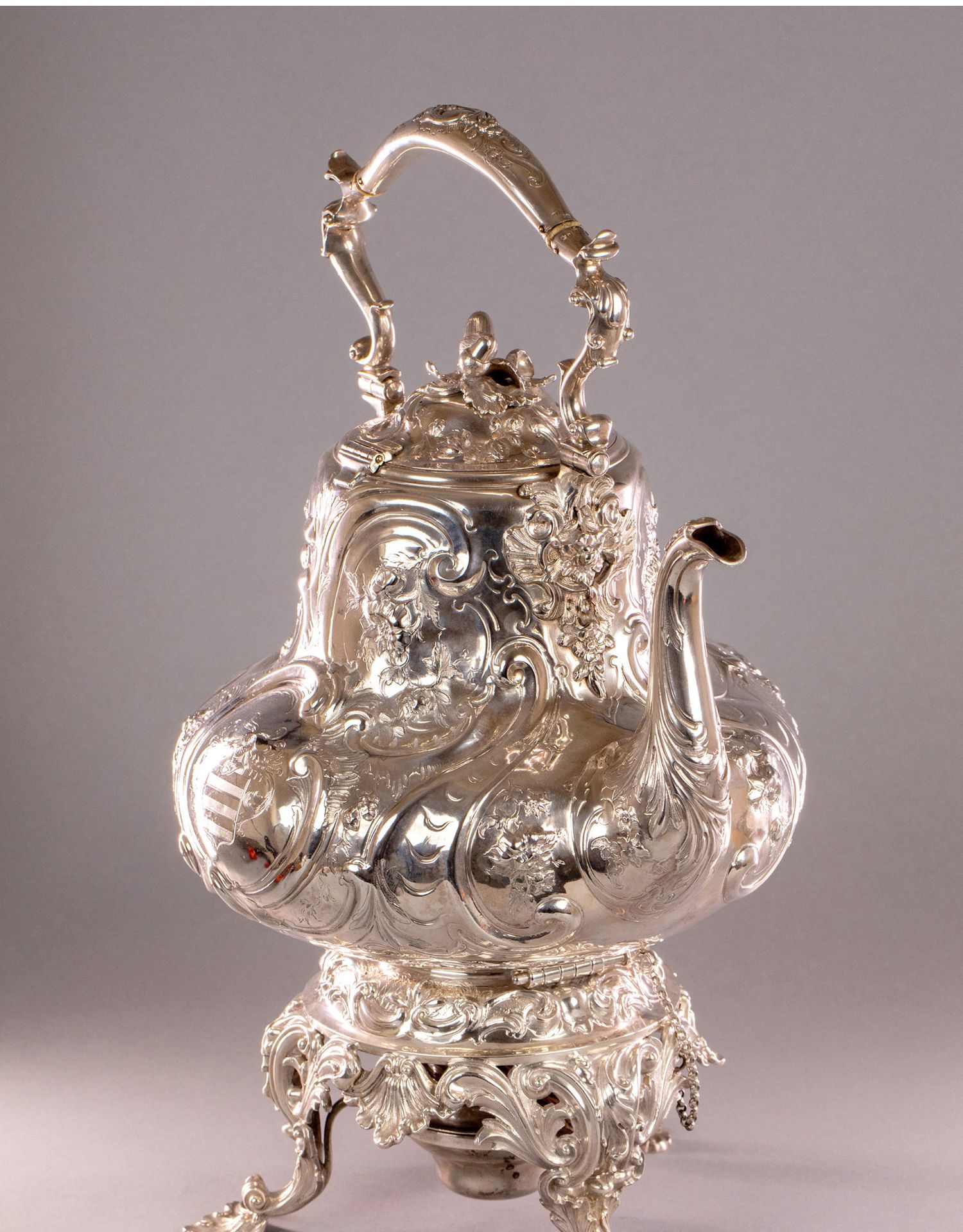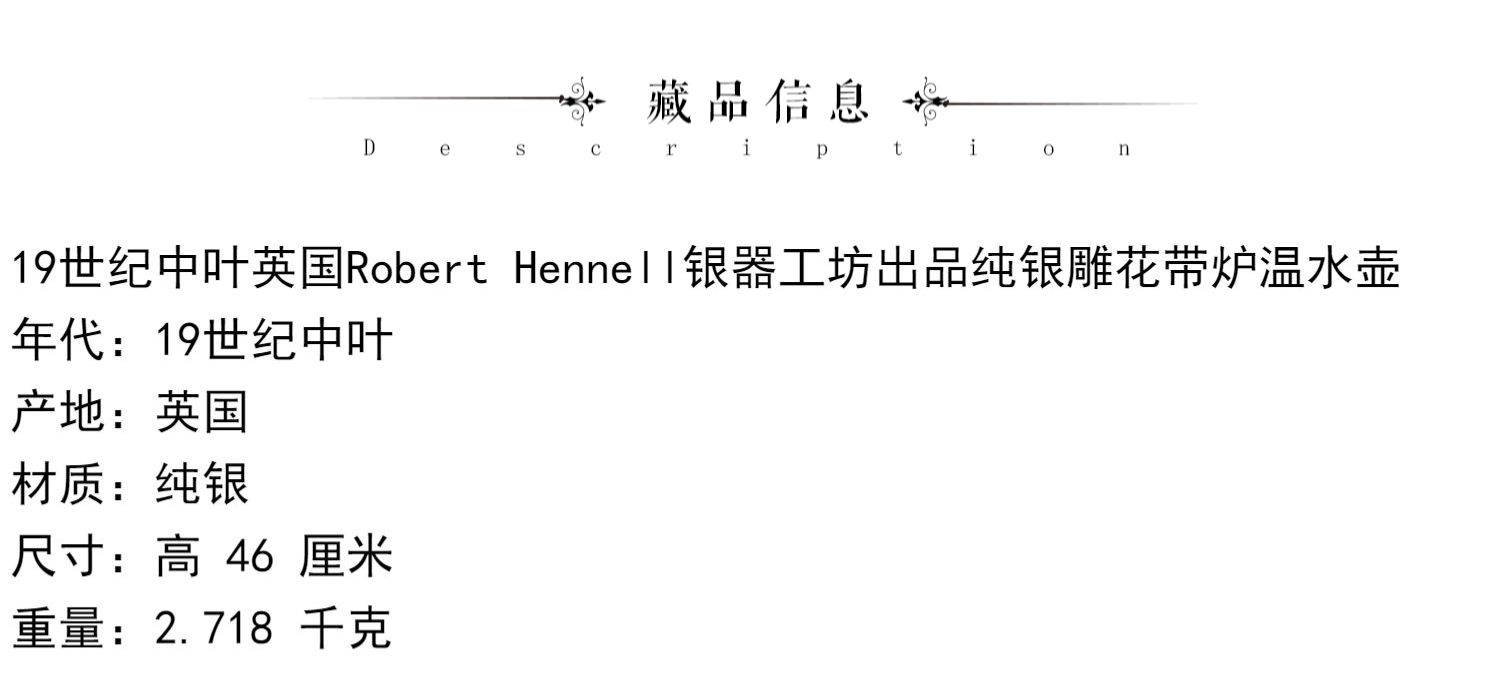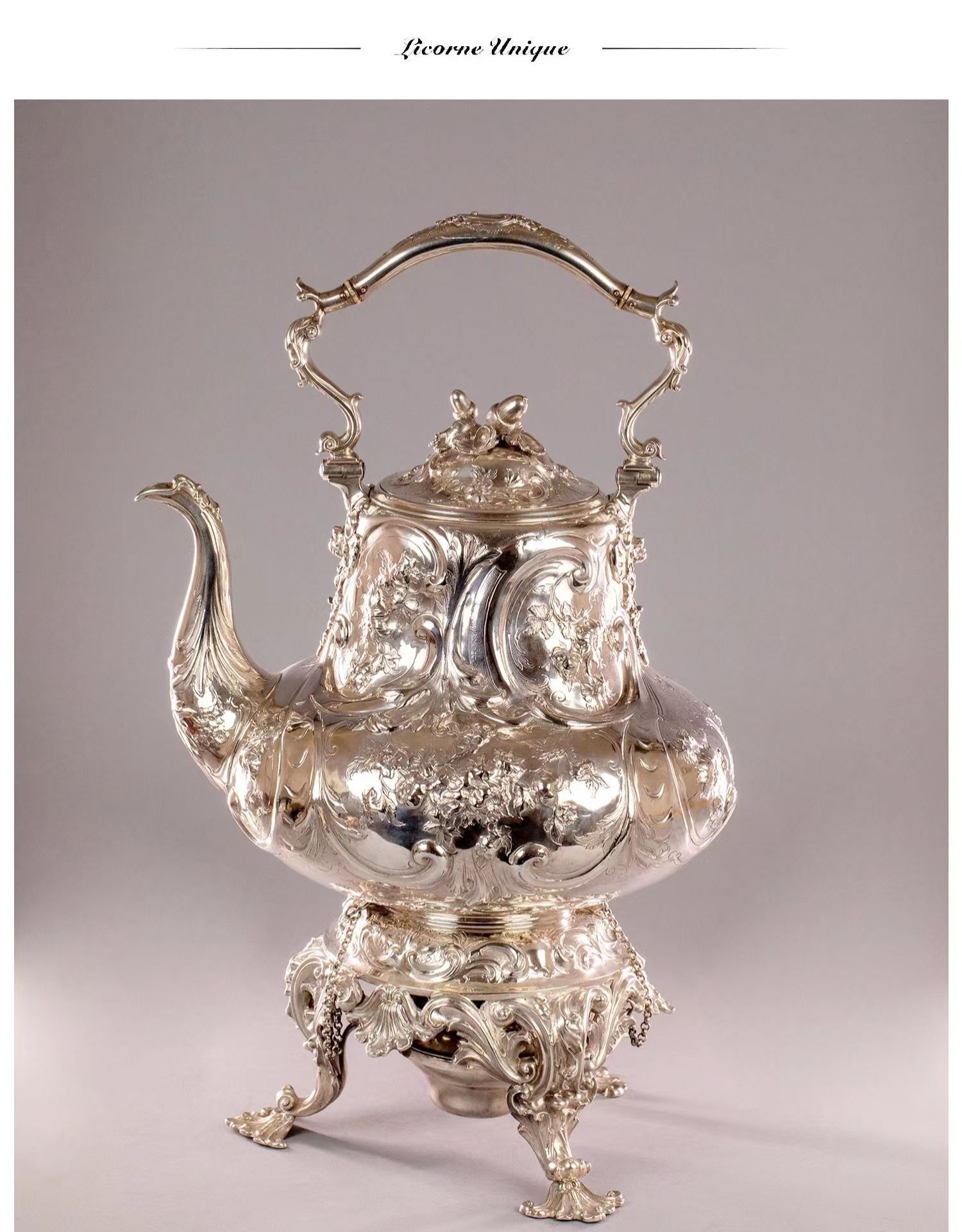 独角鹿西洋古董英国Robert Hennell银器工坊纯银雕花带炉温水壶