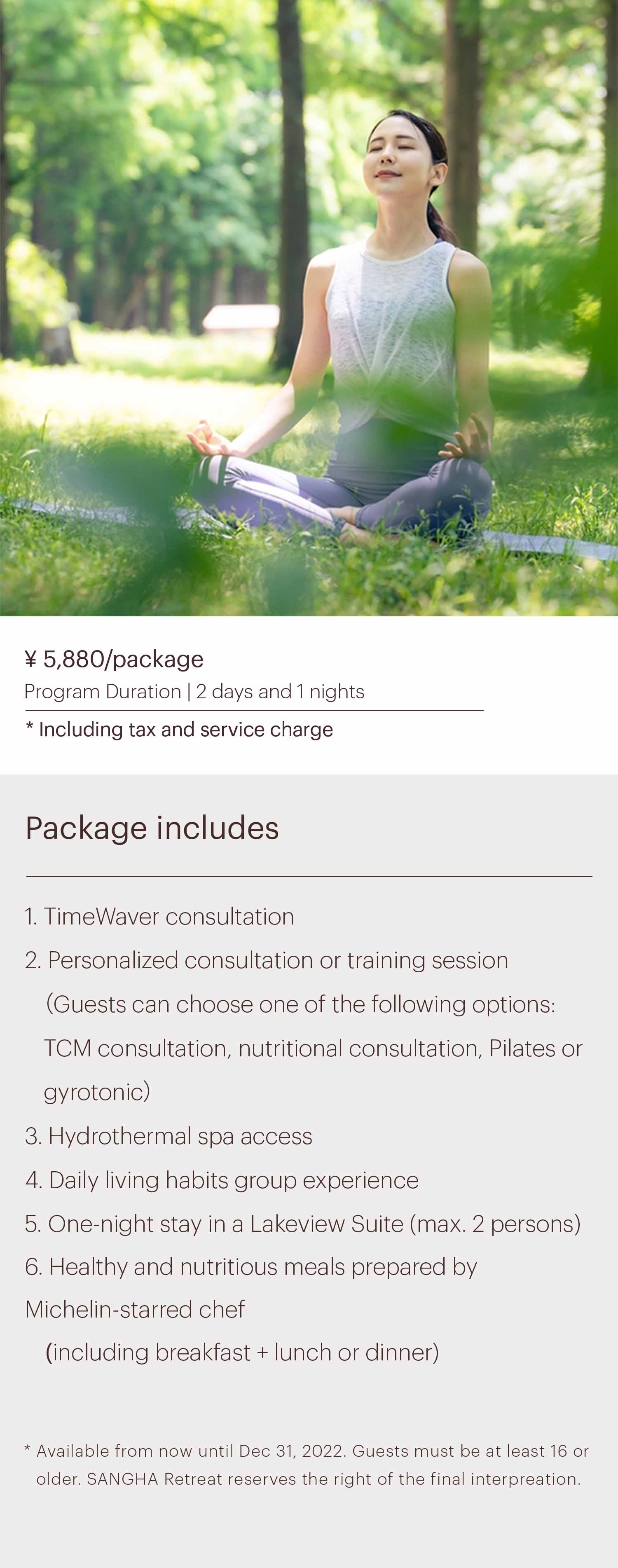 - Program components are subject to change upon the advice of SANGHA Retreat staff, including doctors and life coaches.