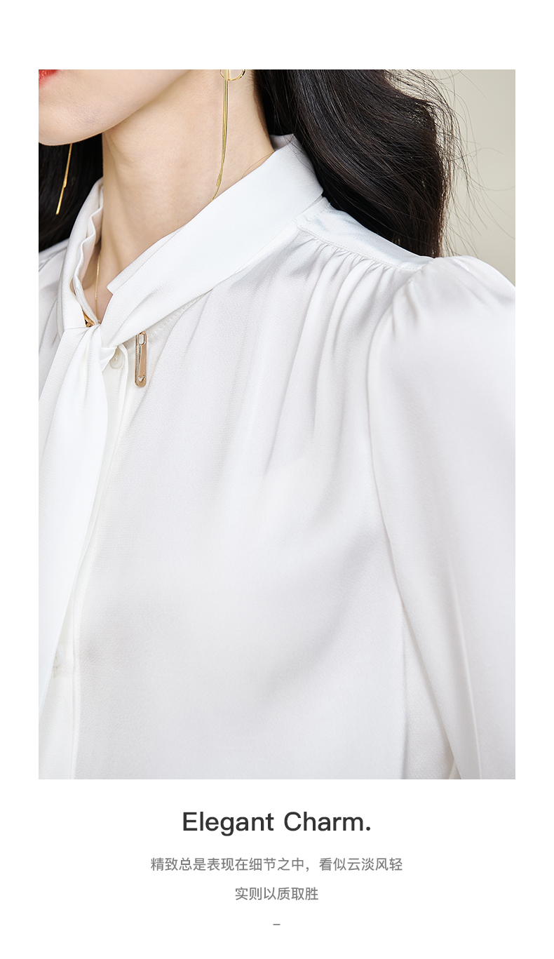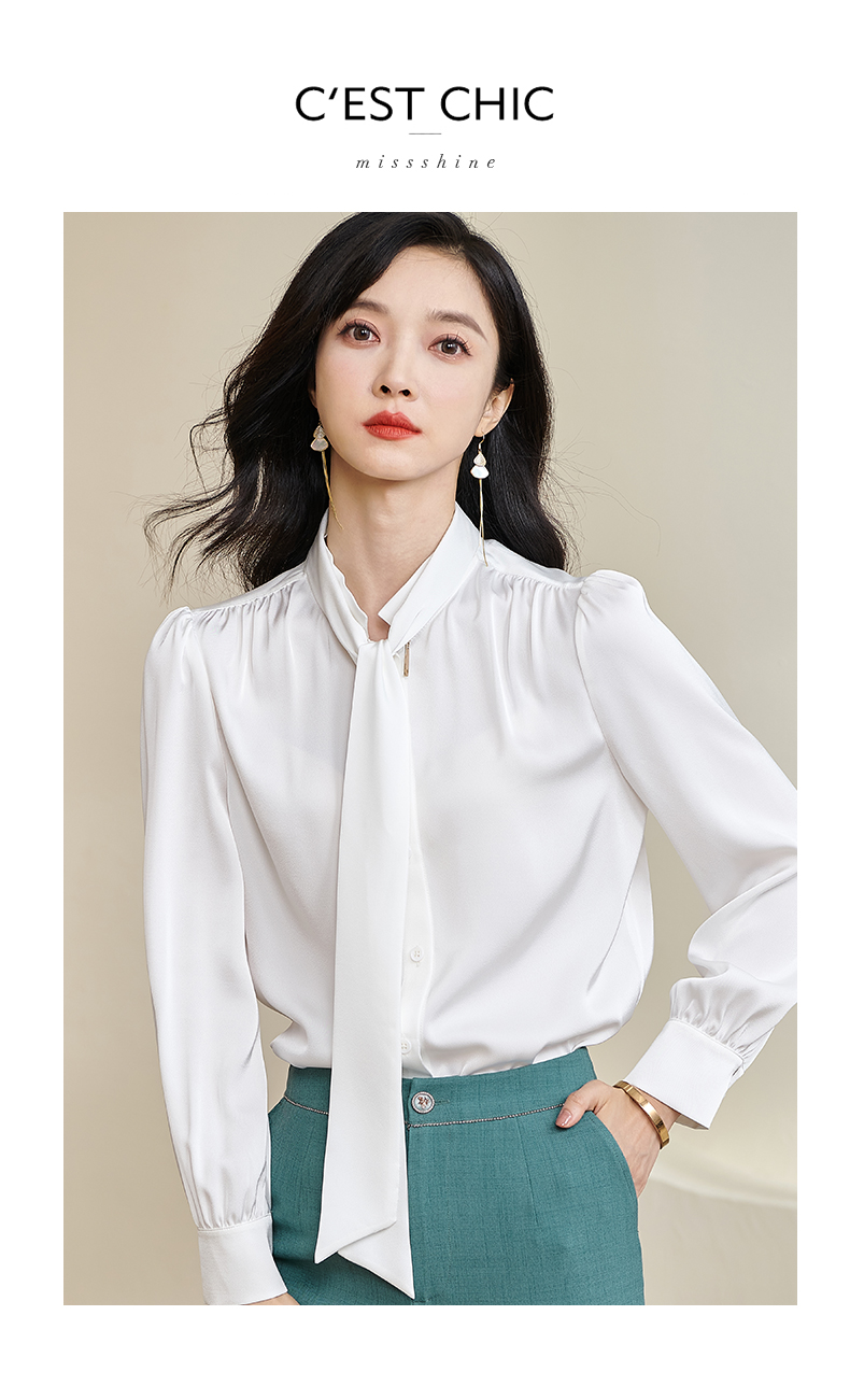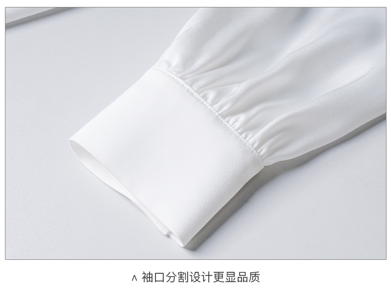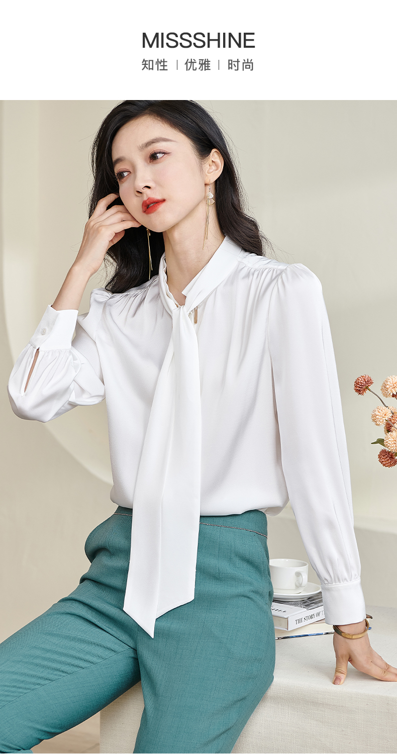 米思阳2024秋季新款简约气质白色缎面衬衫飘带领长袖宽松衬衣2675