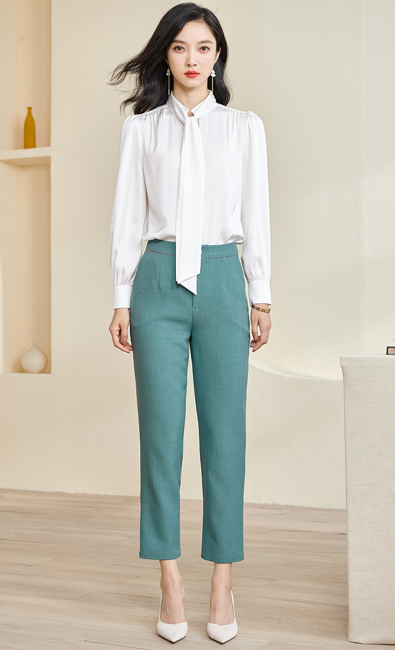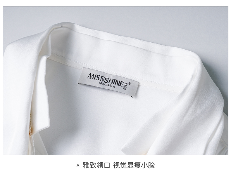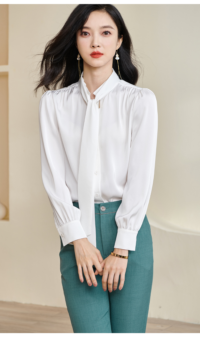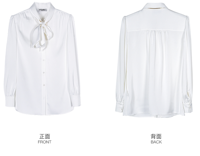 米思阳2024秋季新款简约气质白色缎面衬衫飘带领长袖宽松衬衣2675