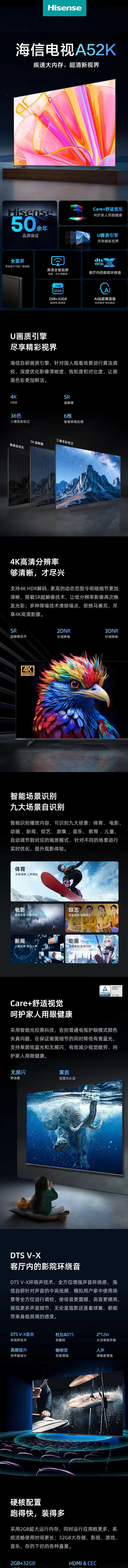 海信(912647)电视65A52K 4K超画质120Hz极速刷新2+32GB远场语音AI全面屏电视机 65英寸