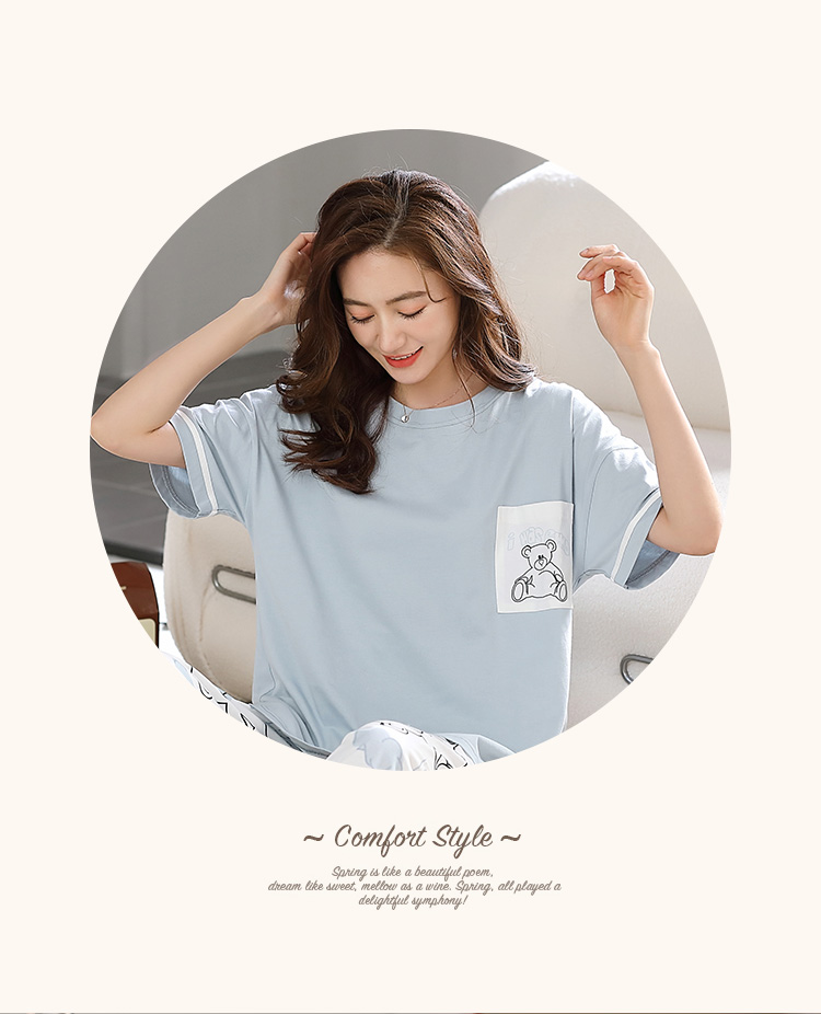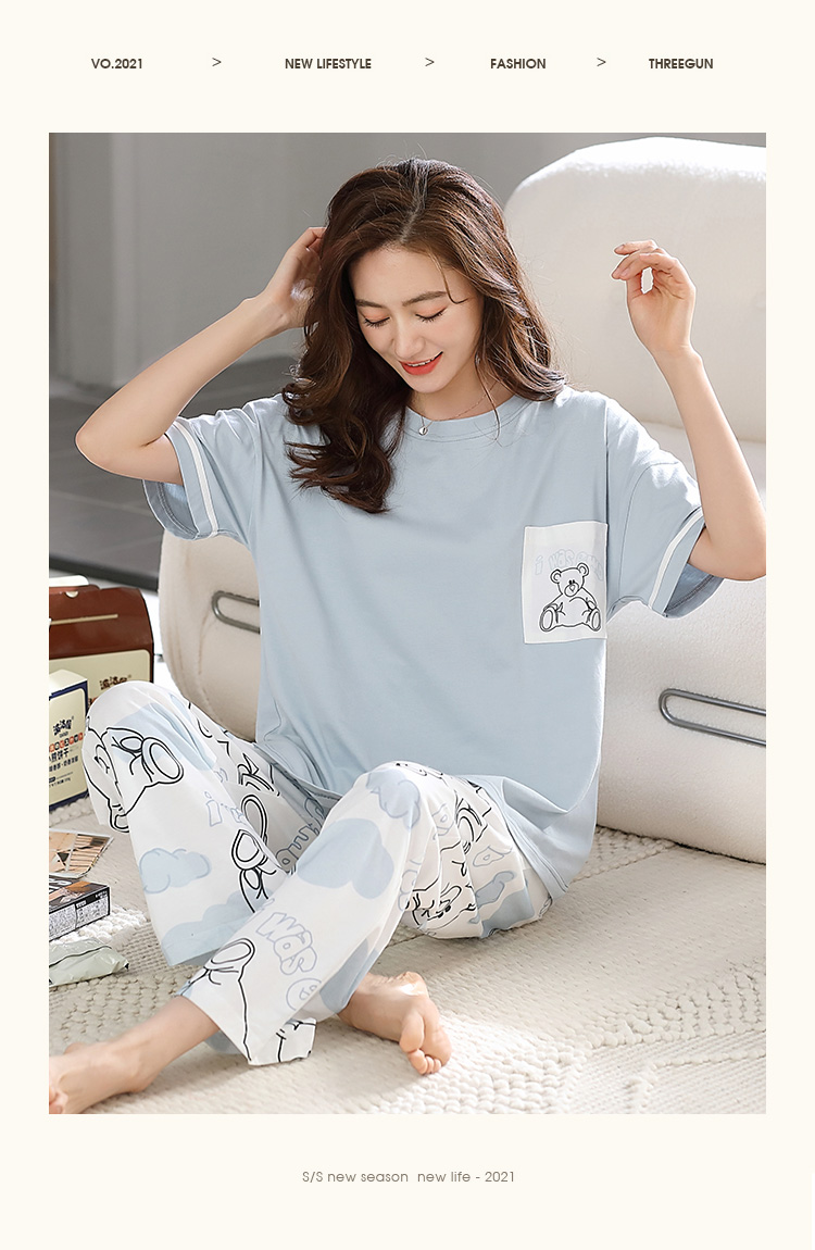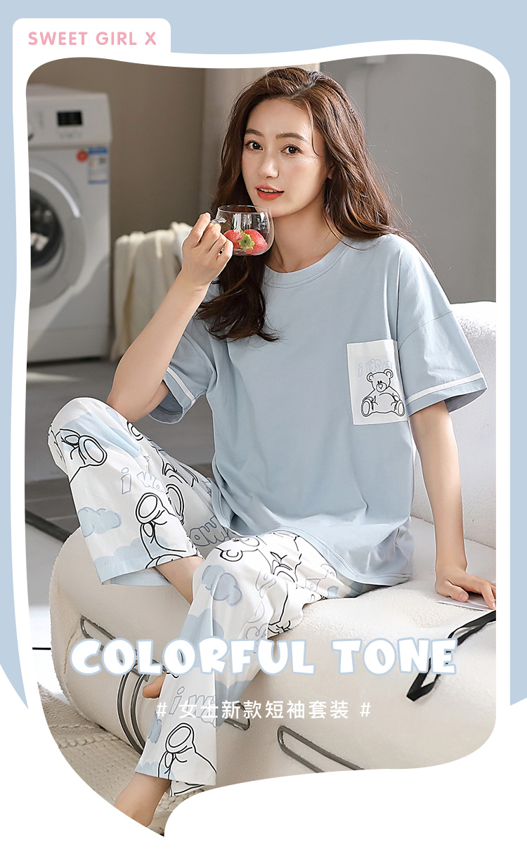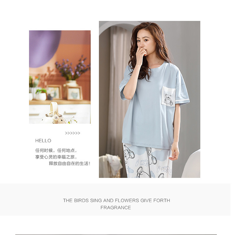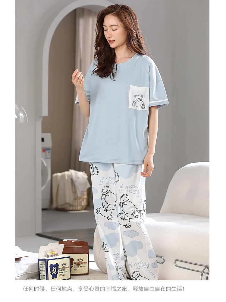 洁丽雅纯棉圆领女士家居服雾霾蓝短袖长裤套装可外穿睡衣女高颜值