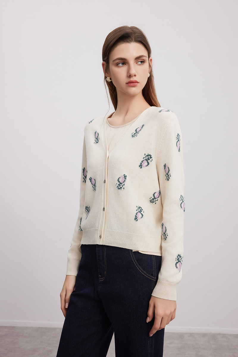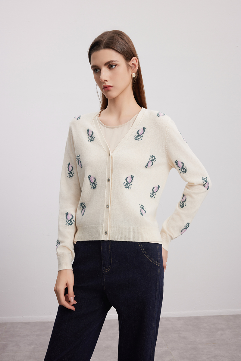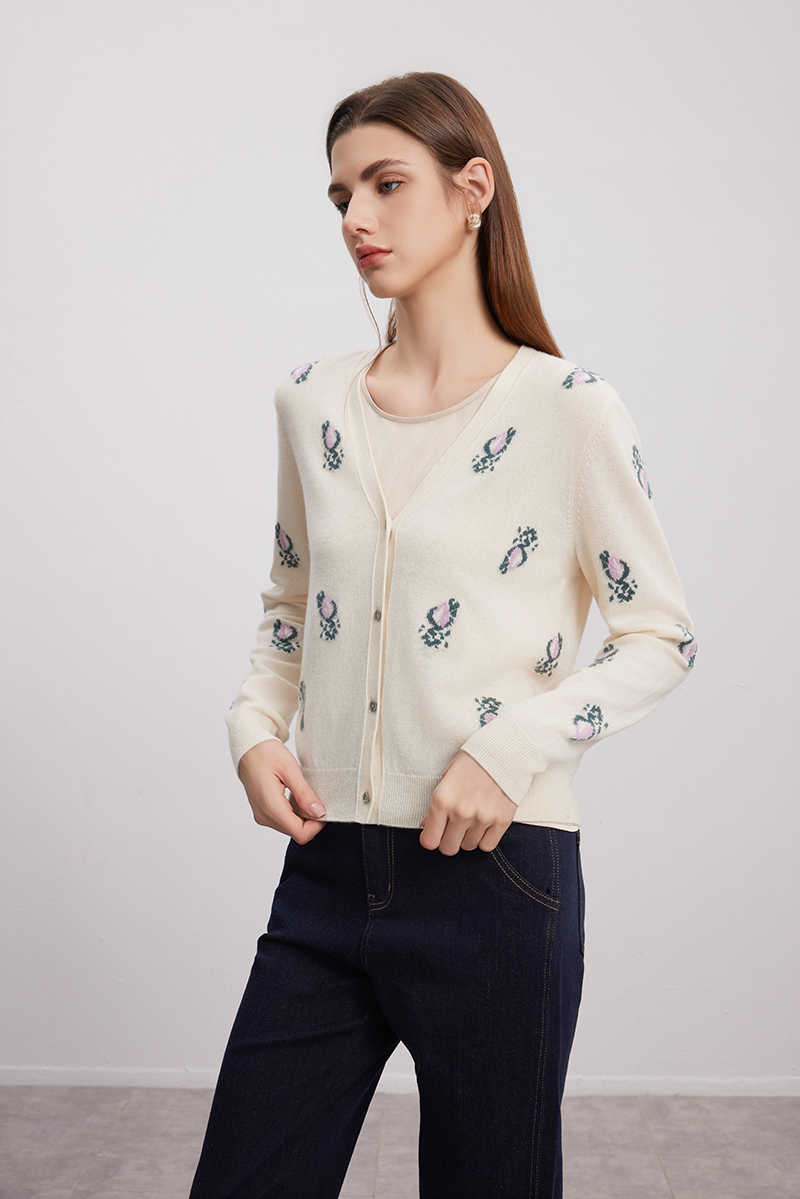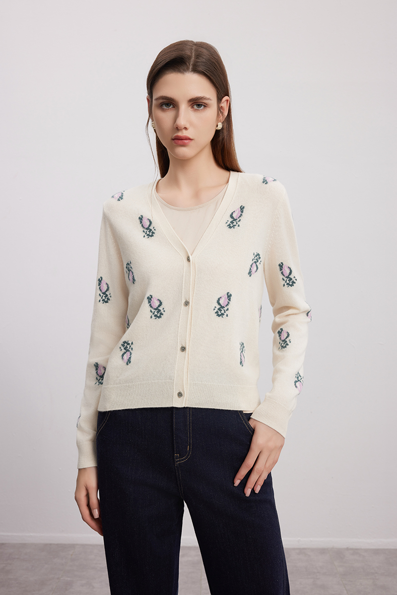 【V领印花针织开衫】羊绒世家秋冬新品女士100%山羊绒薄款开衫小外套