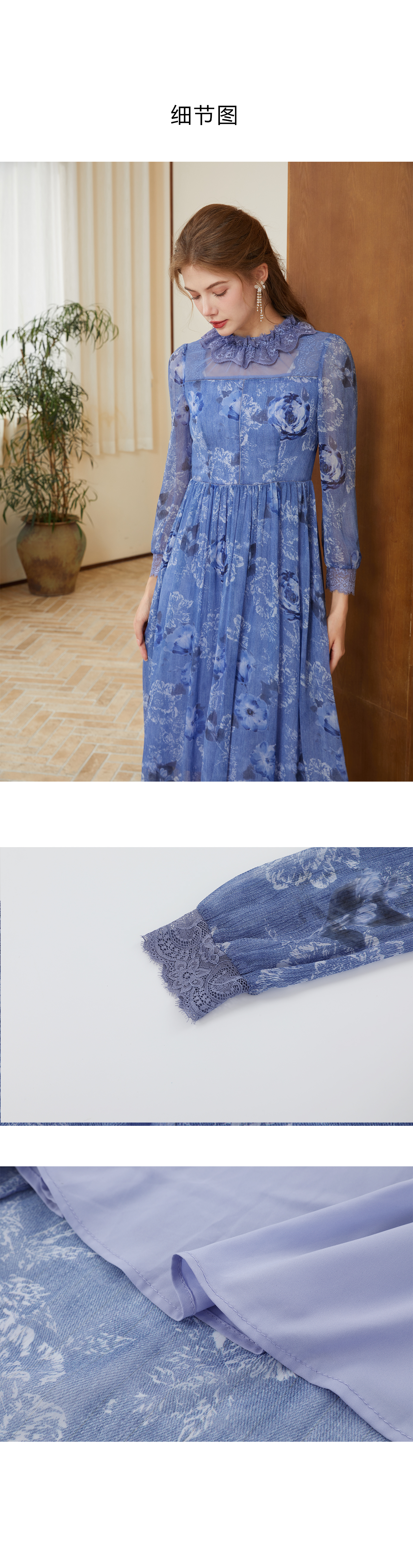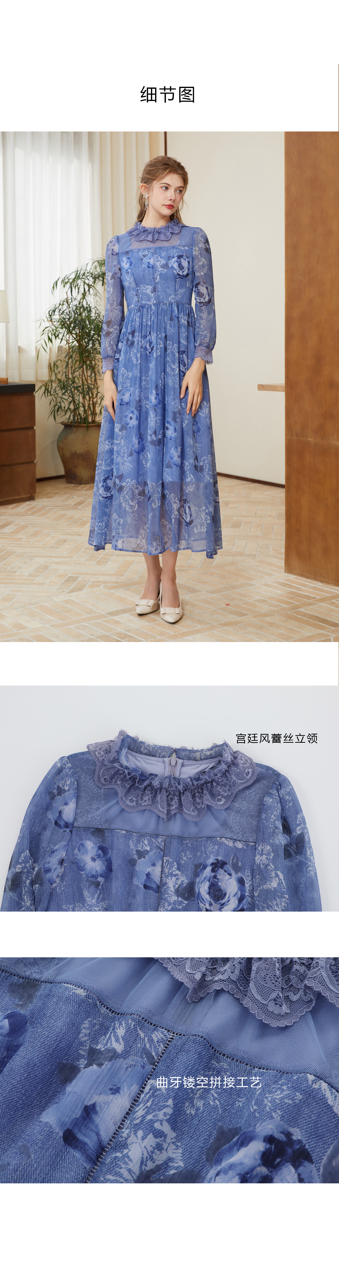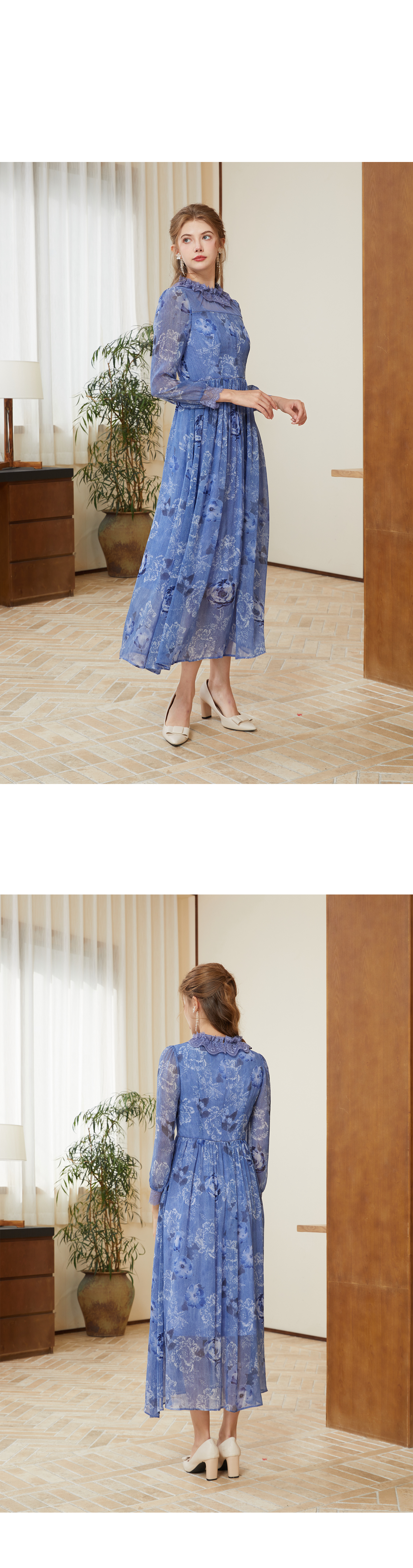 司歌印花收腰长袖雪纺连衣裙A921161X