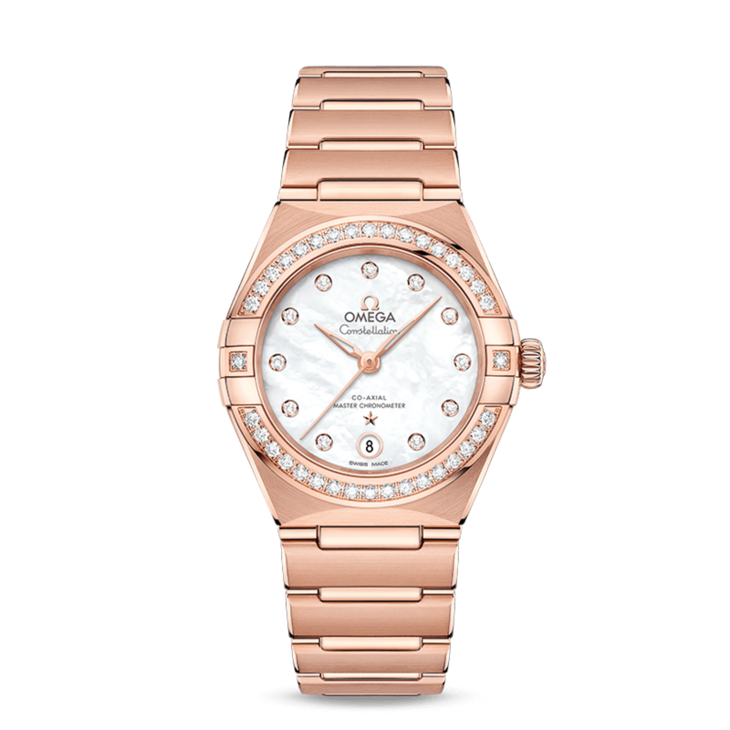镜面材质 | 蓝宝石水晶玻璃 | 表盘 | Sedna® 18K金腕表,表圈铺镶钻石 珍珠母贝表盘饰有钻石小时刻度,6点钟位置设有日历窗口。 表链、指针、欧米茄品牌标识、星座徽标以及钻石托槽亦以Sedna® 18K金打造而成。 透底 |