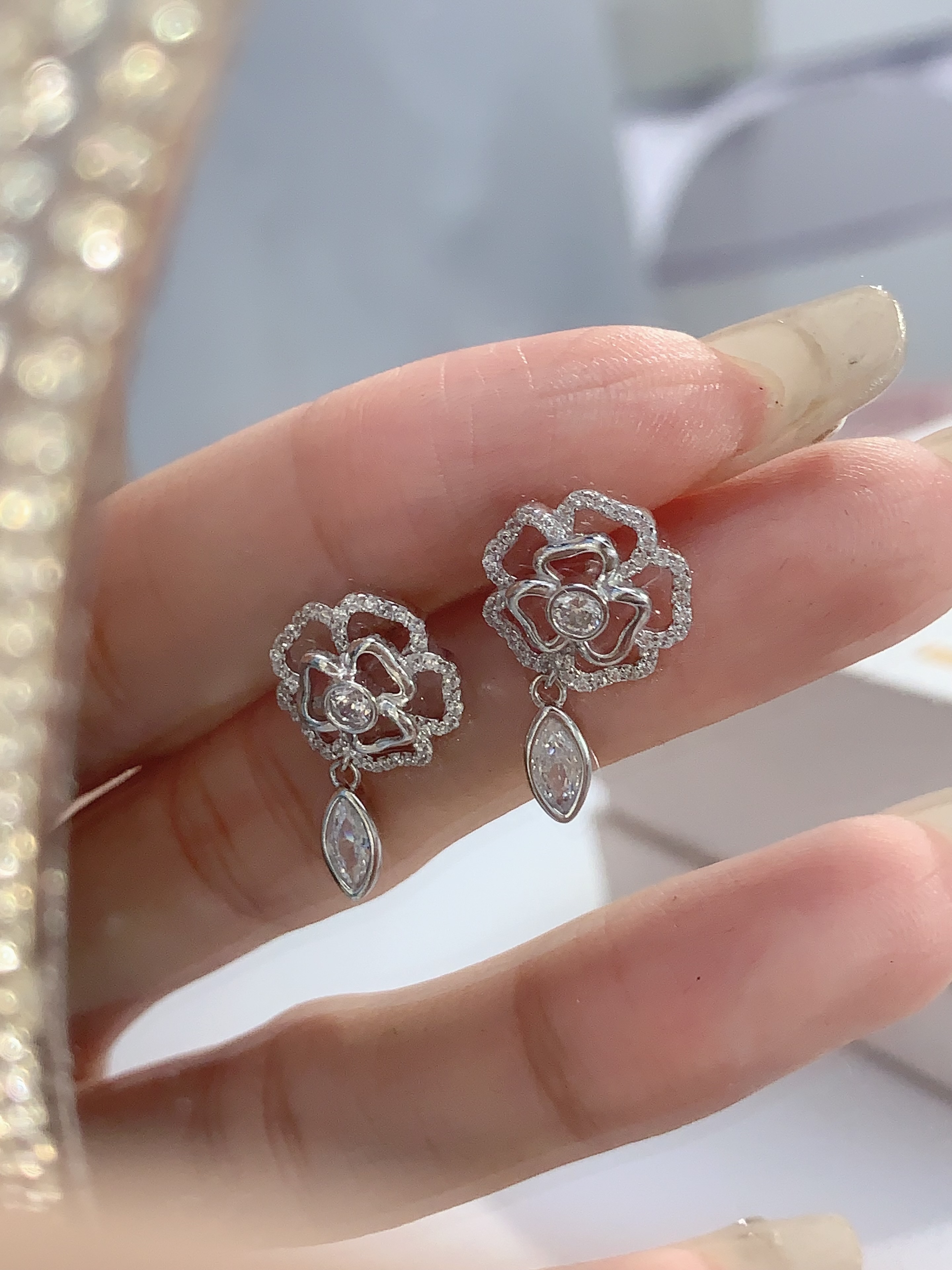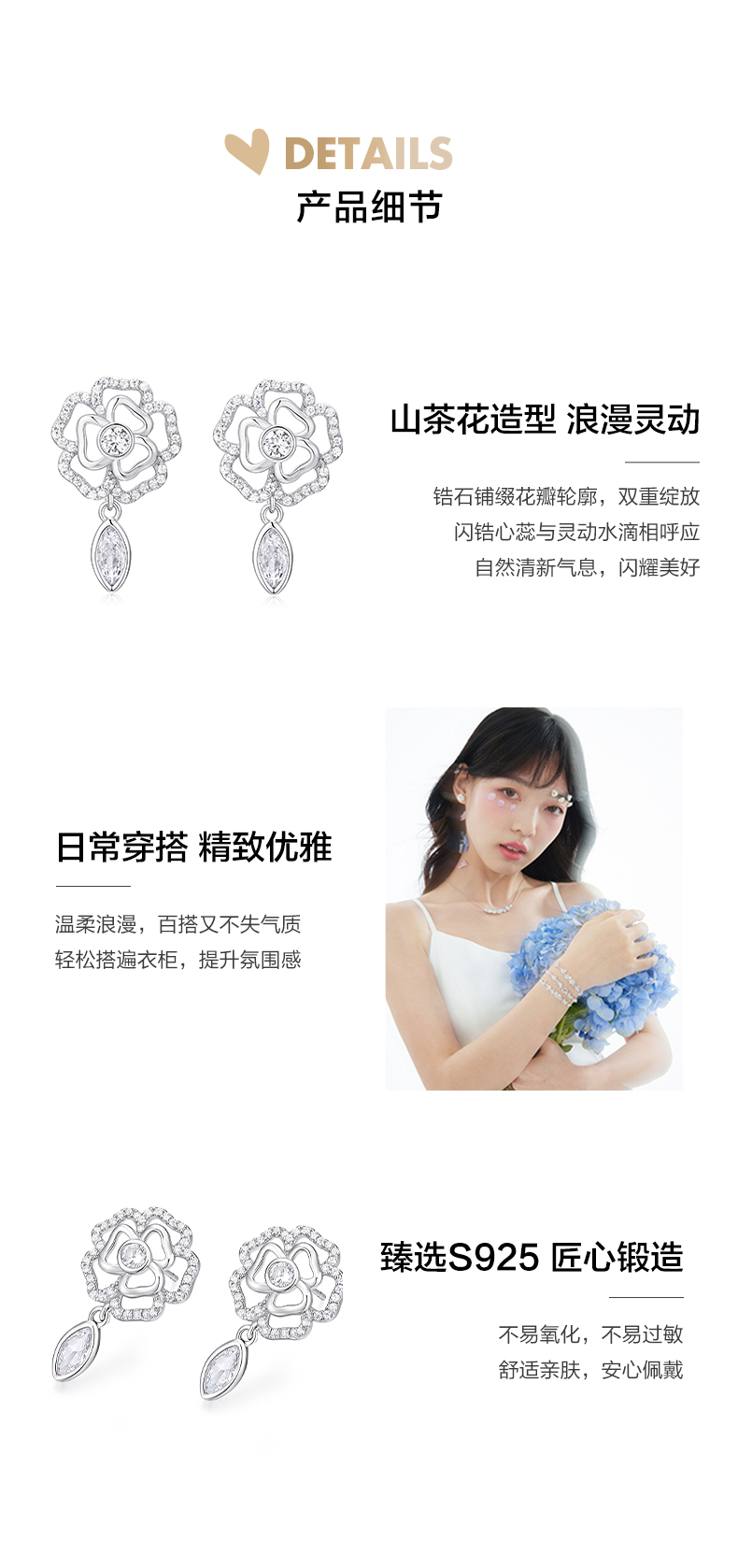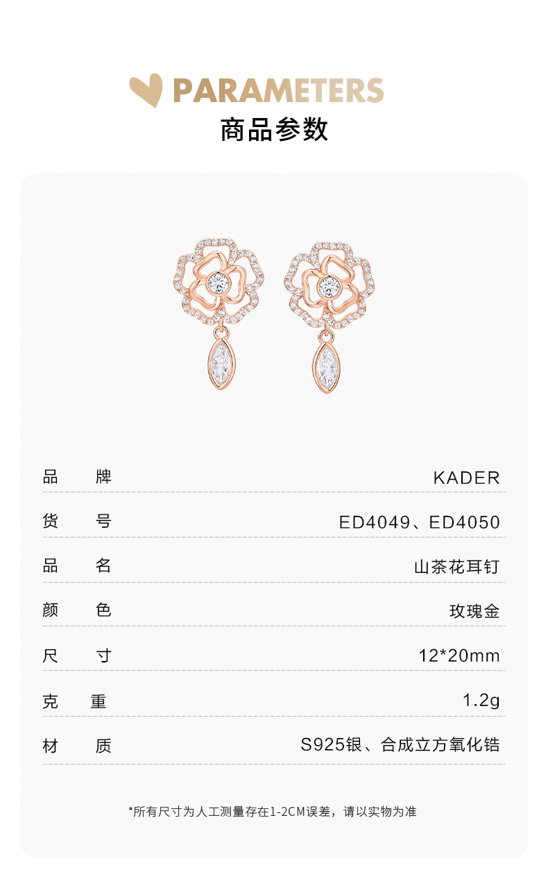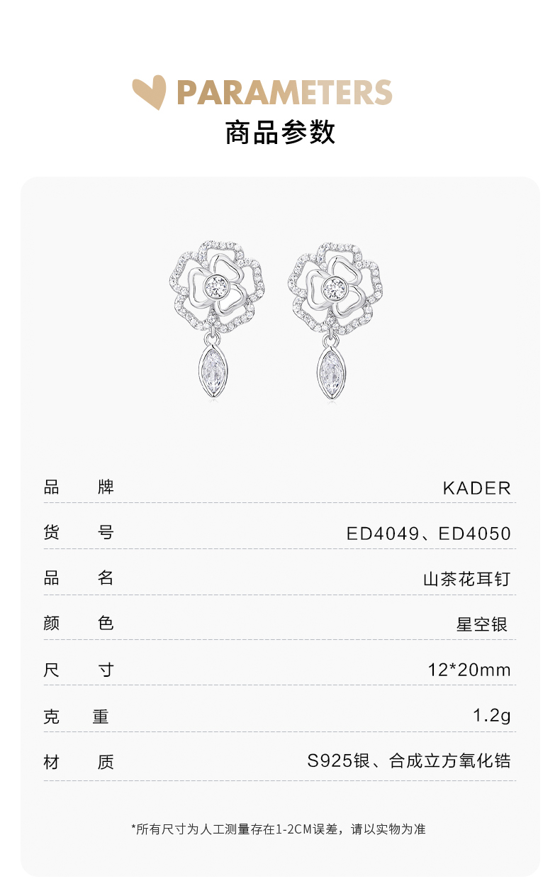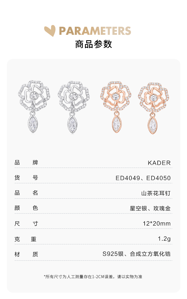 KADER卡蒂罗 山茶花耳钉 星空银 925银清新灵动花朵造型设计冬日闪耀耳饰 浪漫优雅精致闪耀配饰 礼盒装