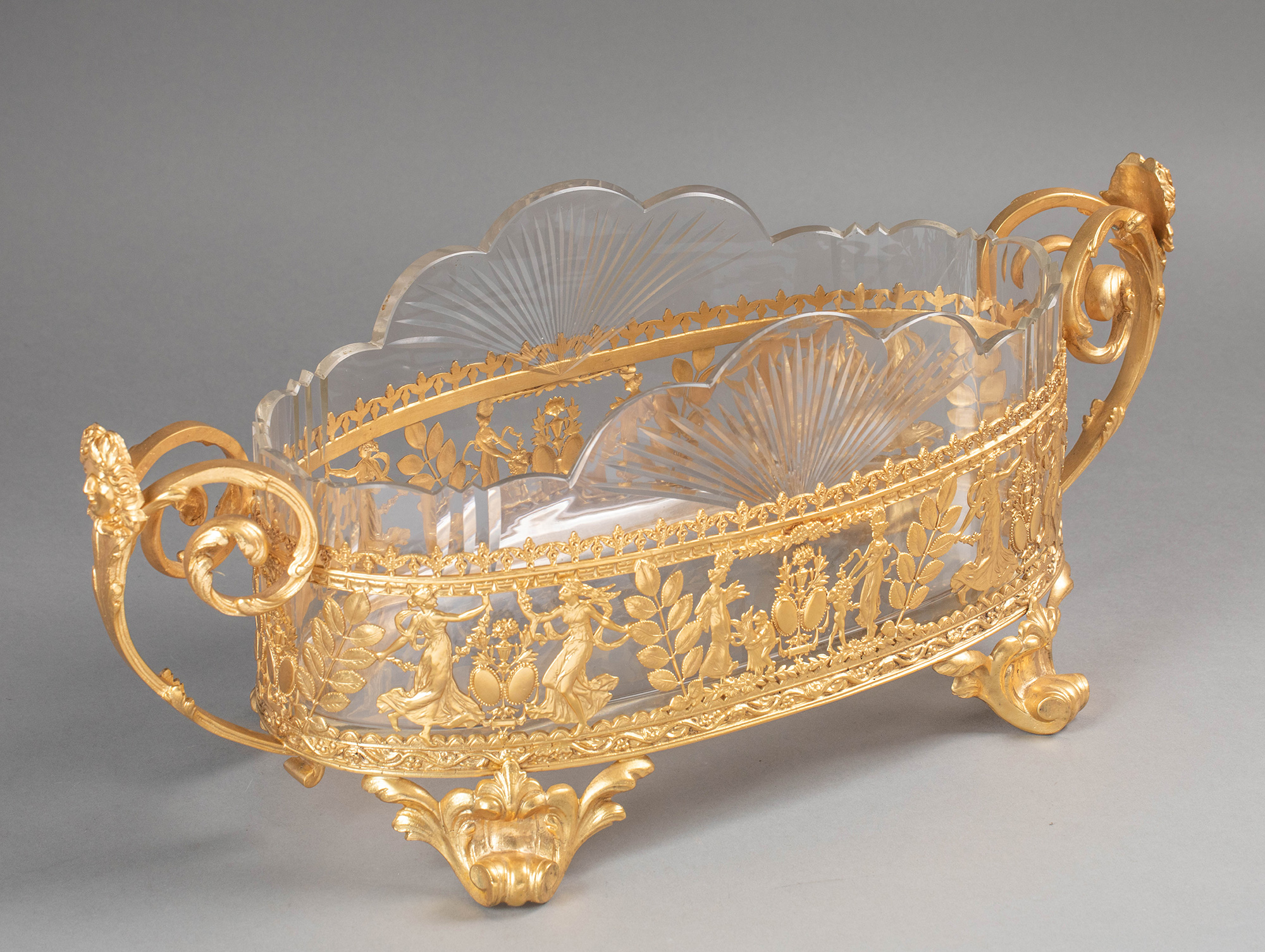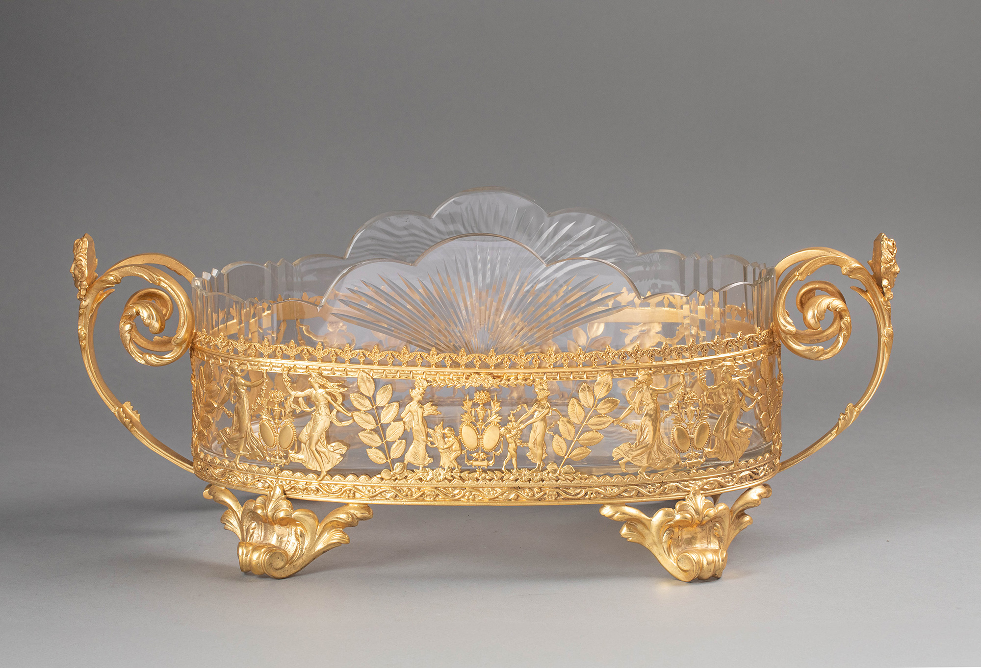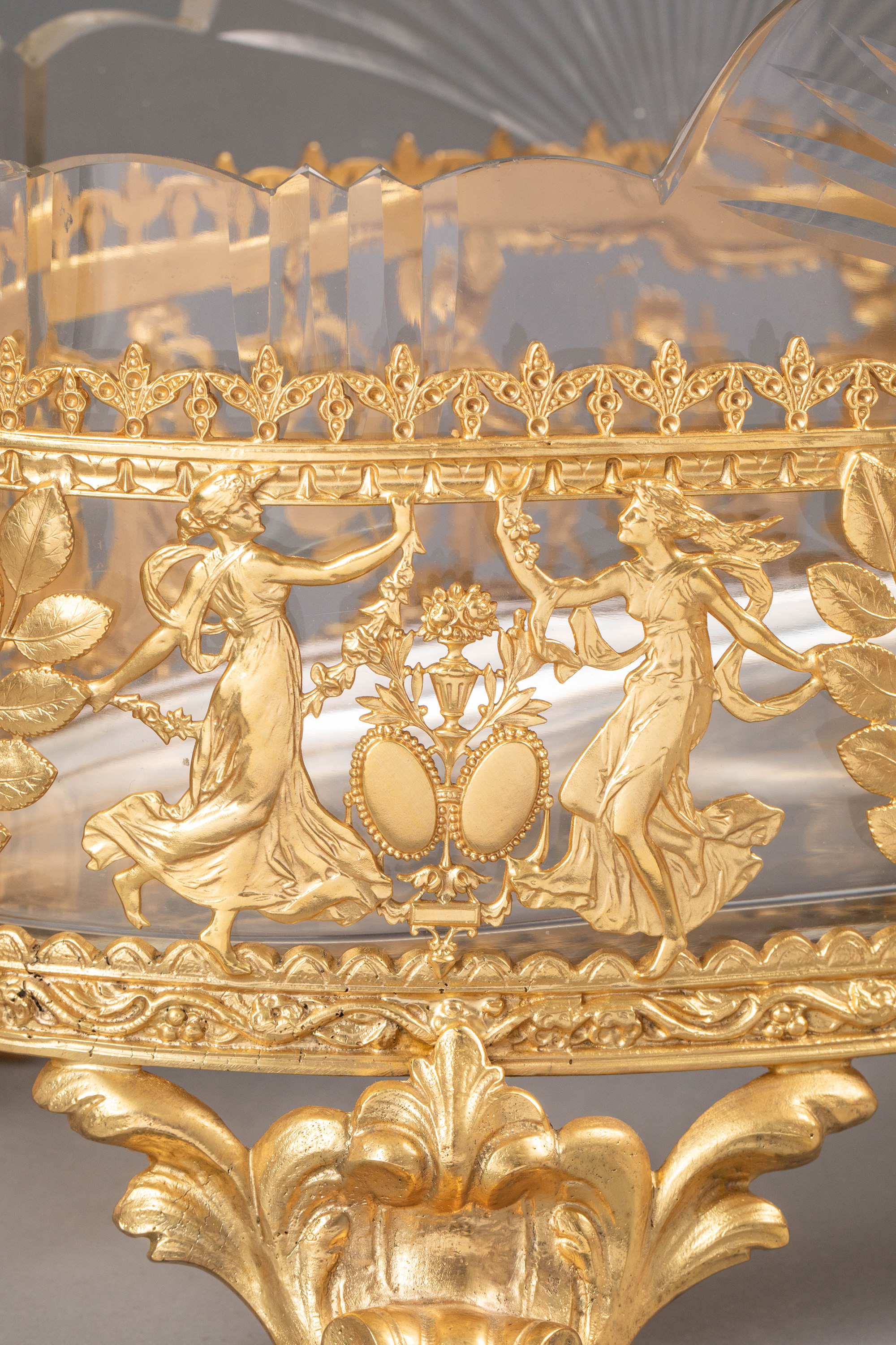 19世纪法国出品女神齐舞主题铜鎏金精雕装饰花瓣形水晶内里卷叶纹双耳花果樽