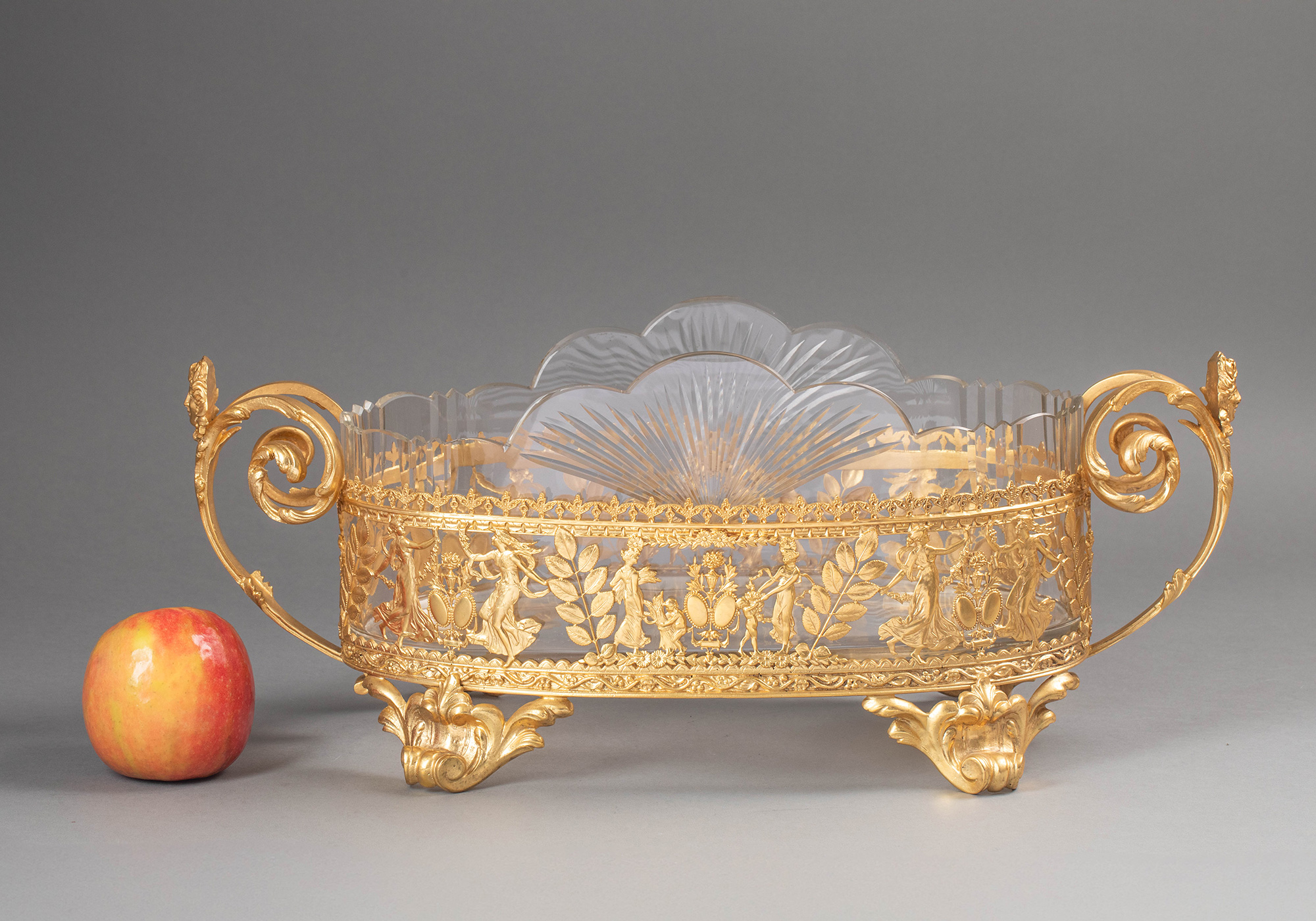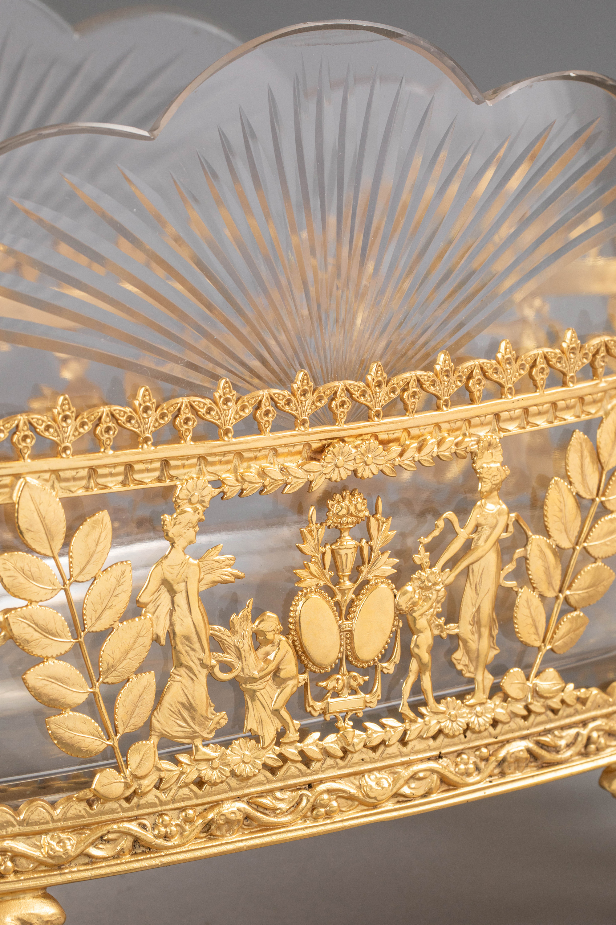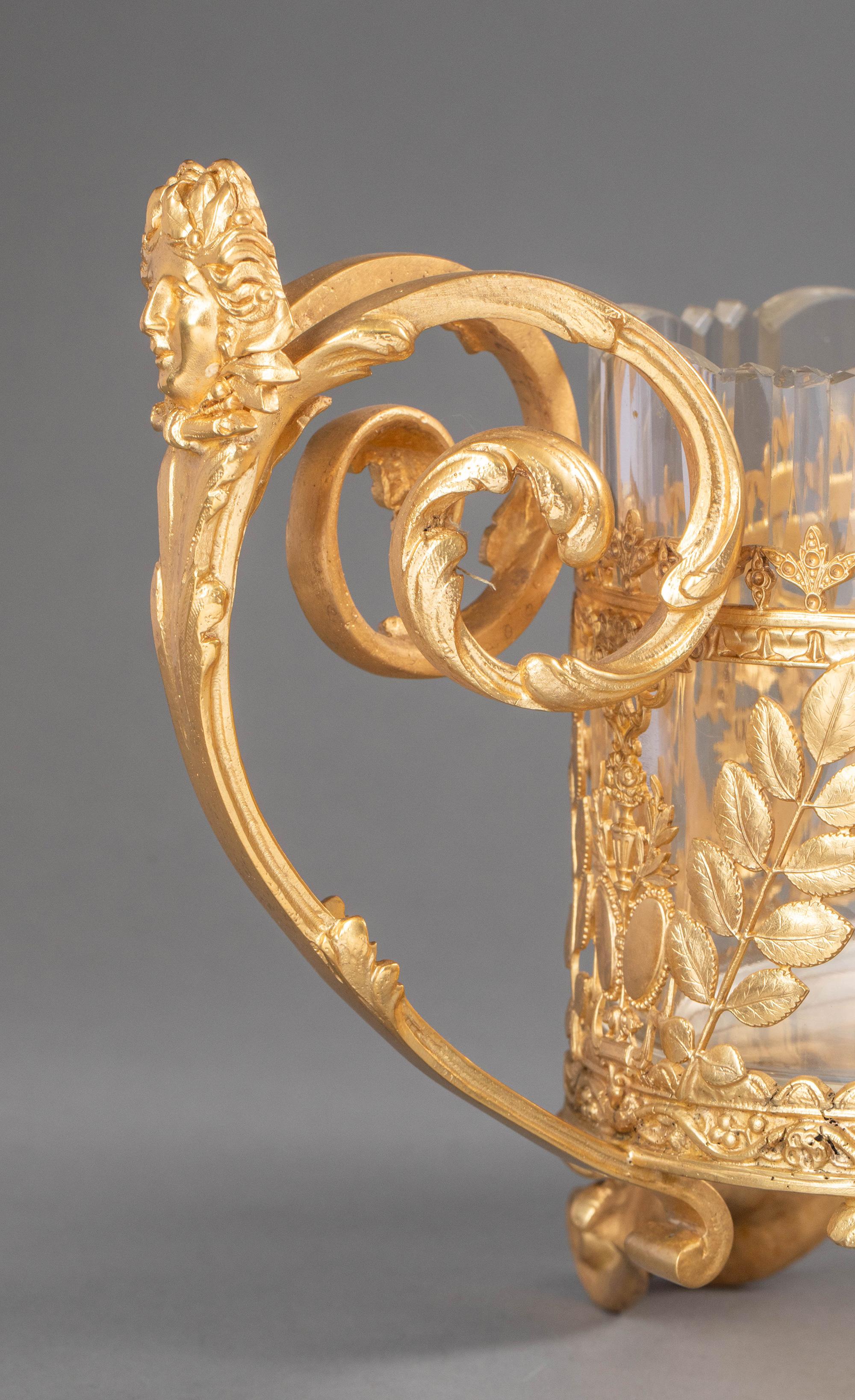19世纪法国出品女神齐舞主题铜鎏金精雕装饰花瓣形水晶内里卷叶纹双耳花果樽