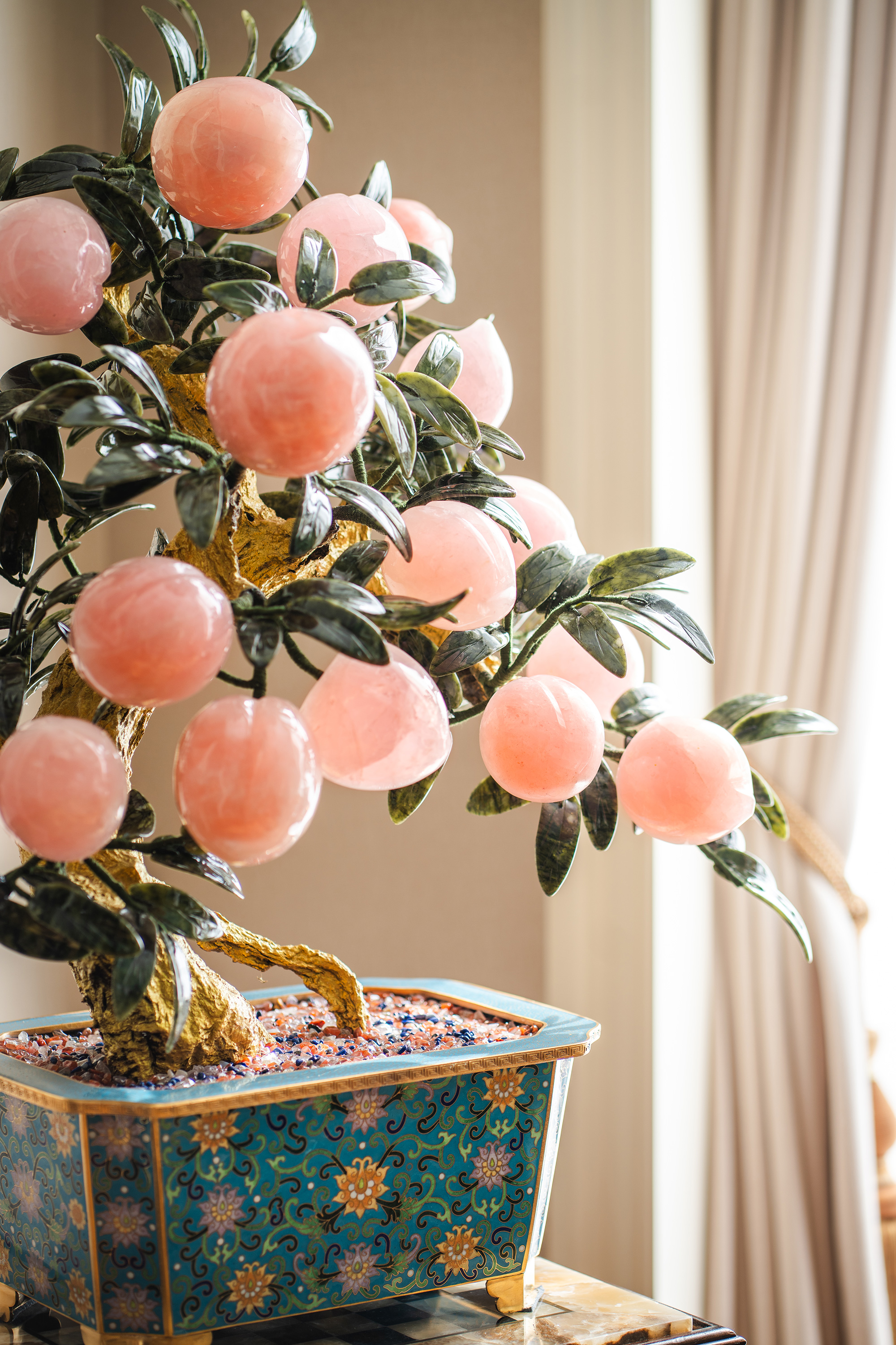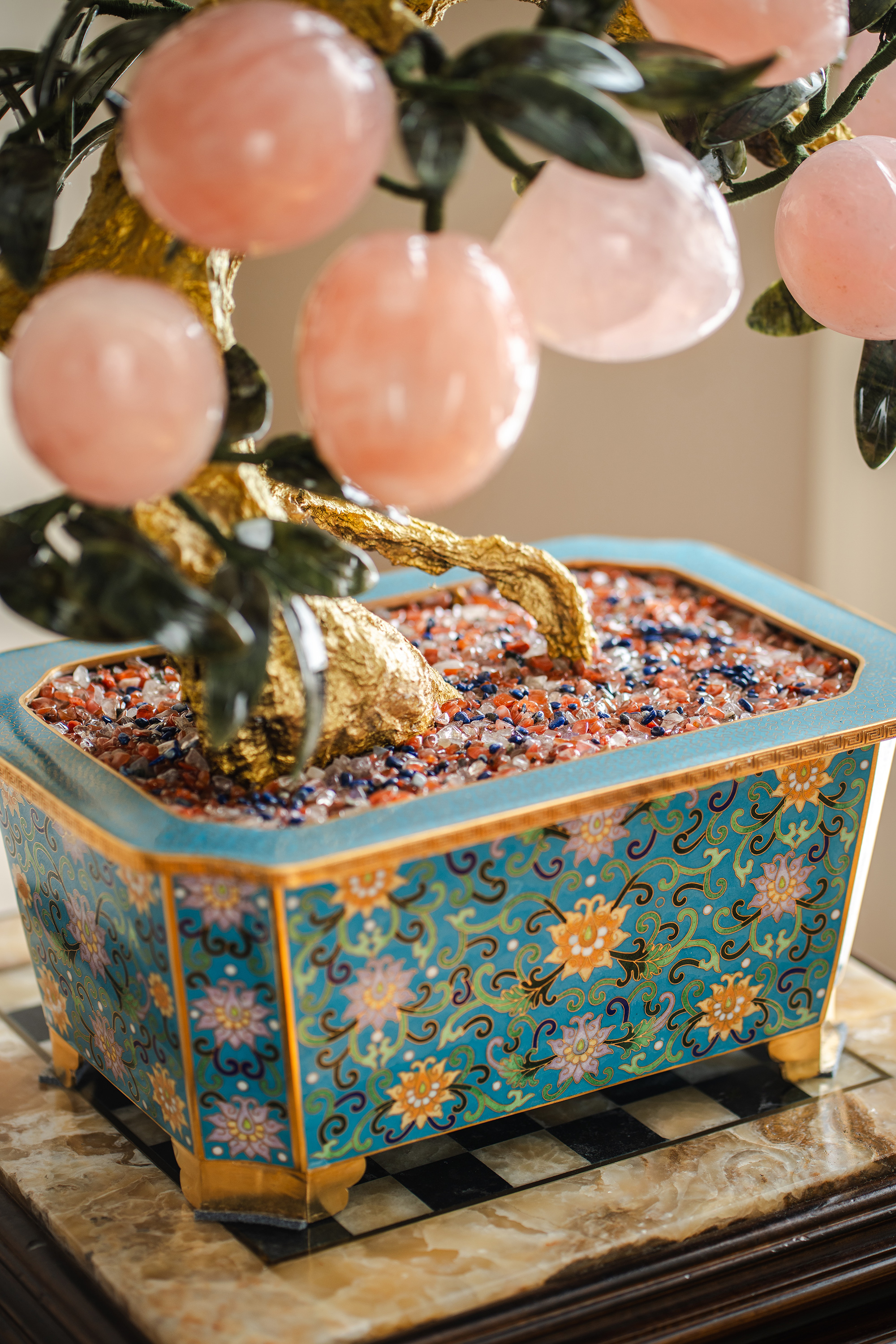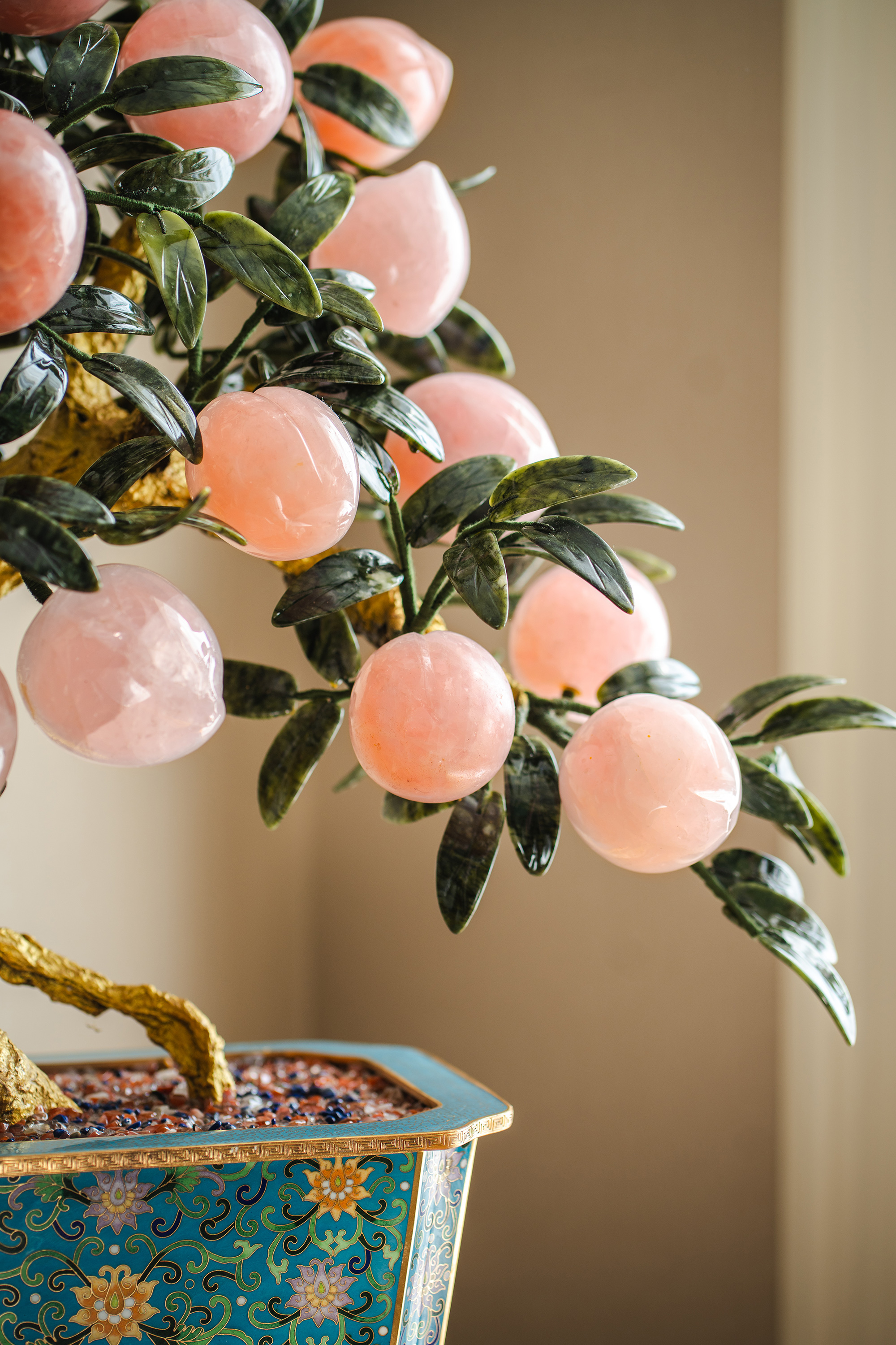 中国出品宝相花纹景泰蓝盆装饰「粉晶仙桃」珍宝像生盆景一对