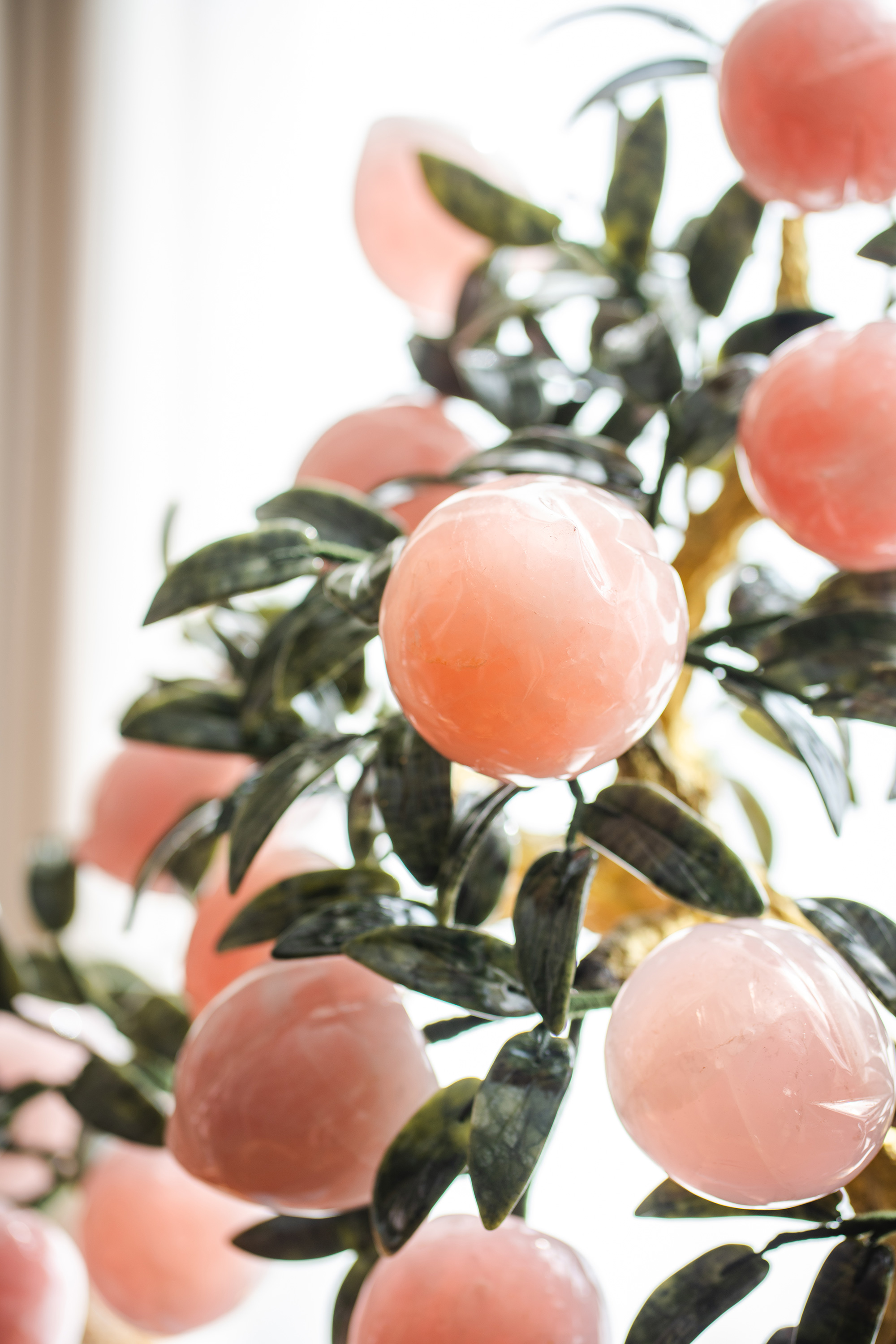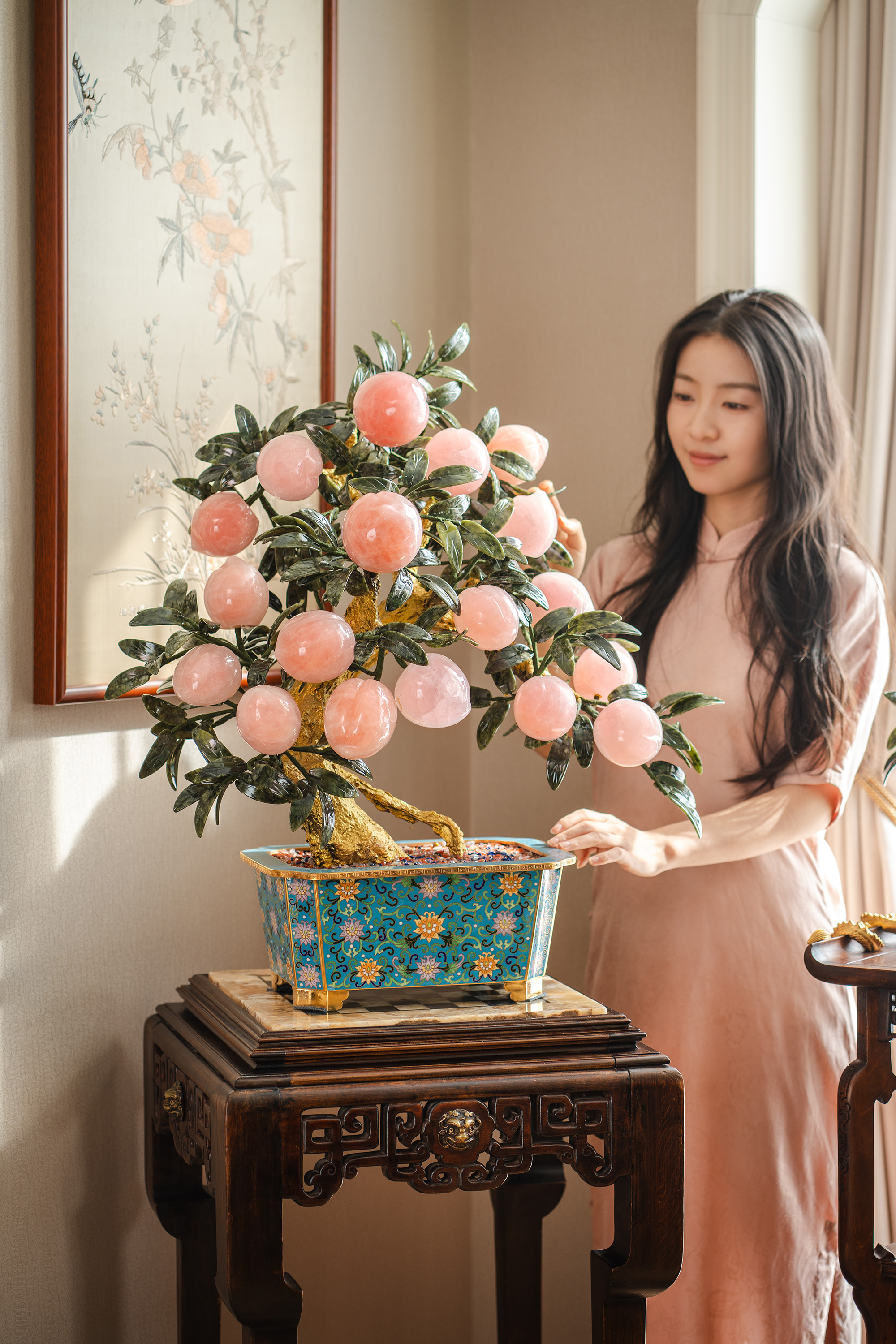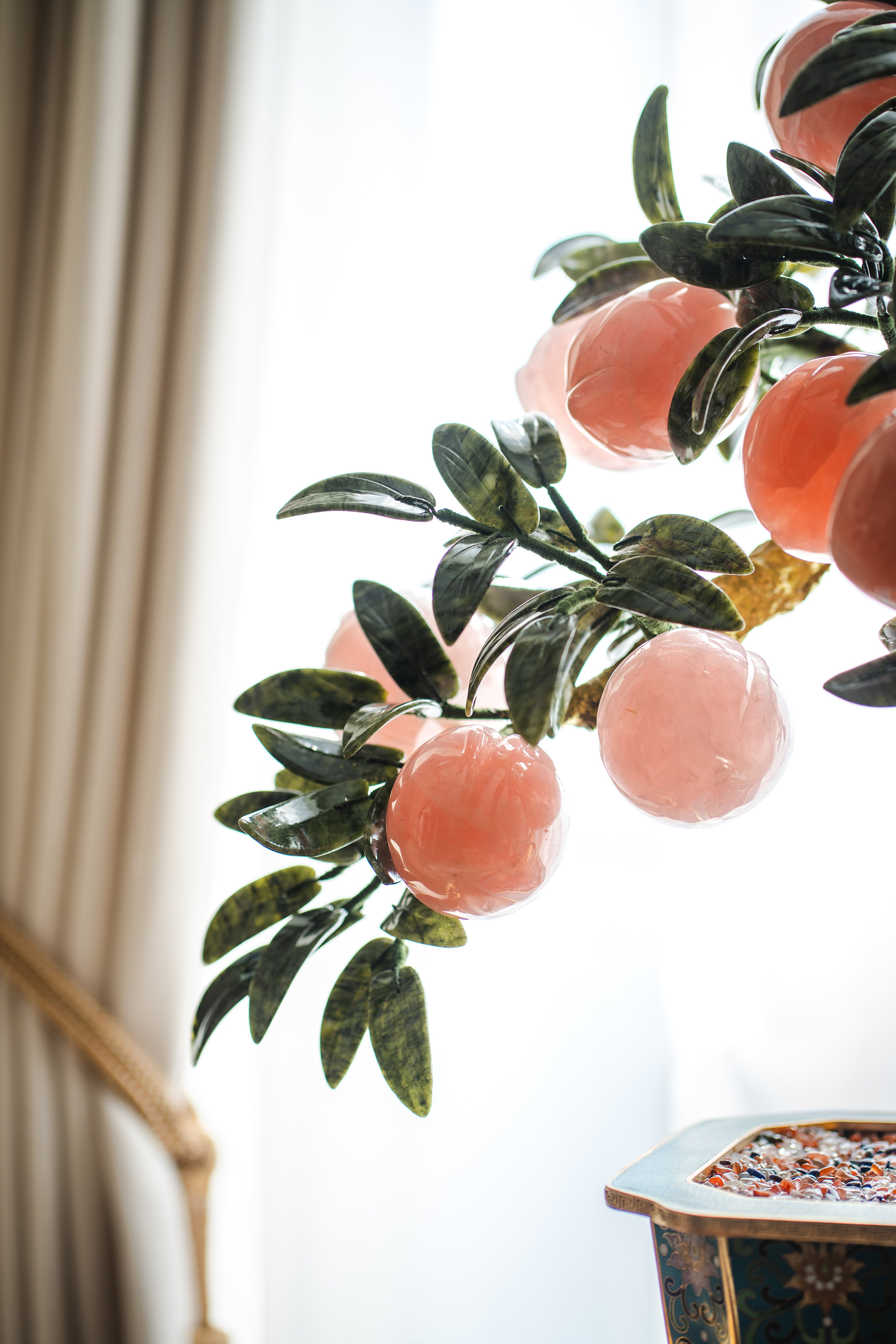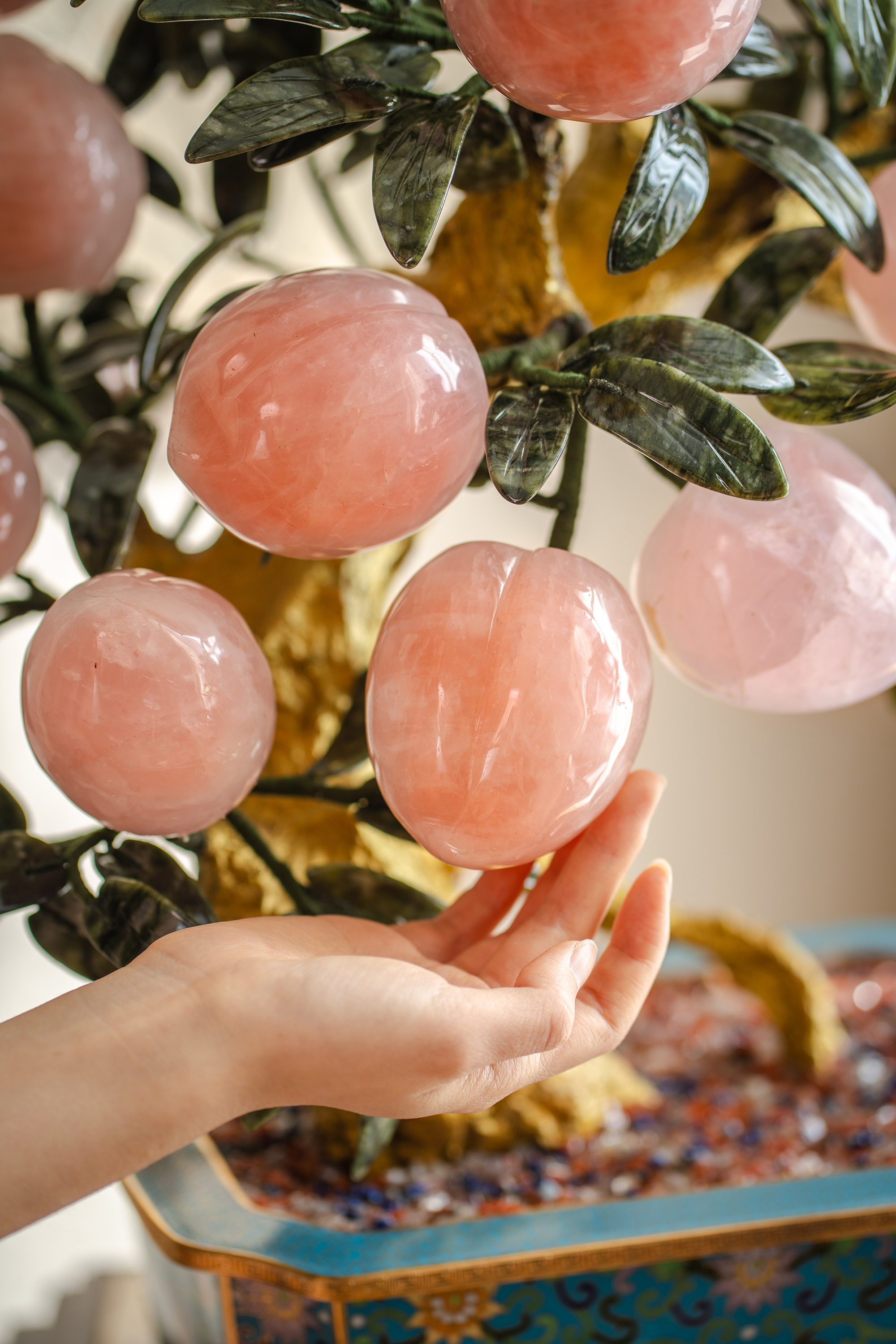 中国出品宝相花纹景泰蓝盆装饰「粉晶仙桃」珍宝像生盆景一对