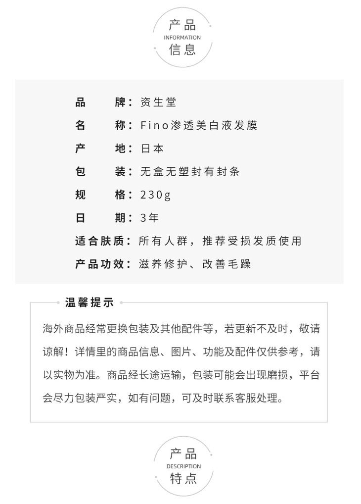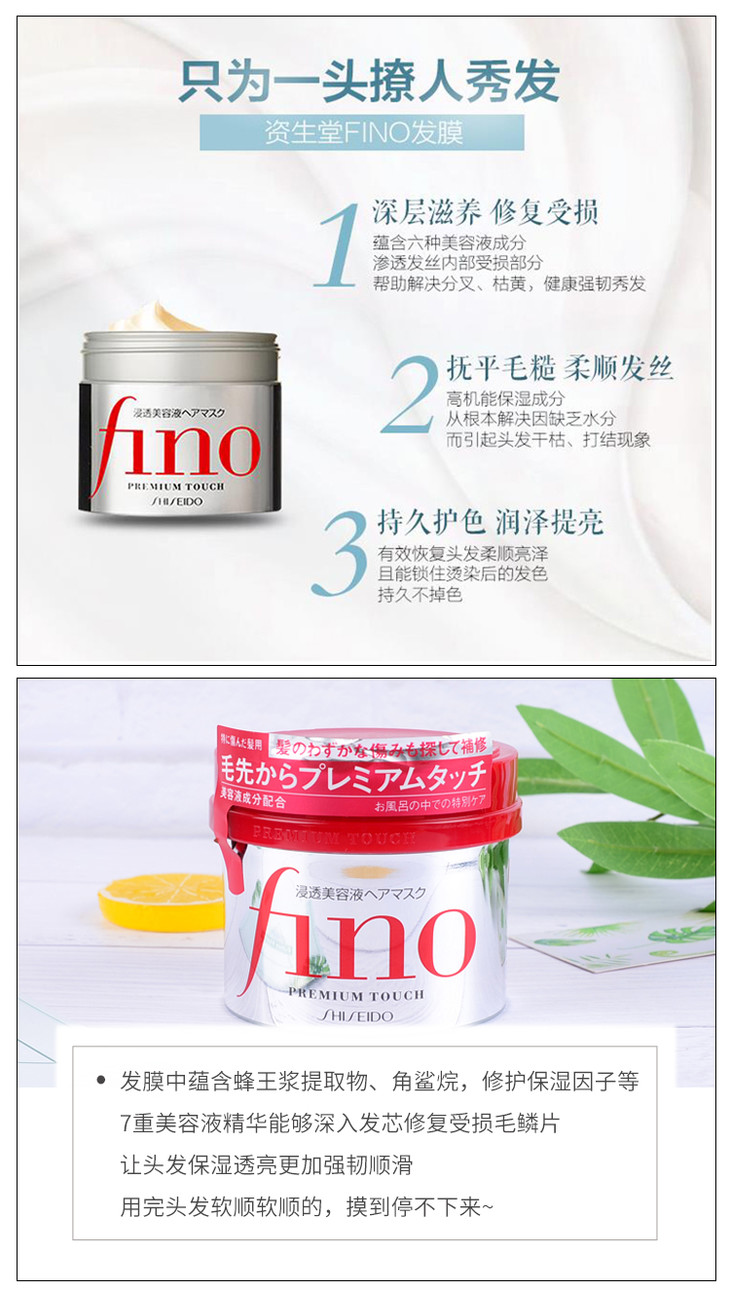 资生堂Fino/fino发膜 烫染修复干枯开叉滋润渗透倒模改善毛躁补水护发素 230g SHISEIDO/shiseido