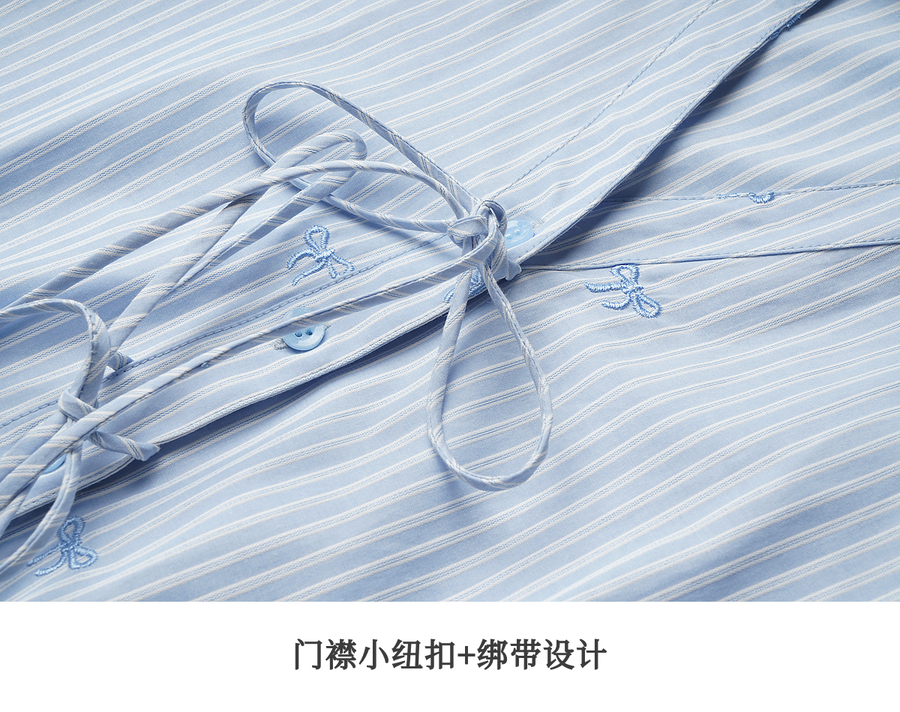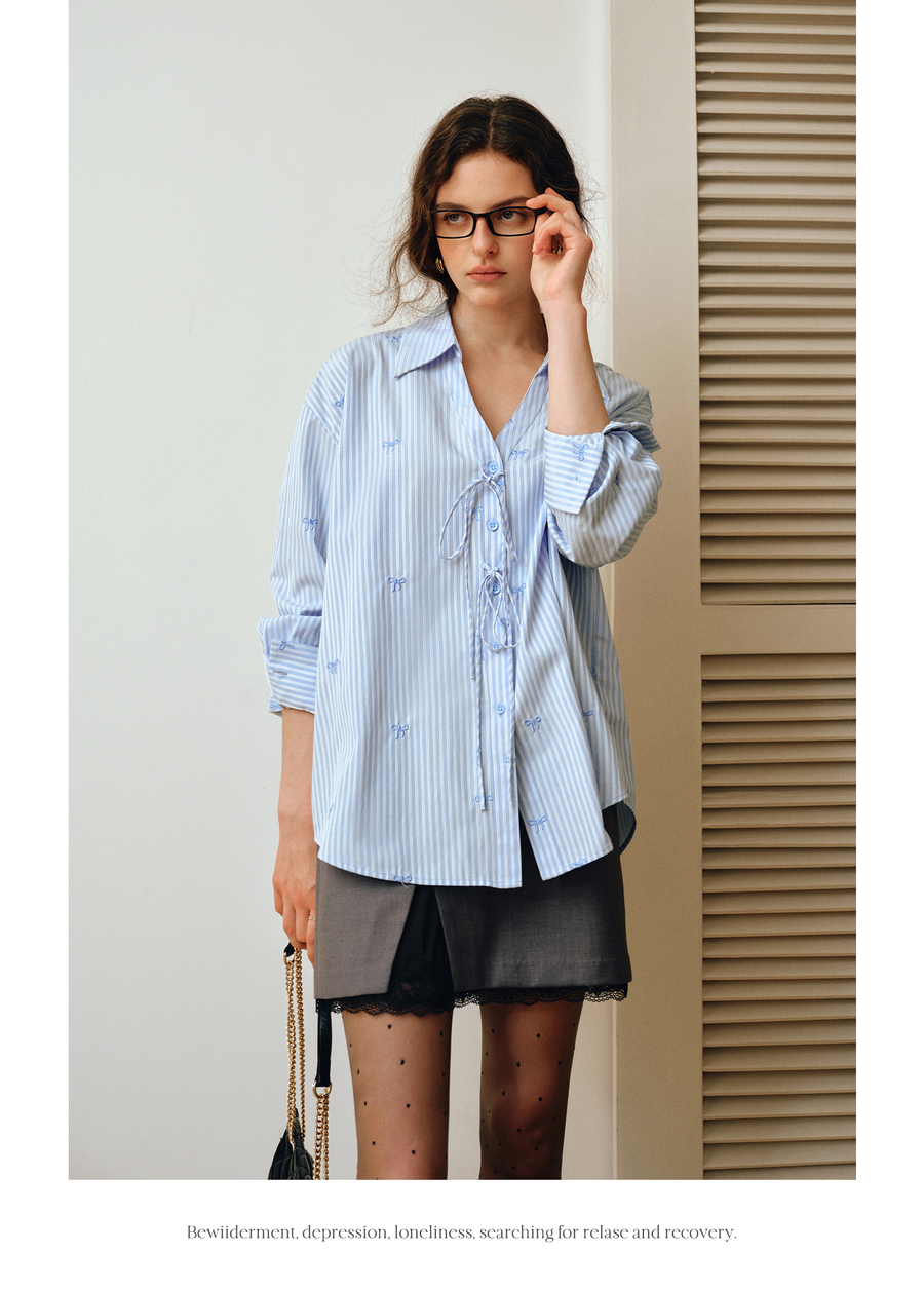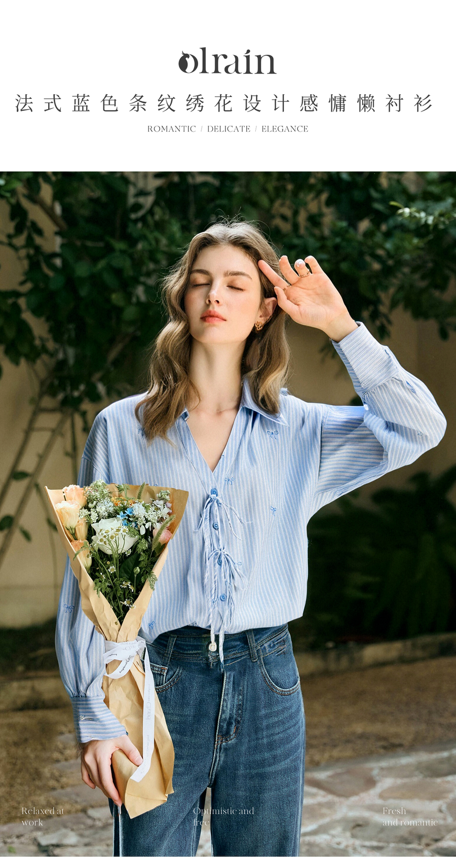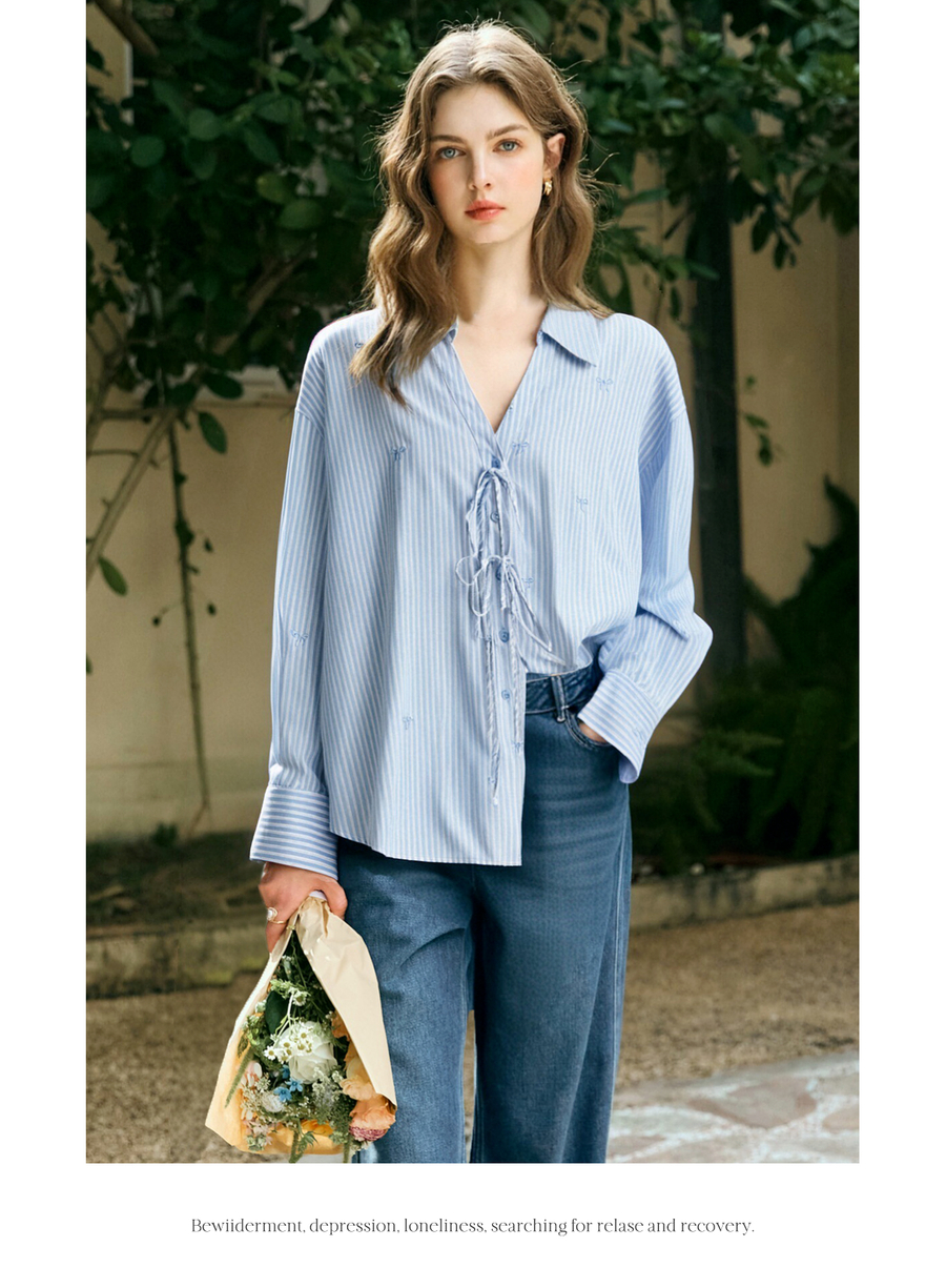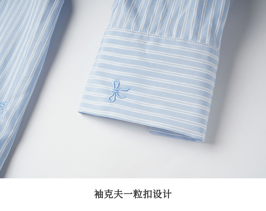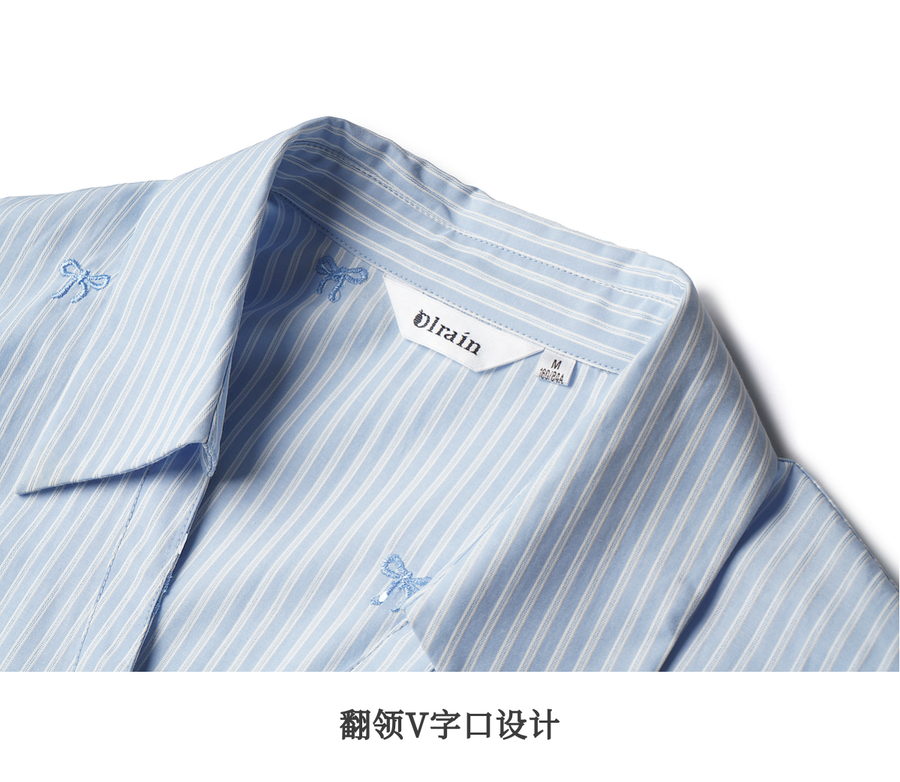 OLrain欧芮儿2025新款女秋季法式蓝色条纹绣花设计感慵懒长袖衬衫