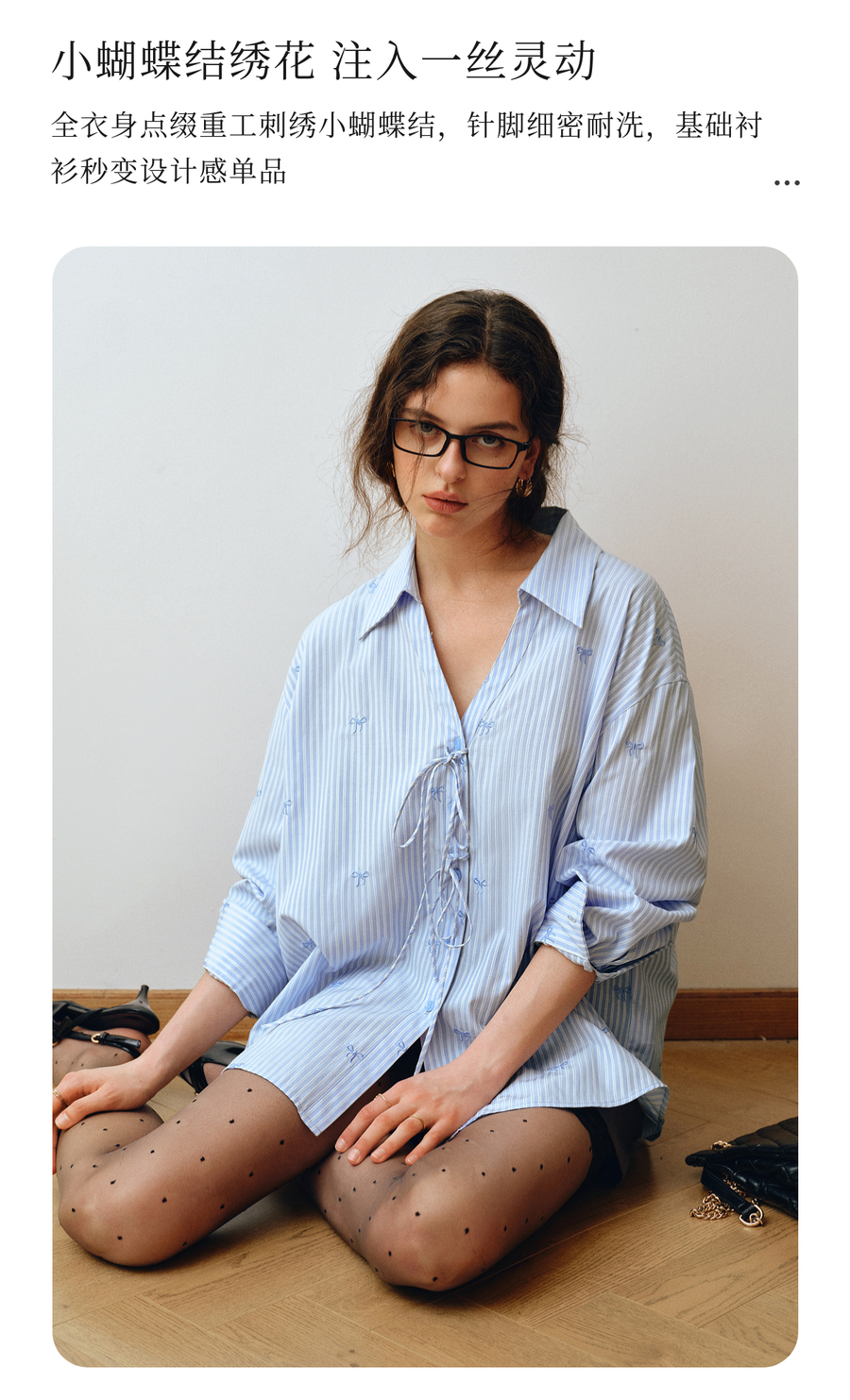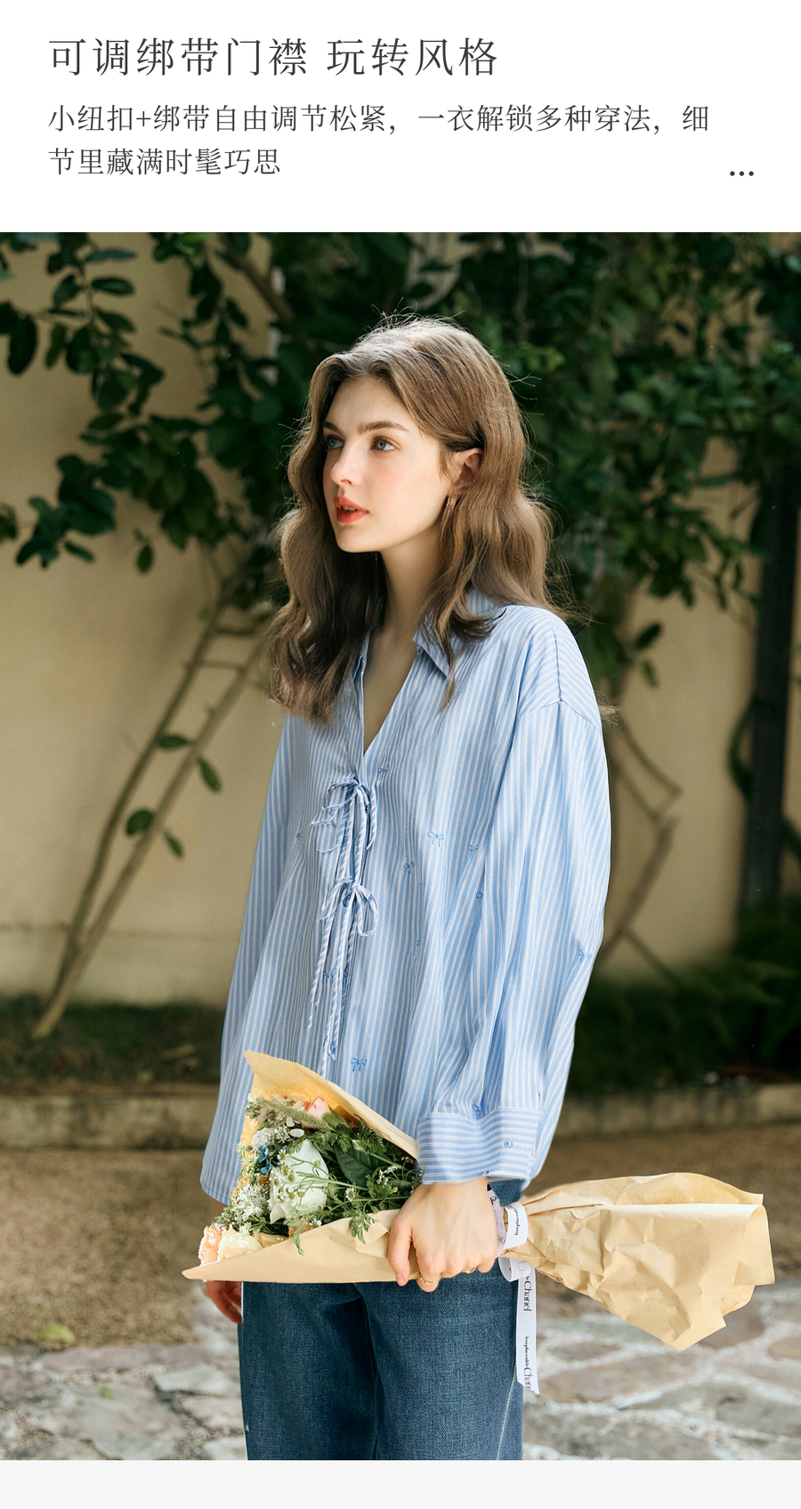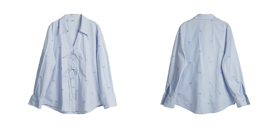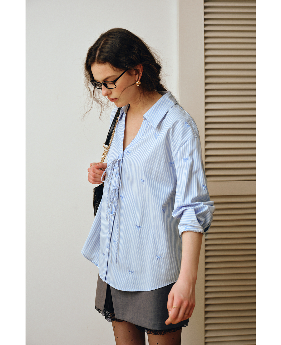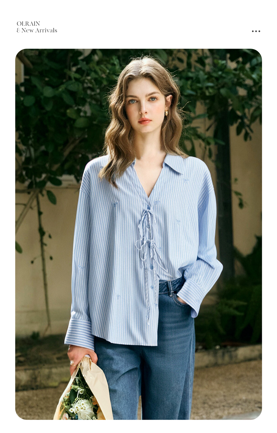 OLrain欧芮儿2025新款女秋季法式蓝色条纹绣花设计感慵懒长袖衬衫