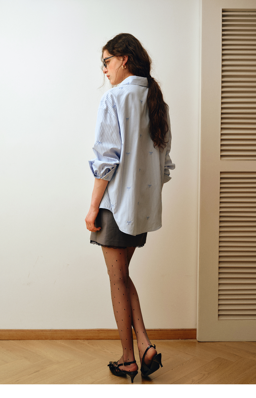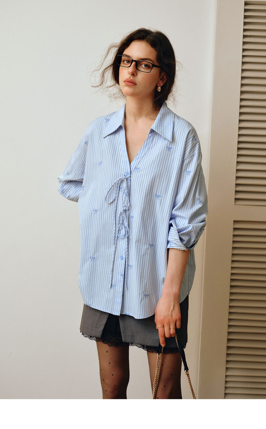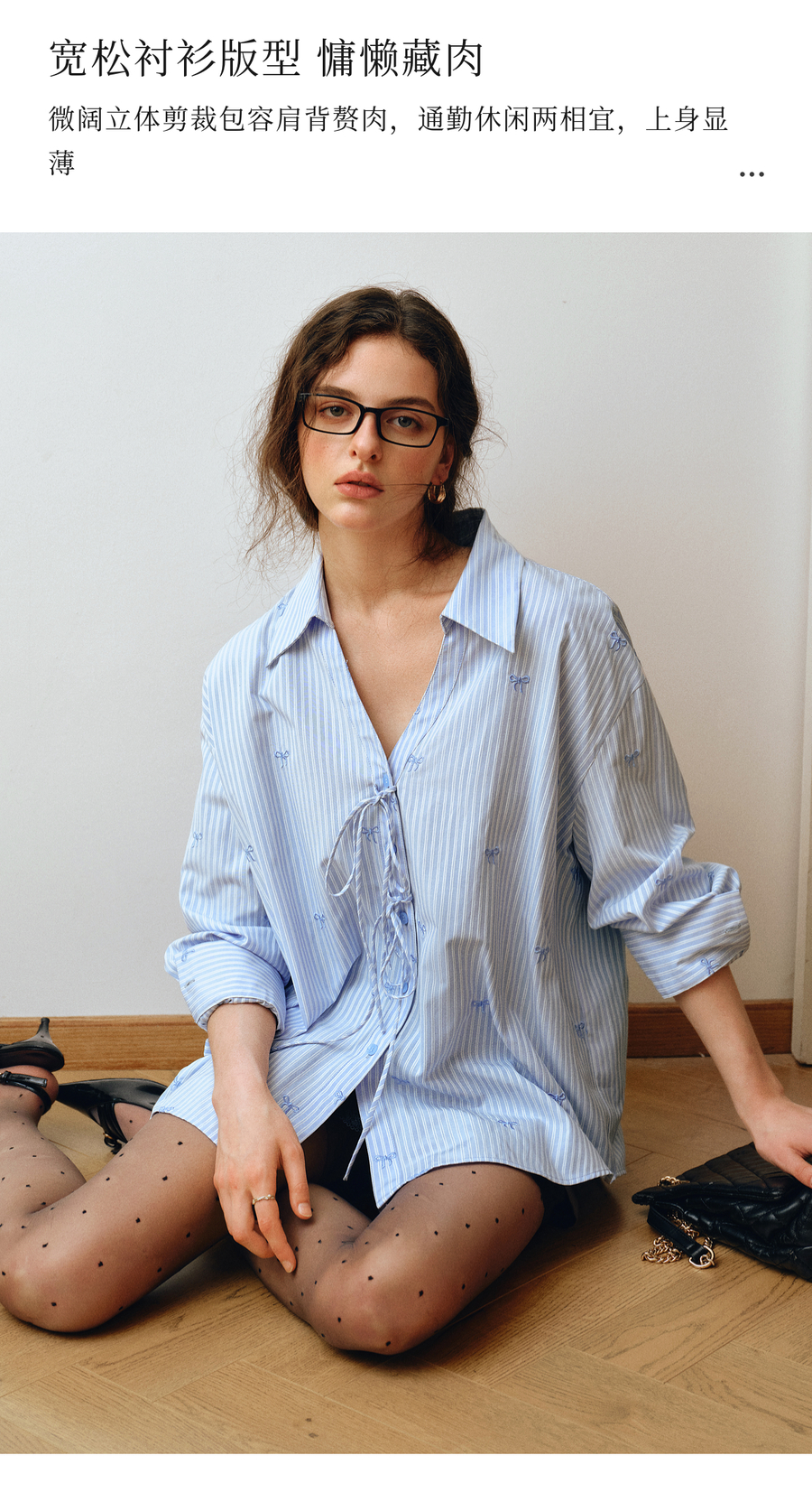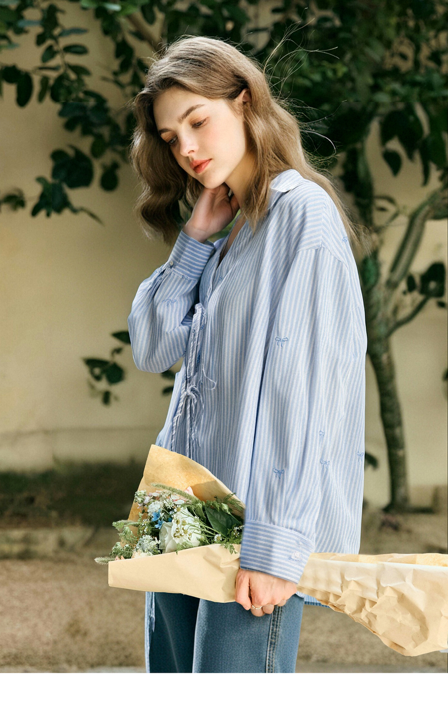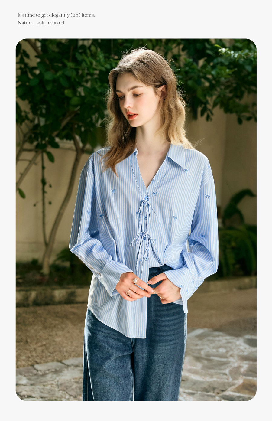 OLrain欧芮儿2025新款女秋季法式蓝色条纹绣花设计感慵懒长袖衬衫