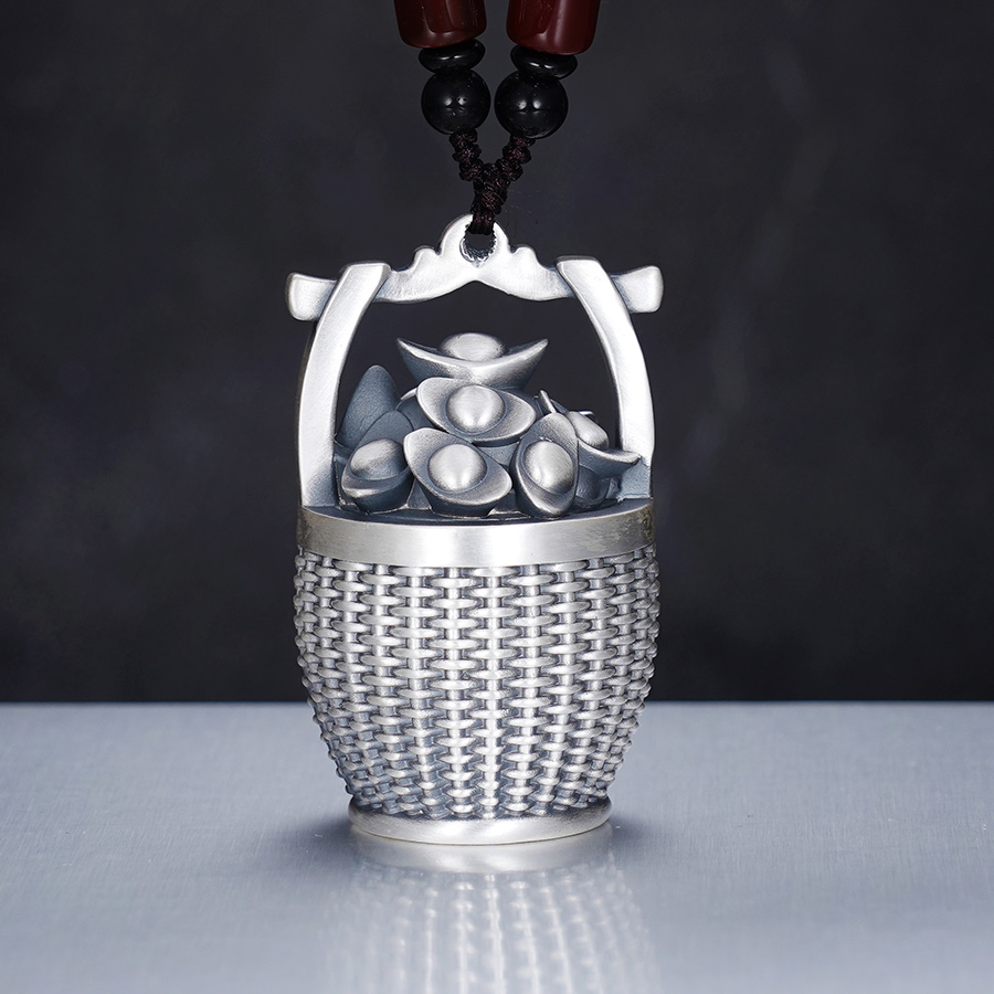 【寓意】:一桶金手把件,外形呈编织纹理,顶部堆满铜钱。整体造型精致立体,寓意财来运转,发财致富。