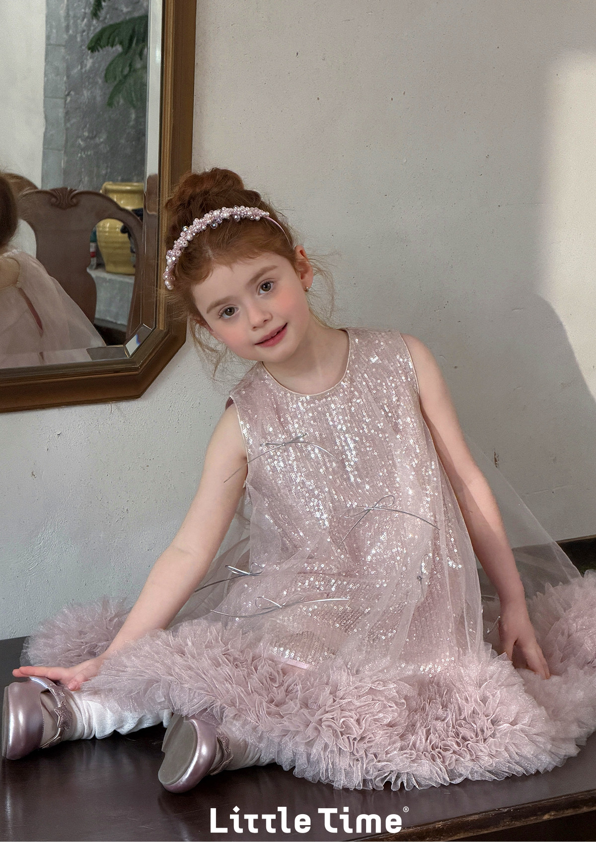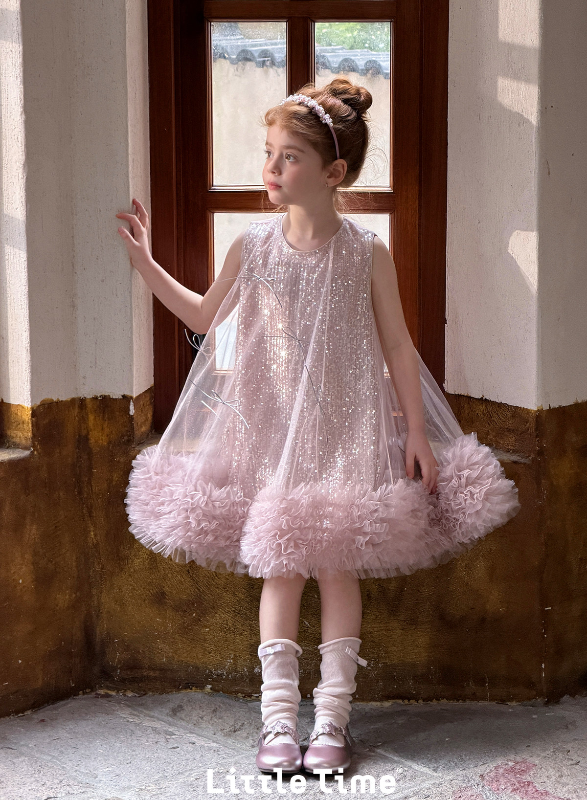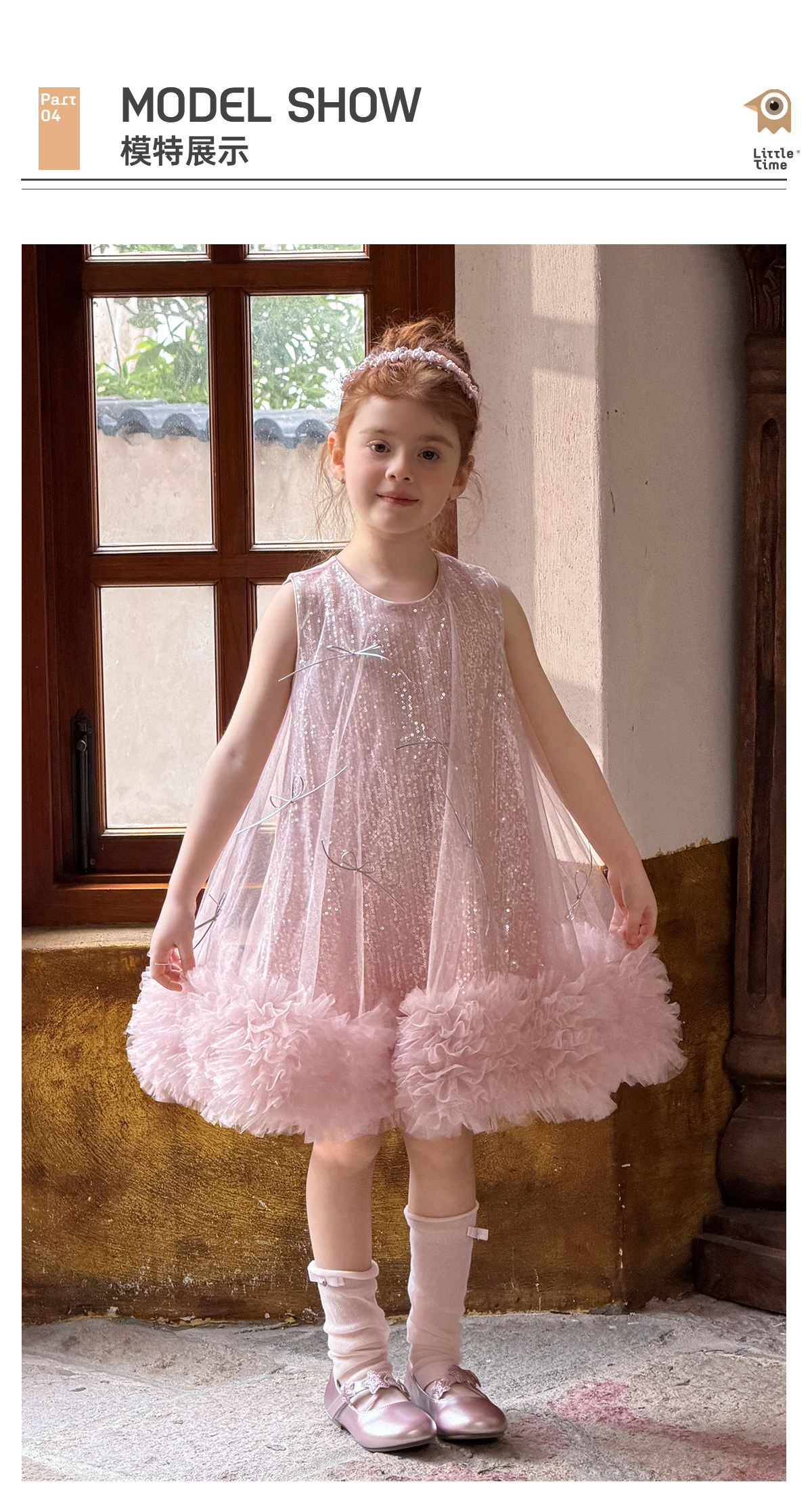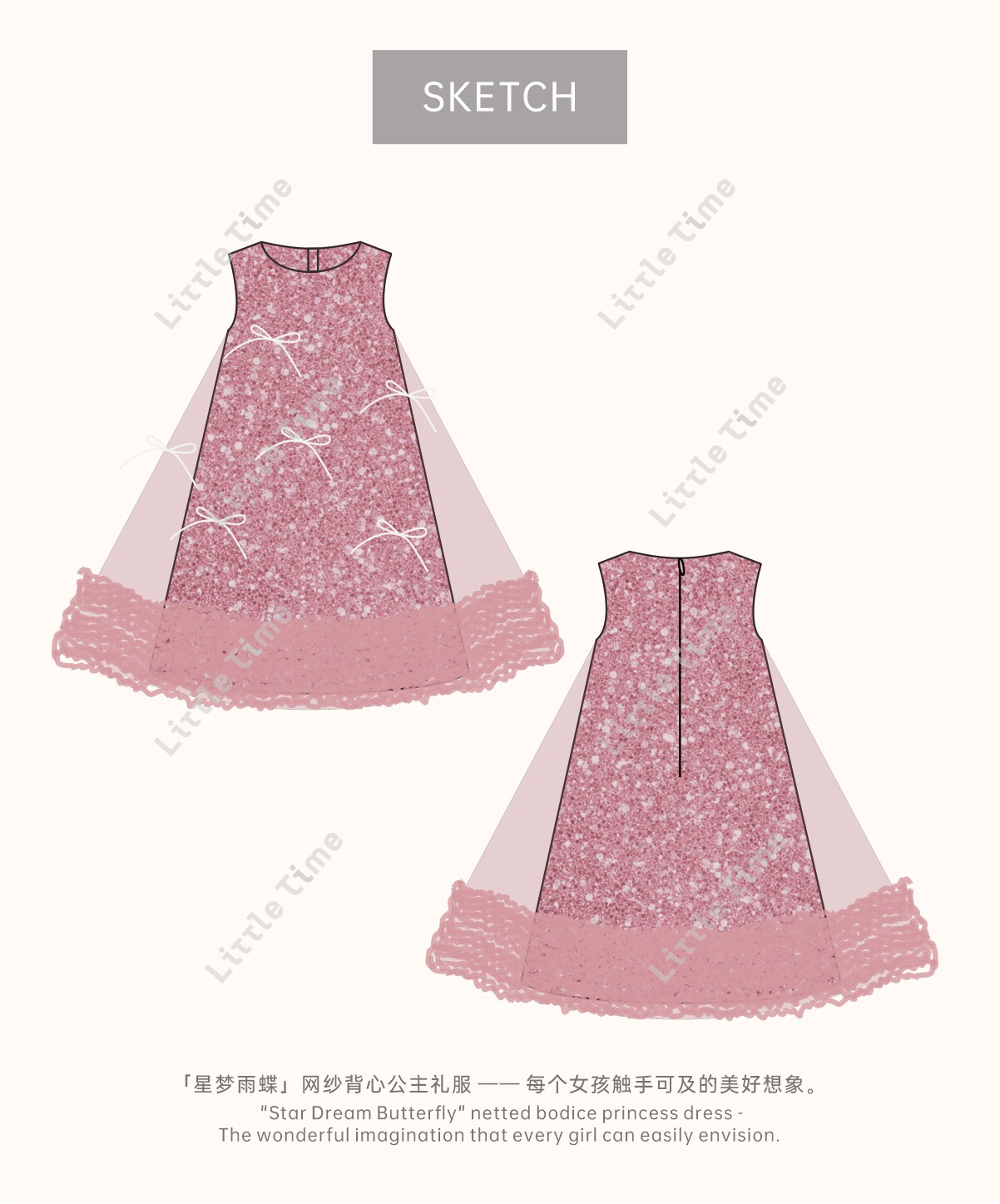 littletime亮片蝴蝶结网纱连衣裙女童公主裙粉色蓬蓬礼服背心裙