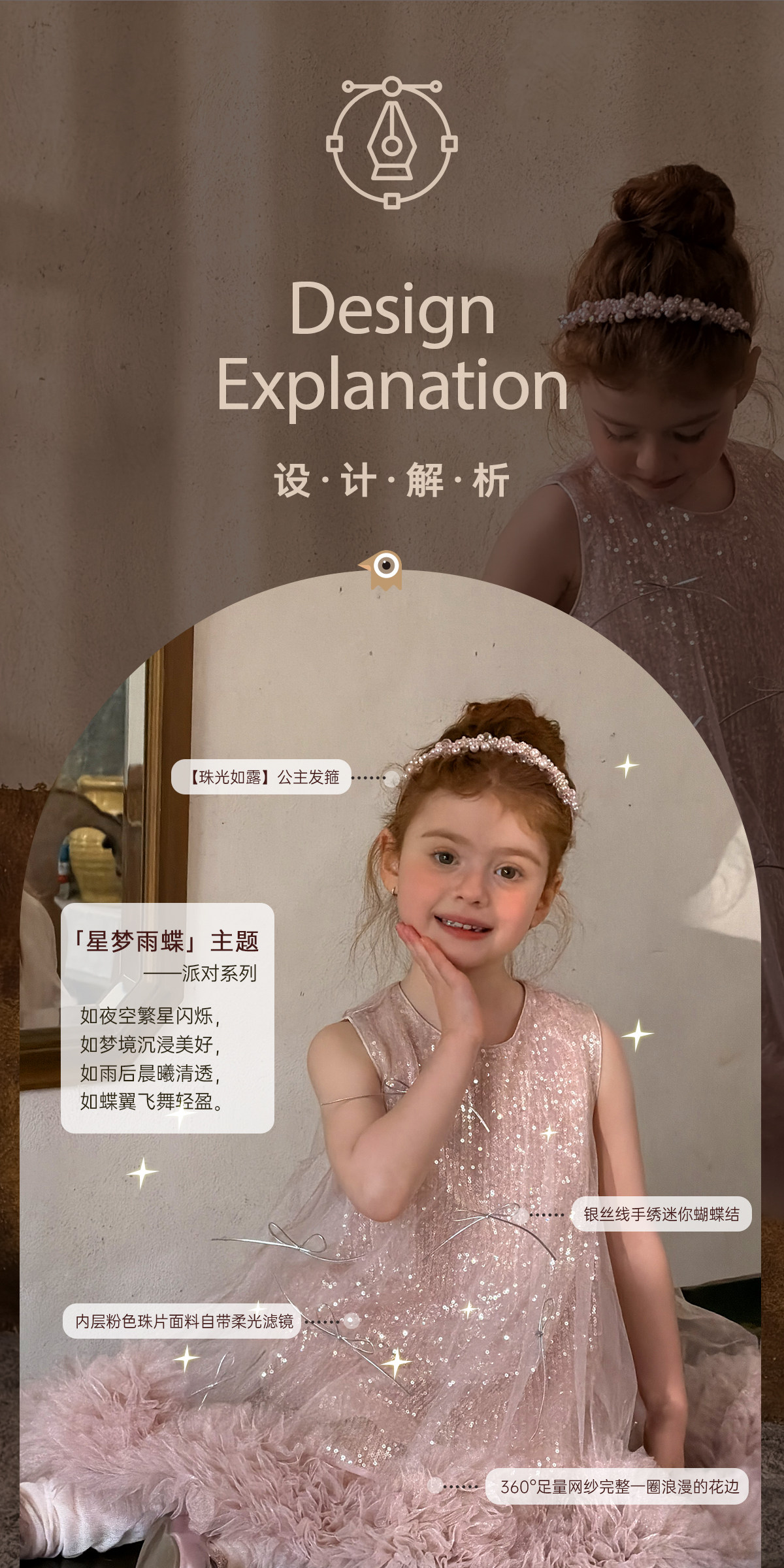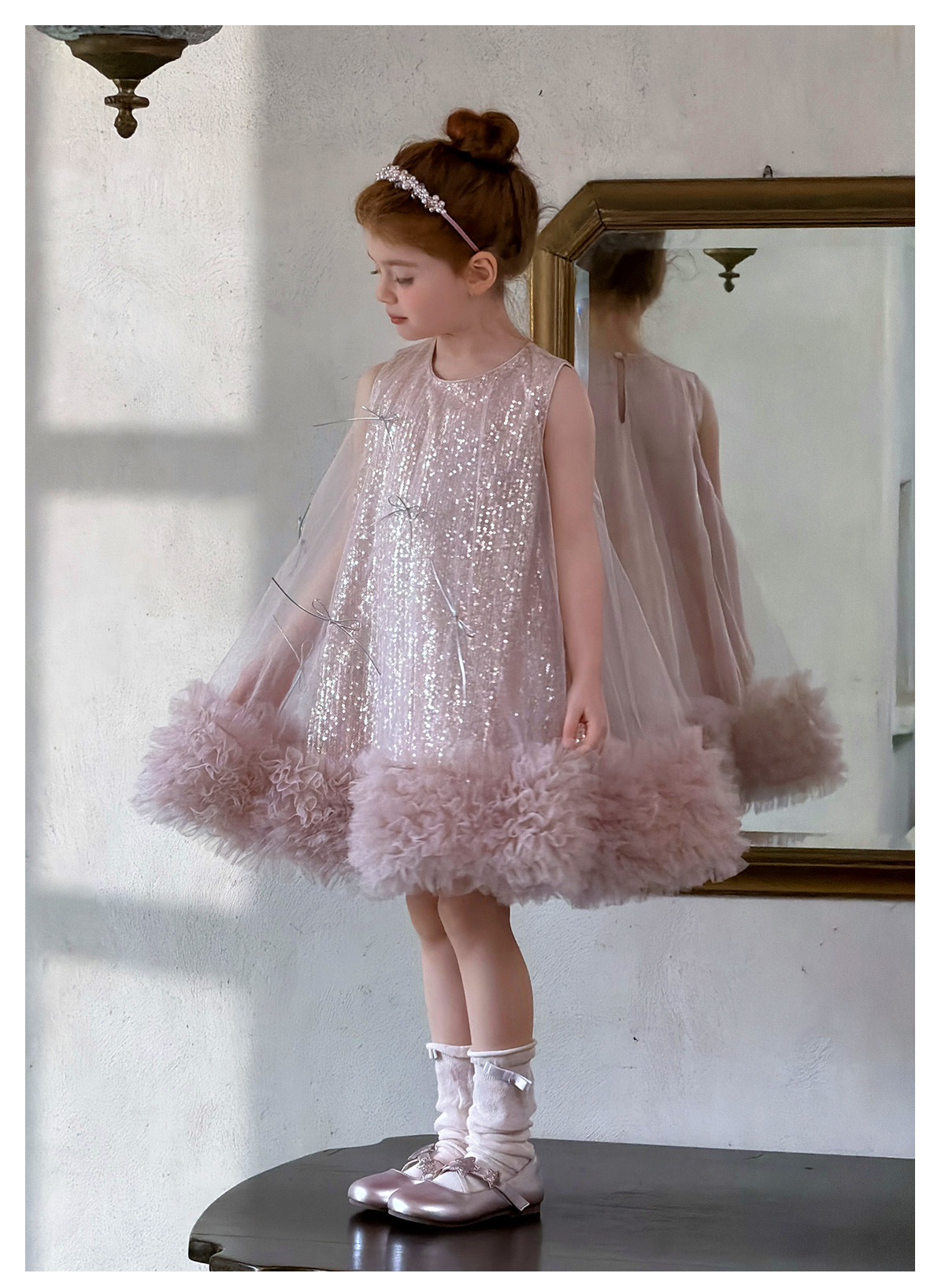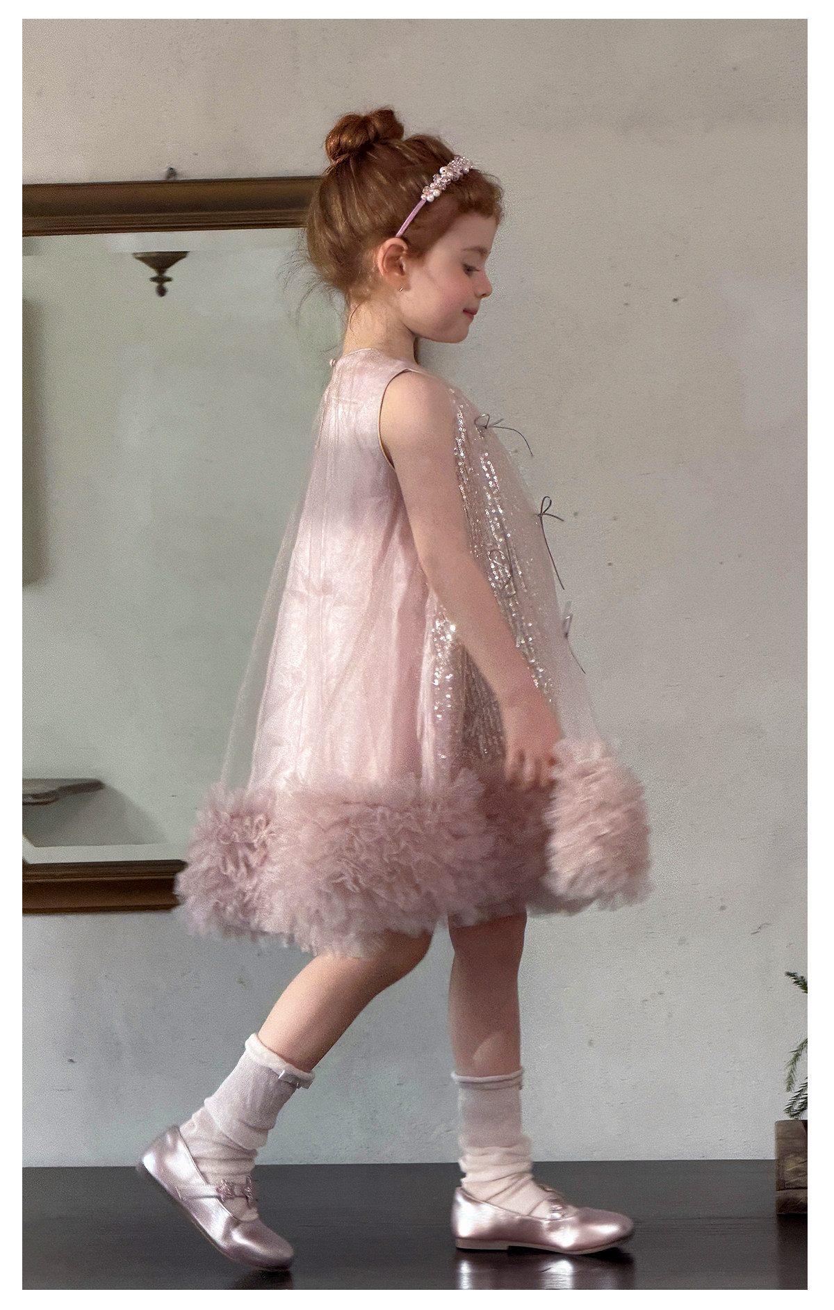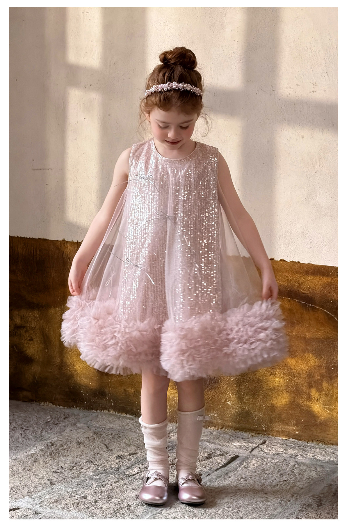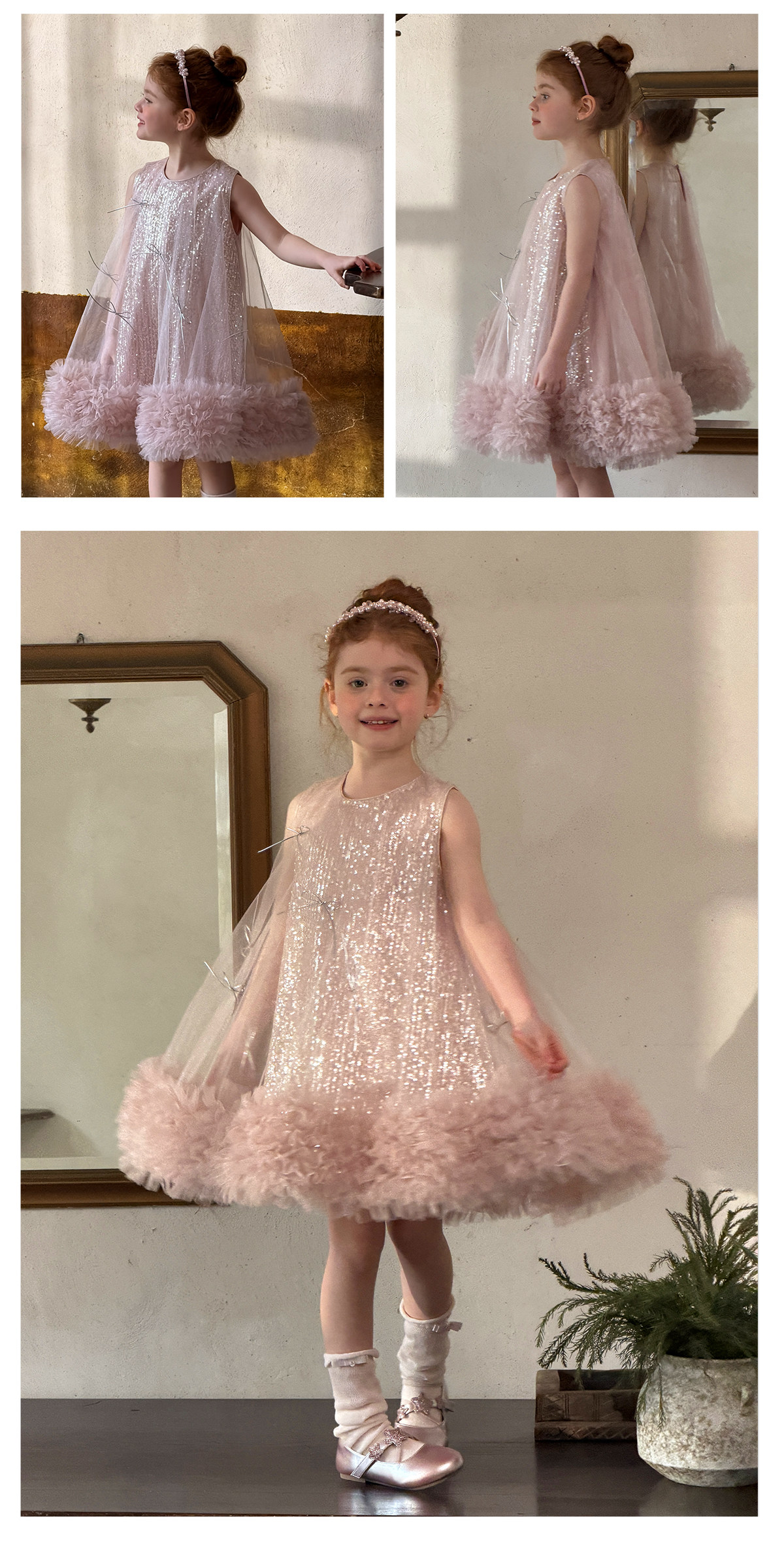 littletime亮片蝴蝶结网纱连衣裙女童公主裙粉色蓬蓬礼服背心裙