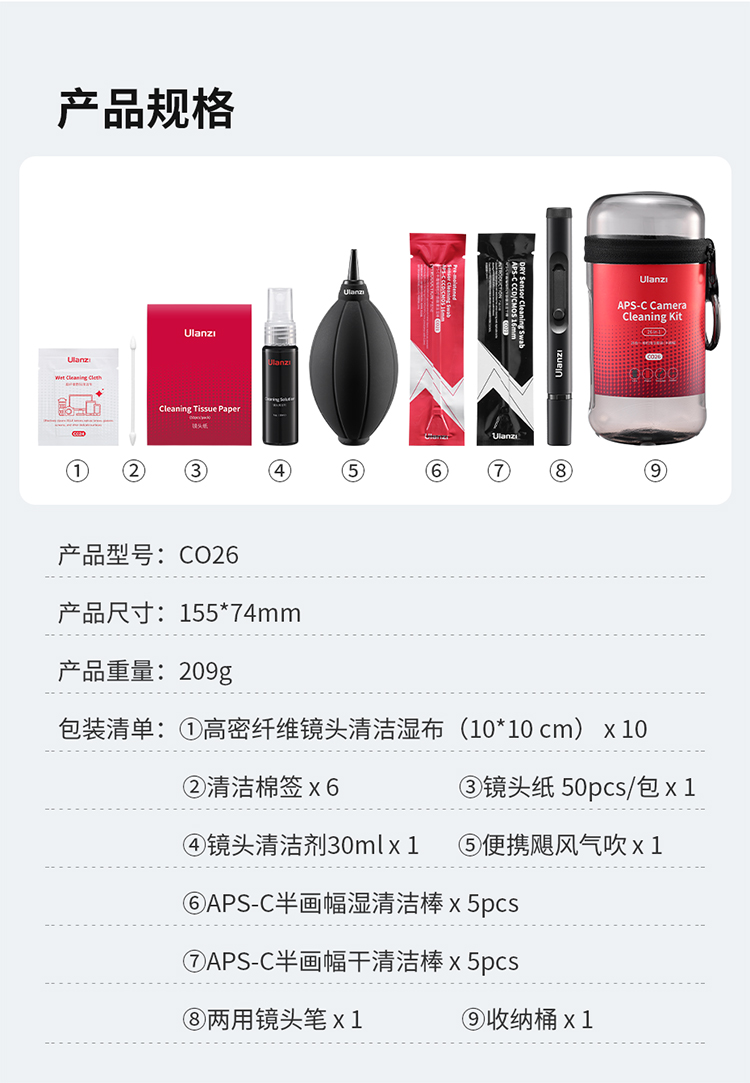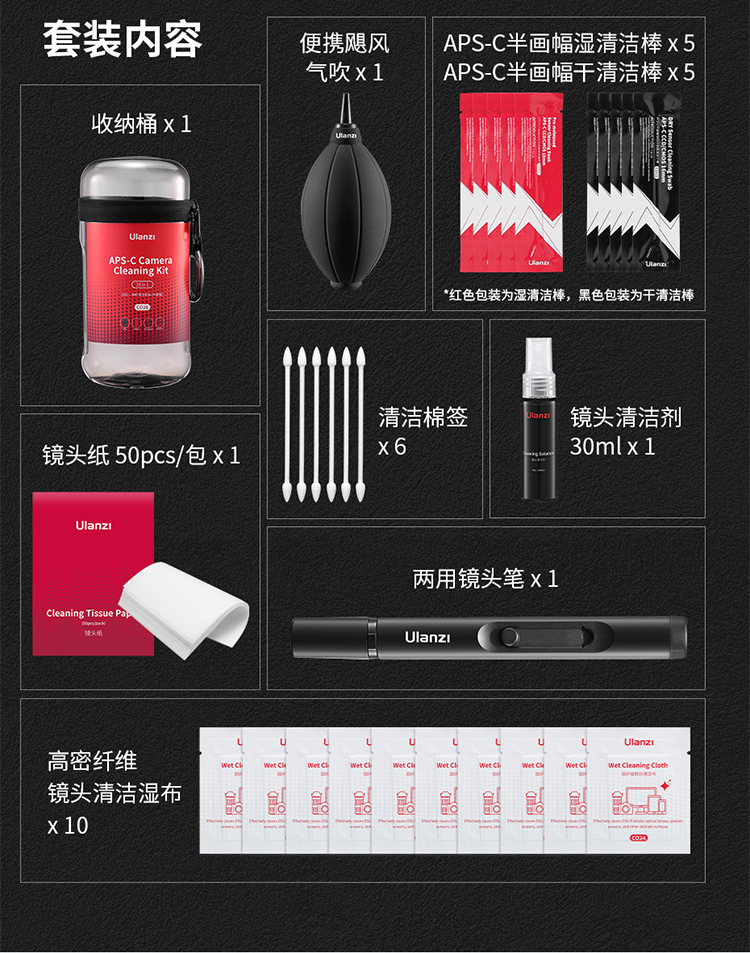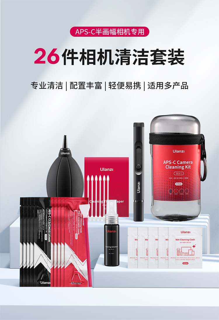 Ulanzi优篮子C028半画幅微单眼相机反相机26合一清洁套组便捷气吹镜头纸清洁湿布清洁剂CMOS感测器清洁棒两用镜头笔