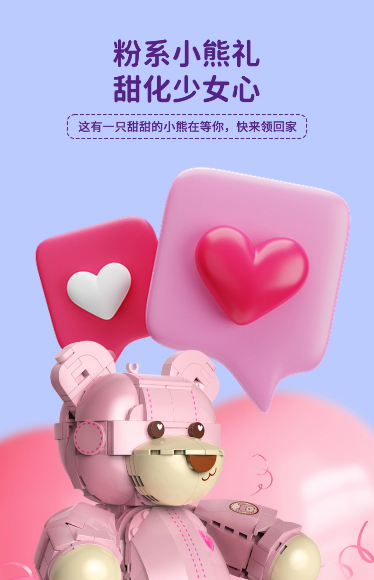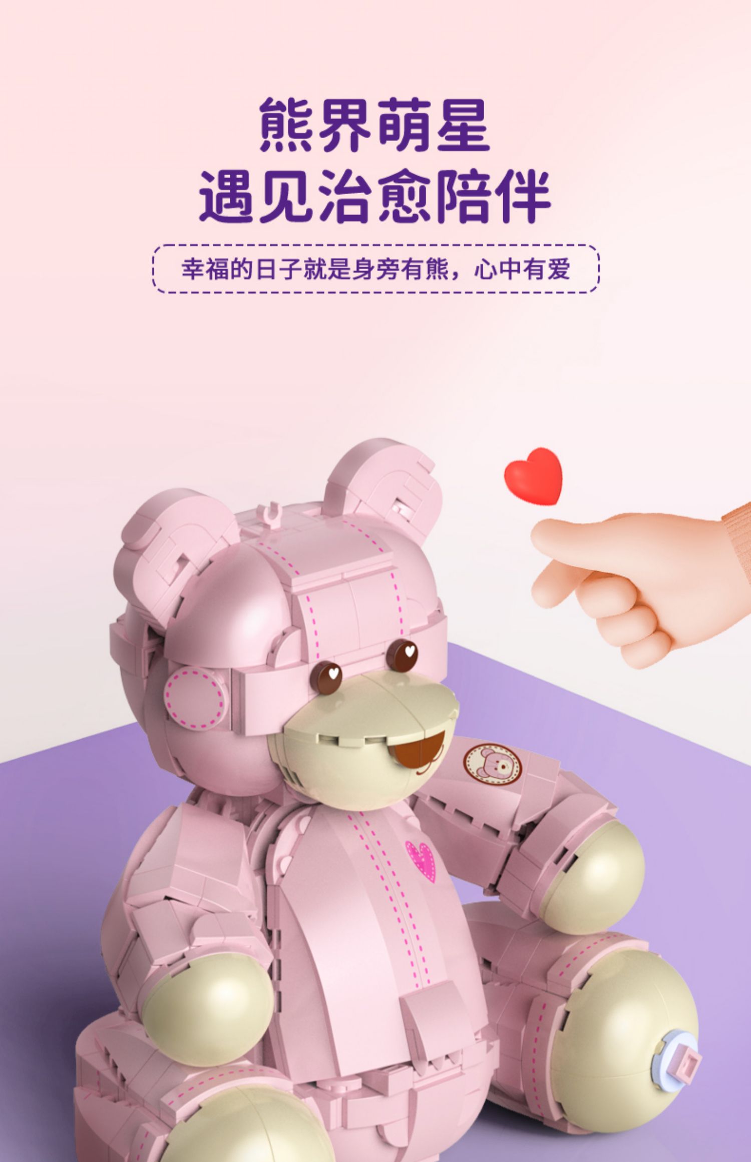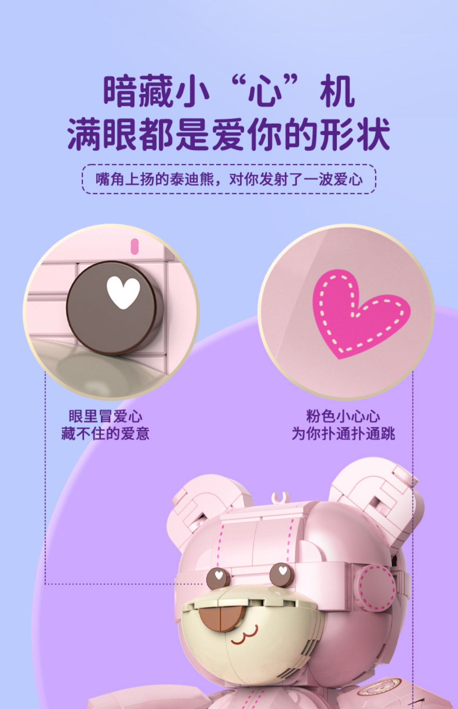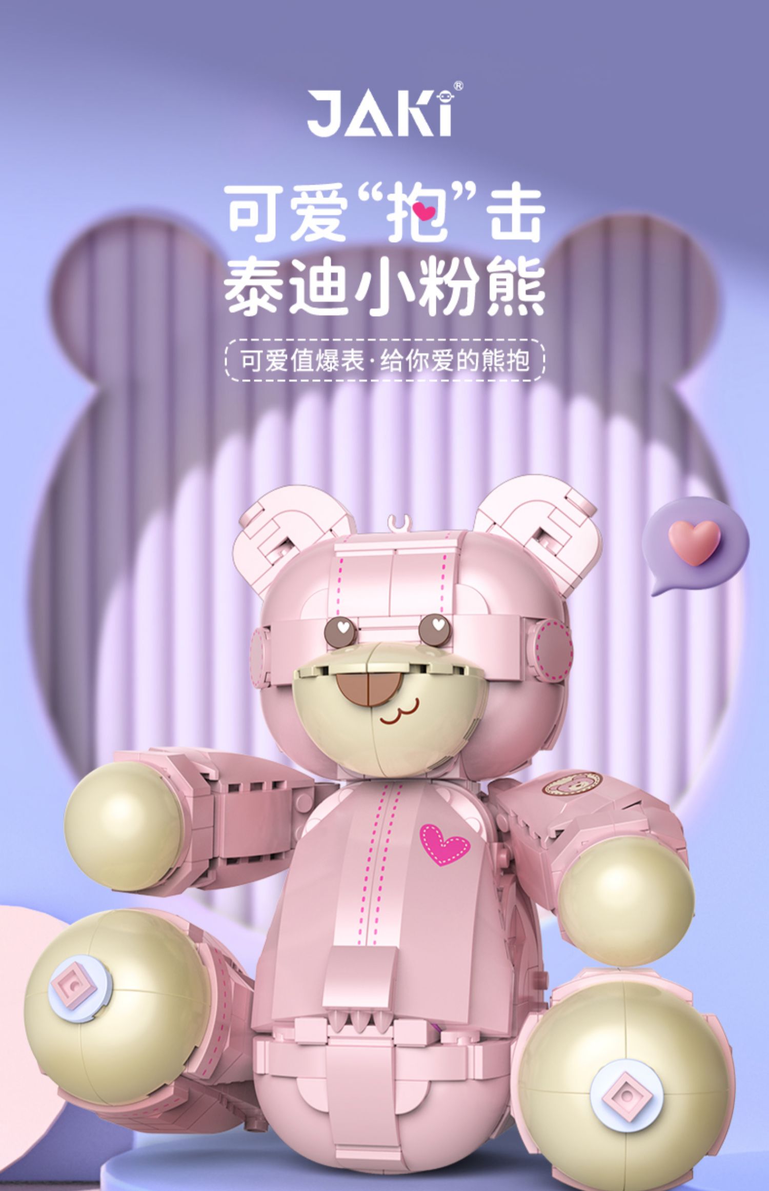 JAKI佳奇积木泰迪小粉熊益智拼装情人节送女生礼物桌面摆件玩具
