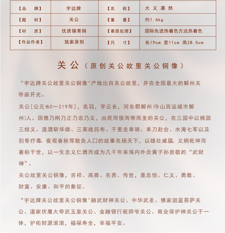 宇达青铜创意艺术礼品家居办公室装饰摆件《大义凛然》关公铜像
