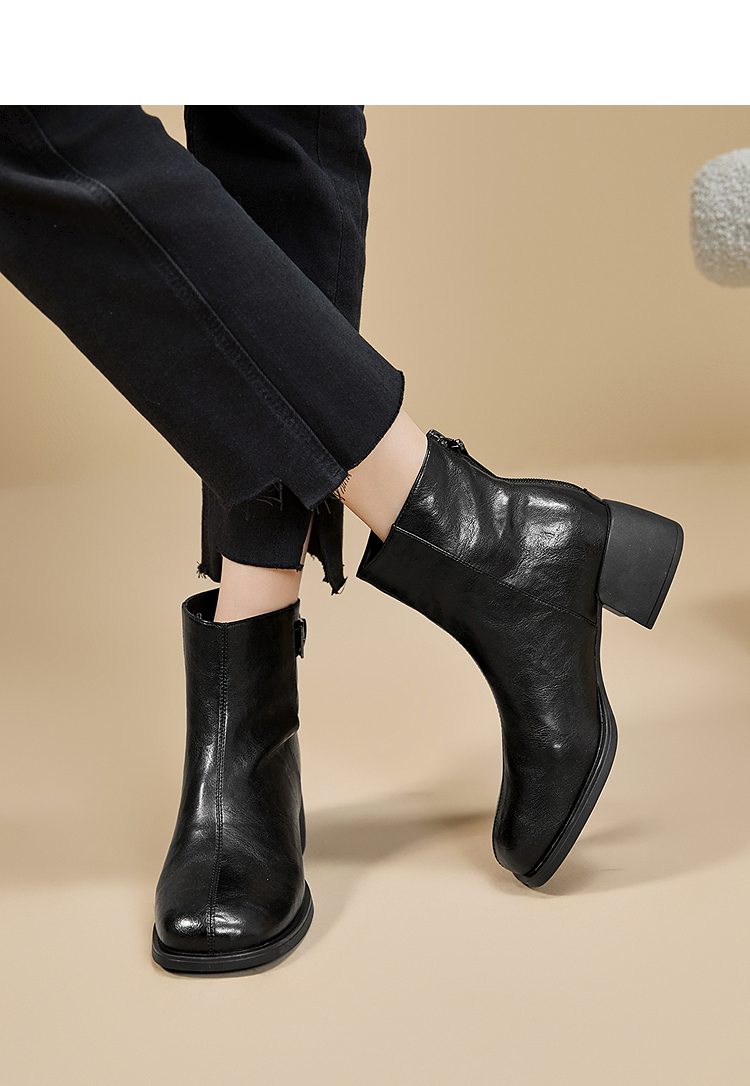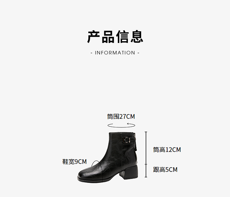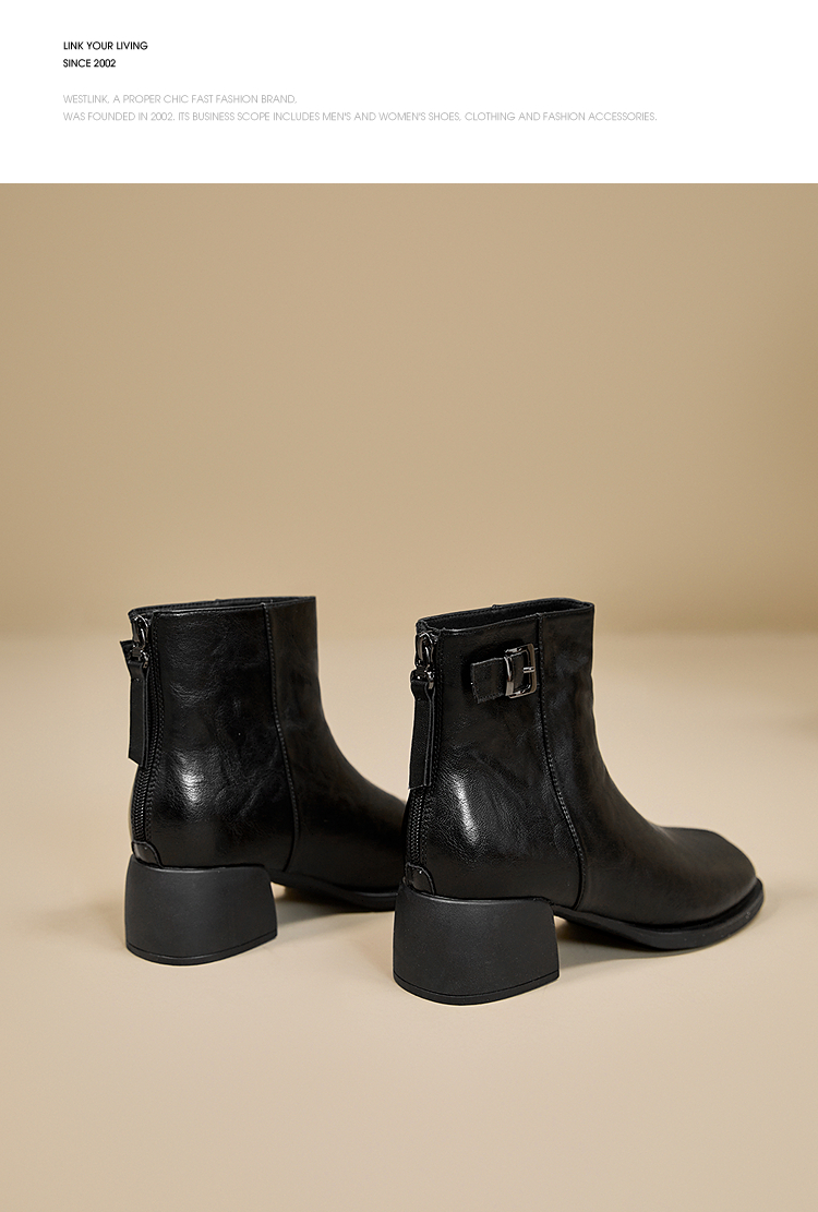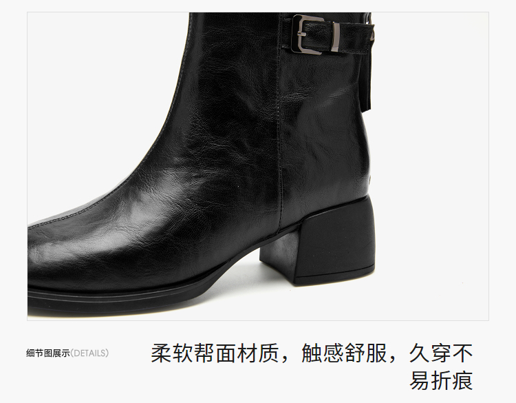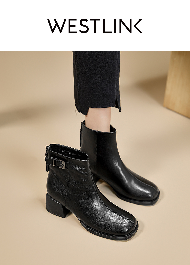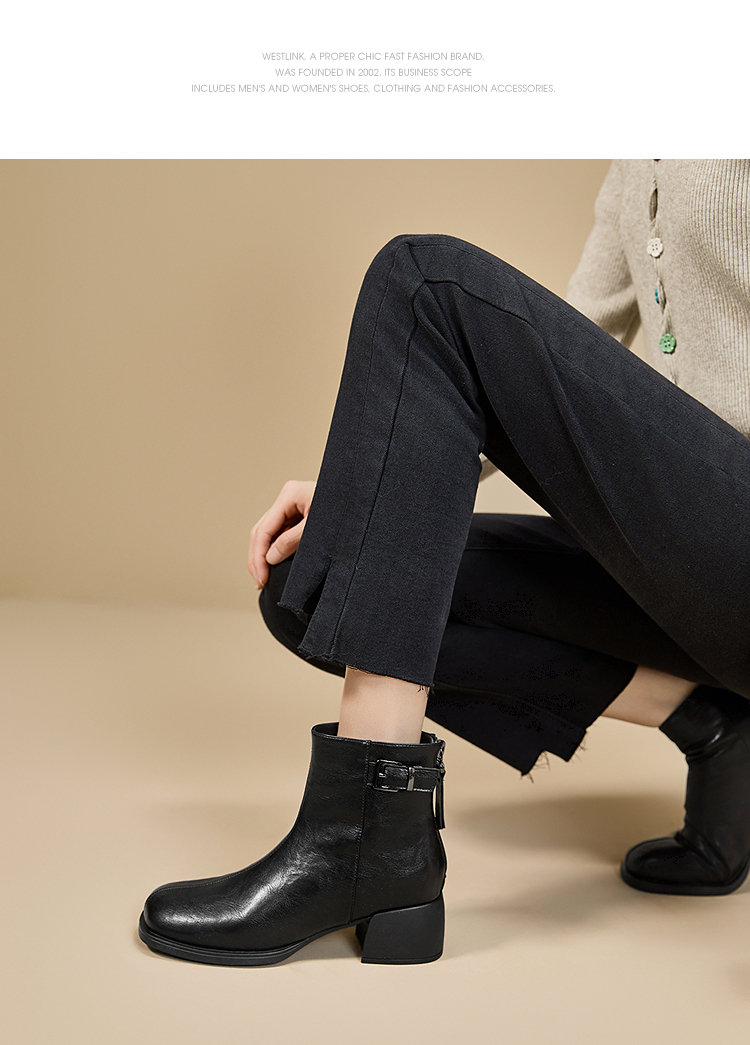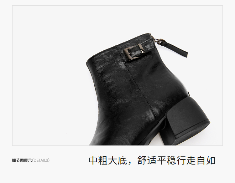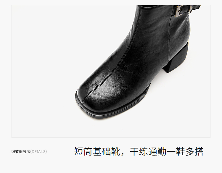 西遇粗跟短靴女新款秋冬高跟鞋皮带扣法式百搭黑色圆头瘦瘦靴V2257251