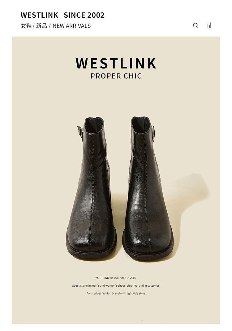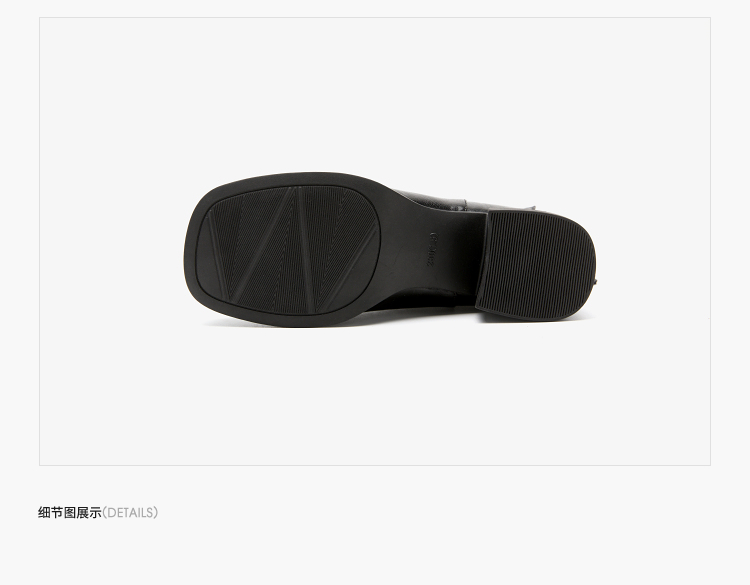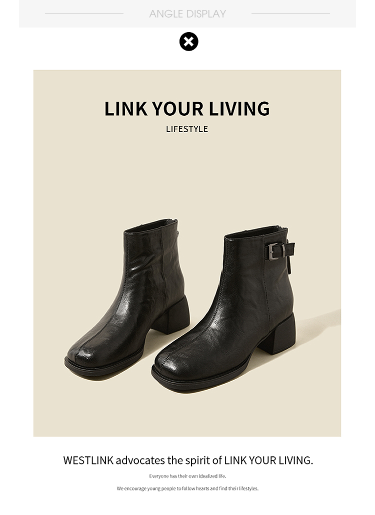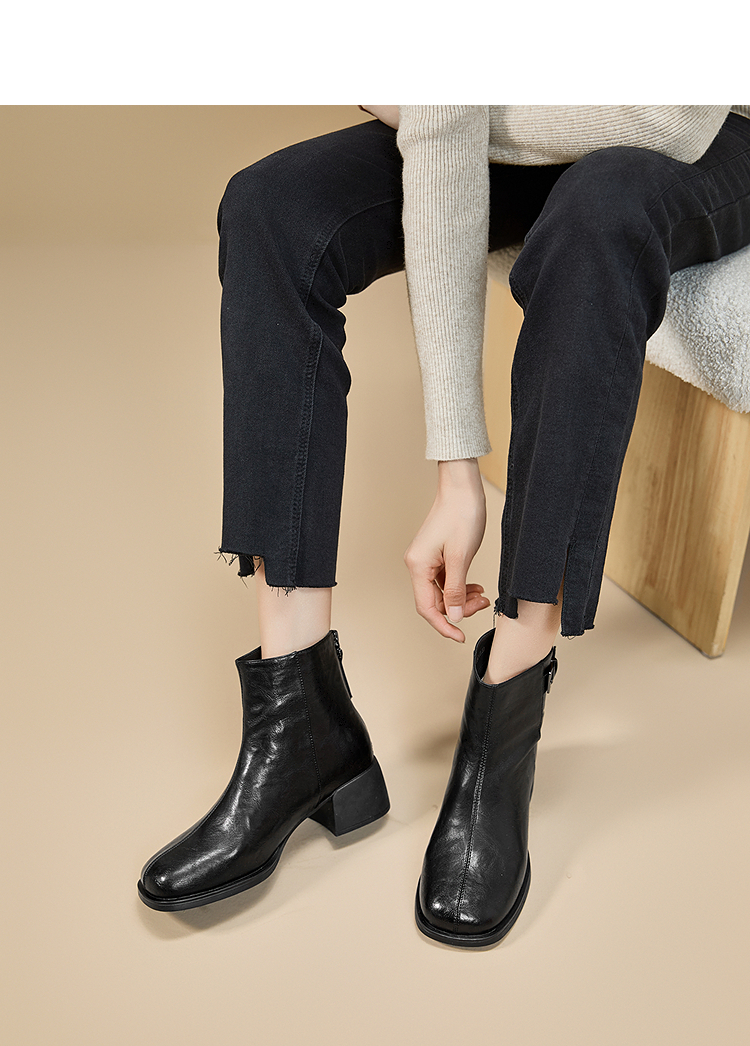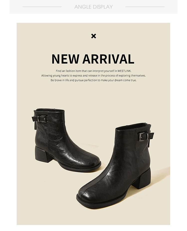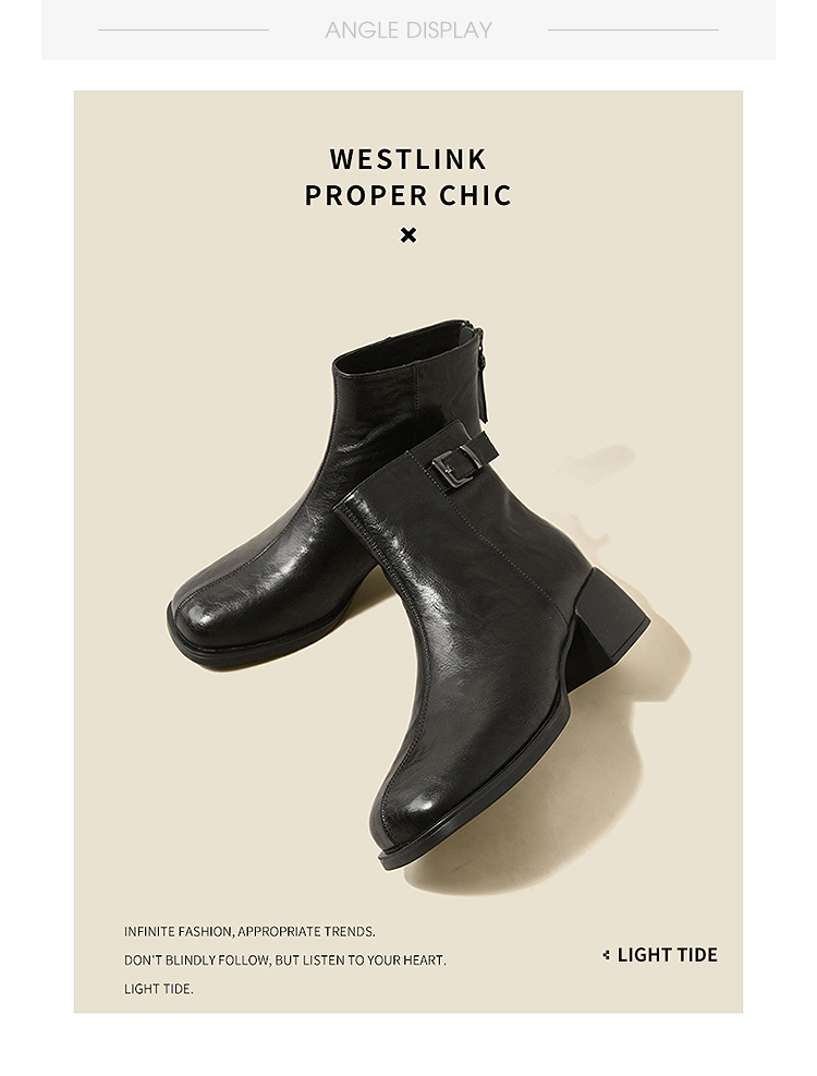 西遇粗跟短靴女新款秋冬高跟鞋皮带扣法式百搭黑色圆头瘦瘦靴V2257251