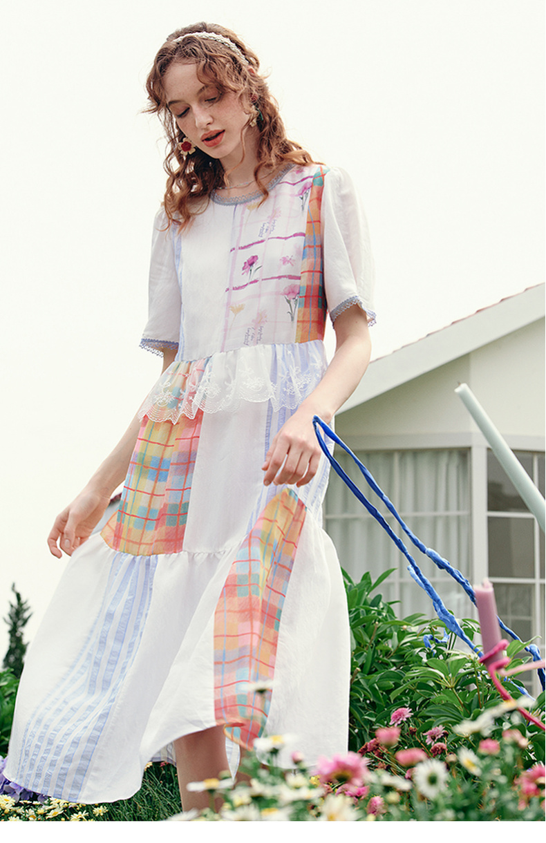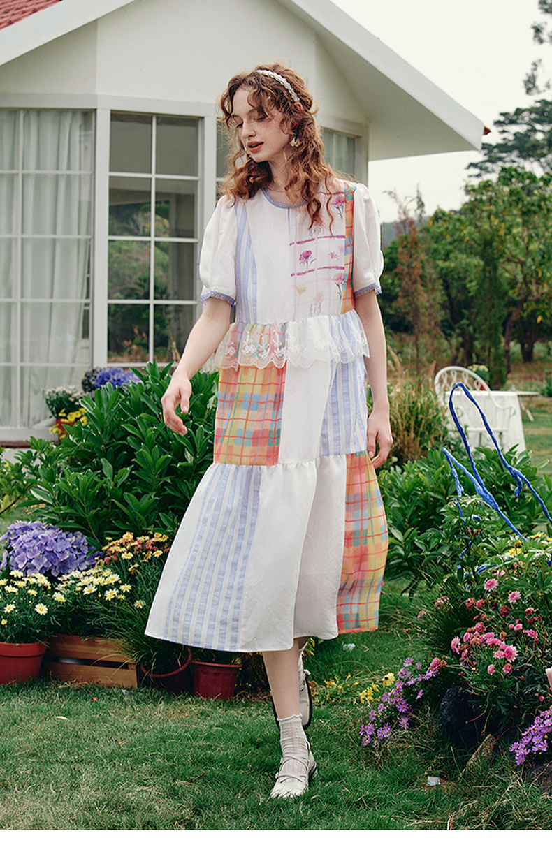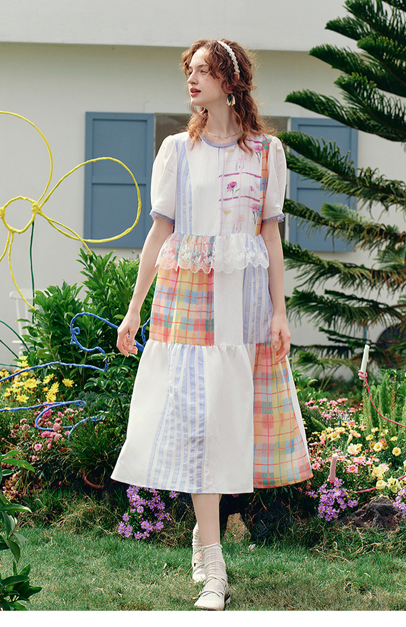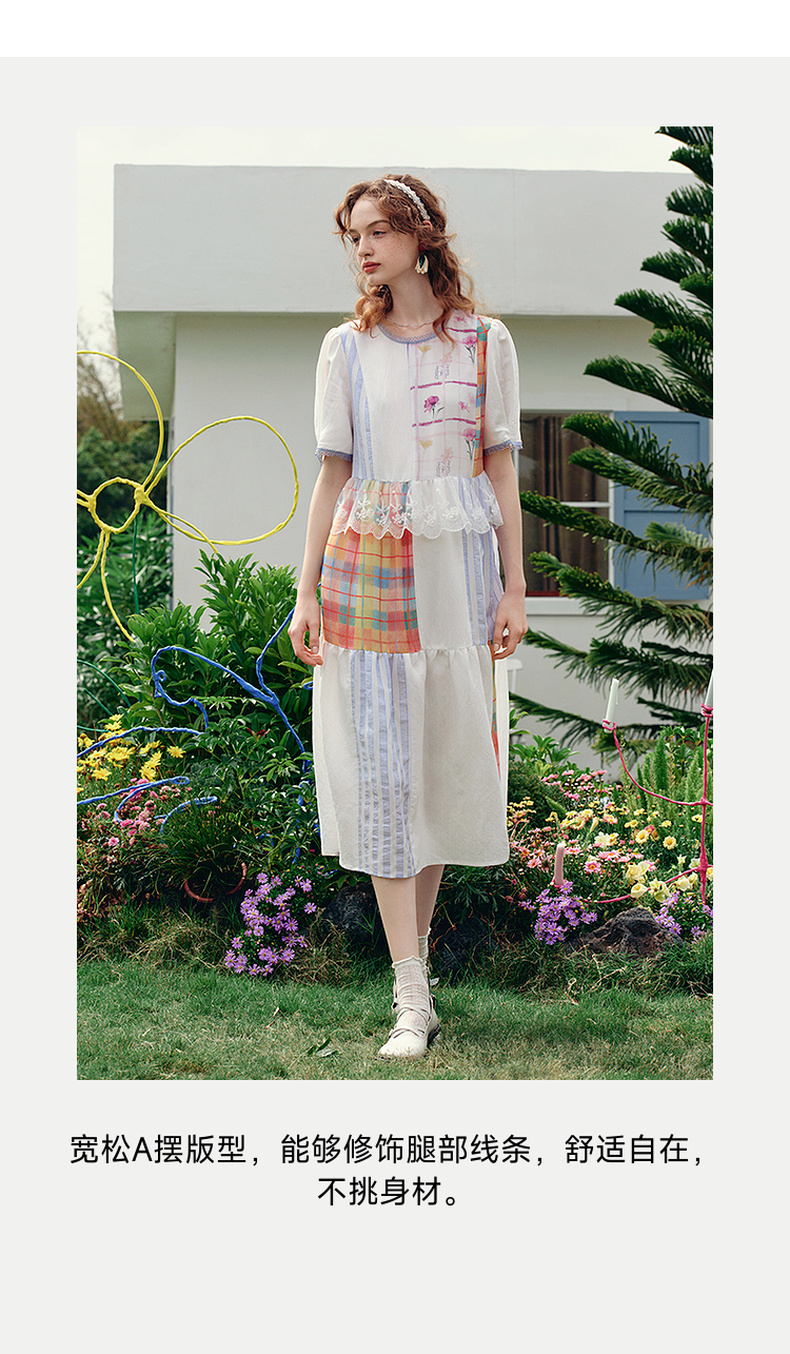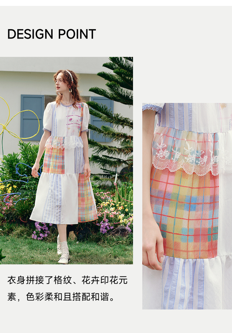 两三事 碎虹棱镜 2025夏季新款森女风蕾丝拼接拼布泡泡袖连衣裙