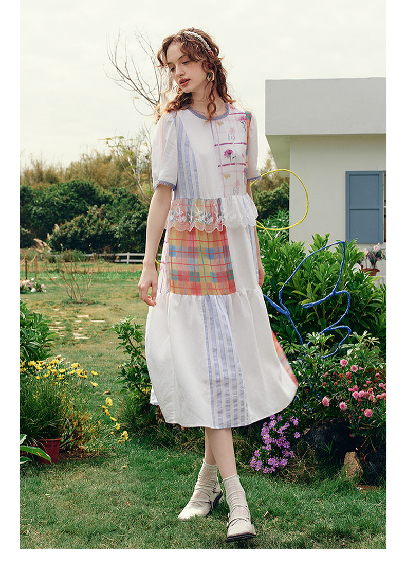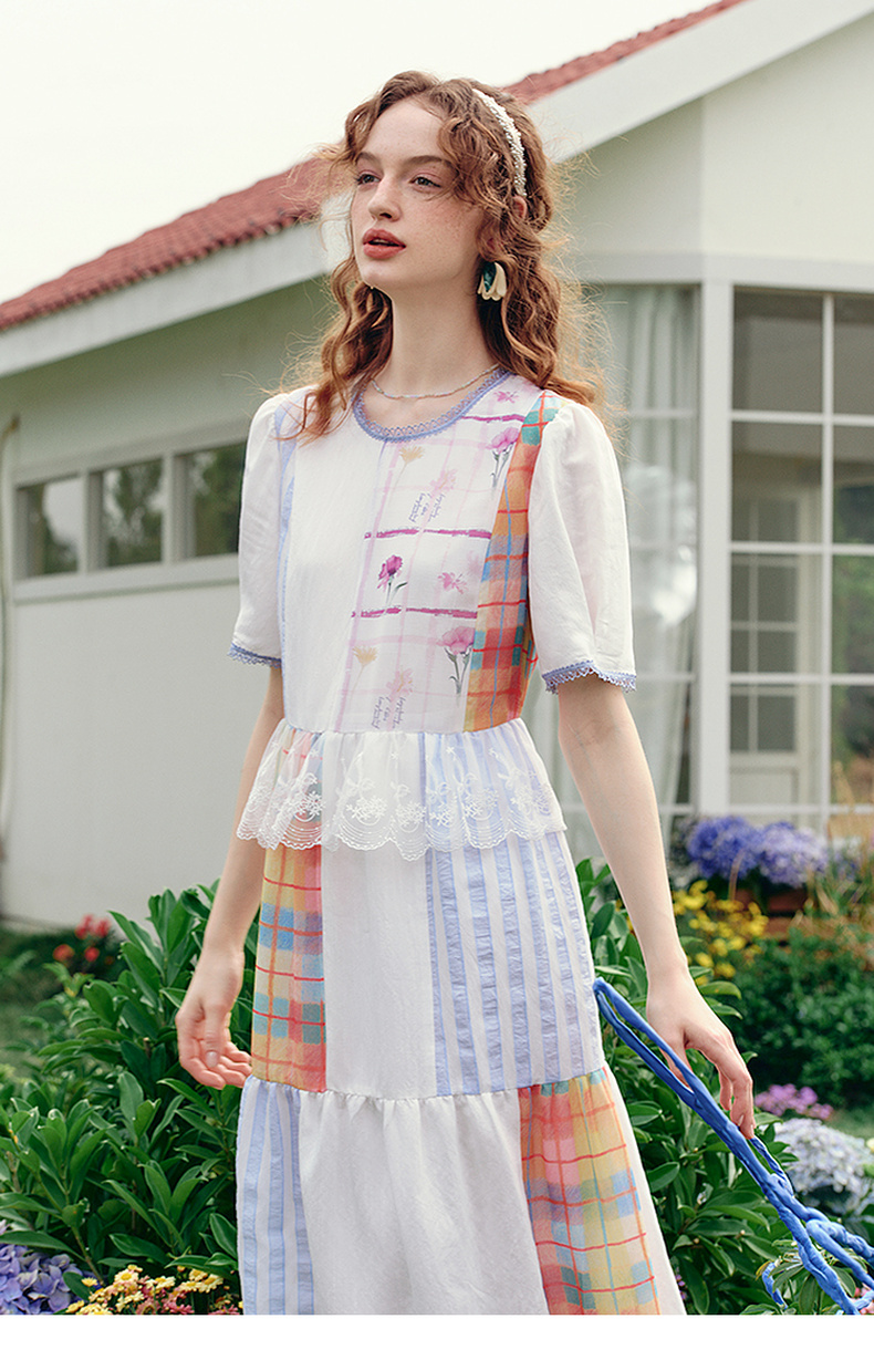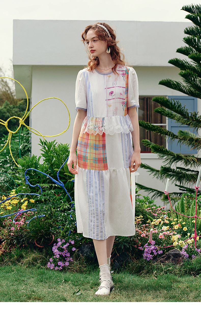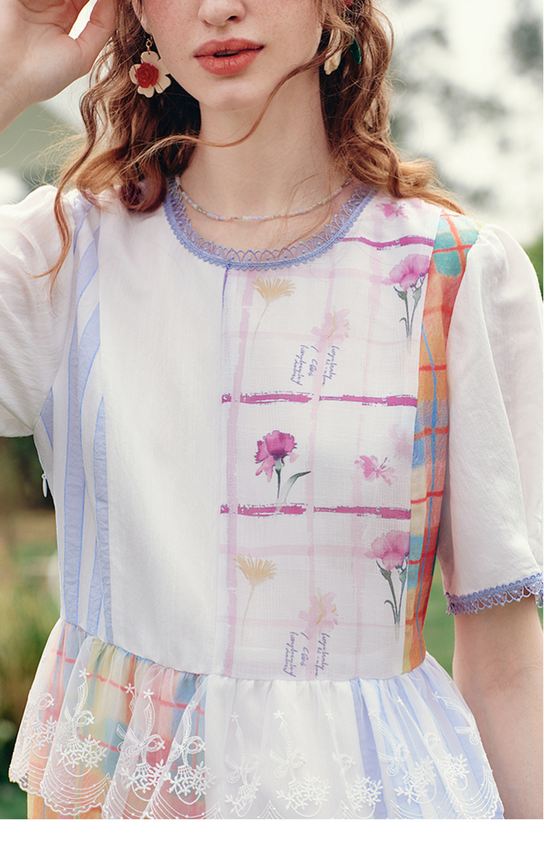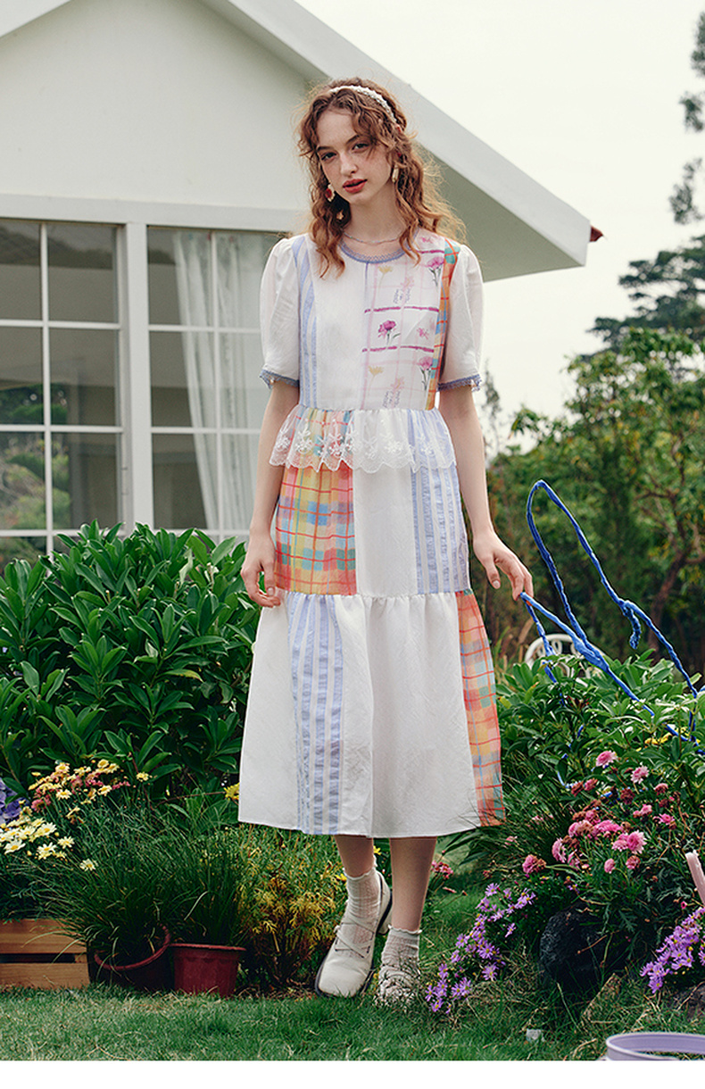 两三事 碎虹棱镜 2025夏季新款森女风蕾丝拼接拼布泡泡袖连衣裙