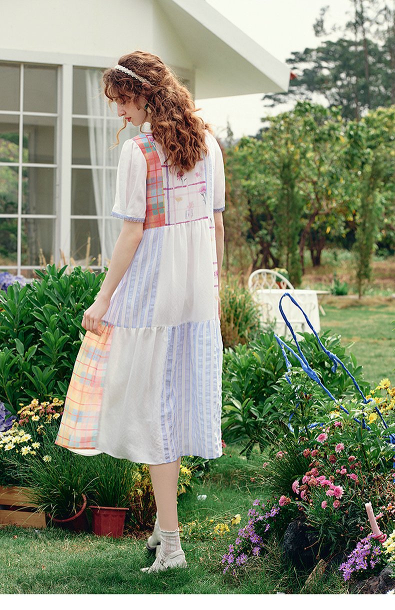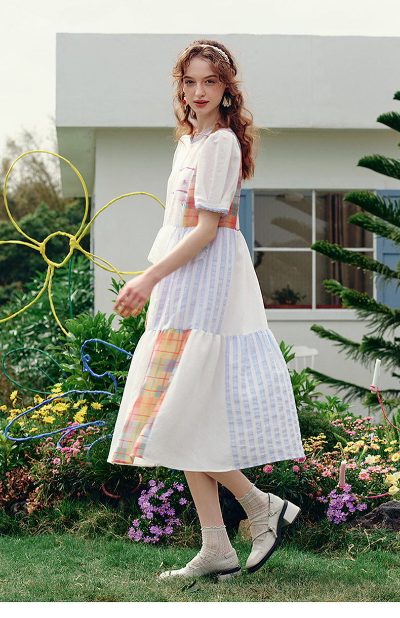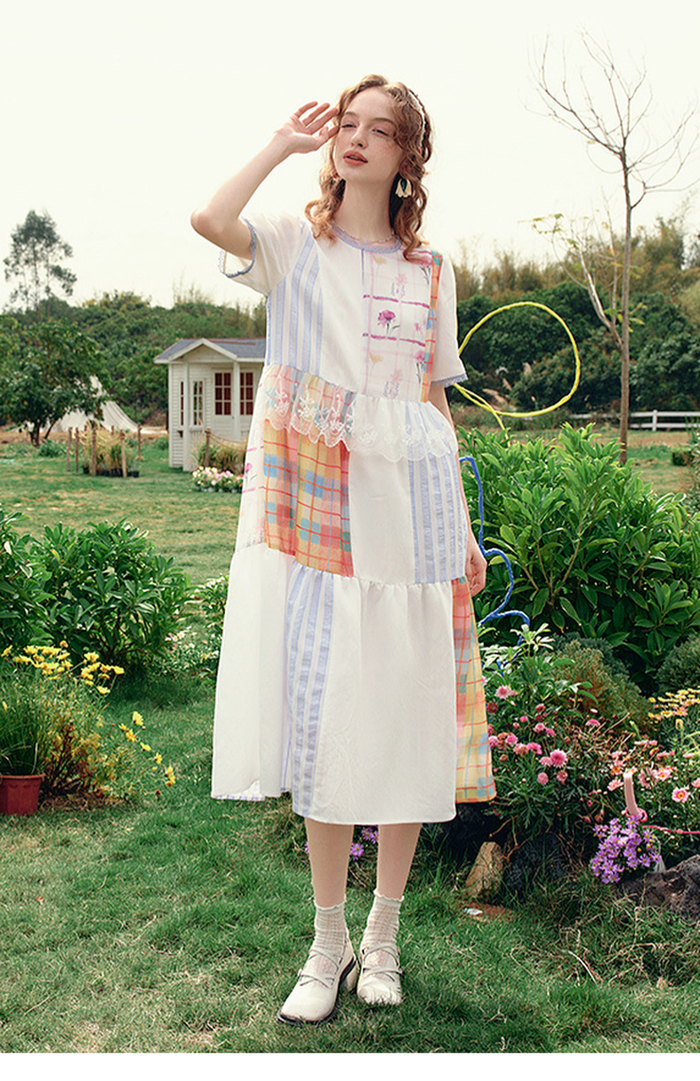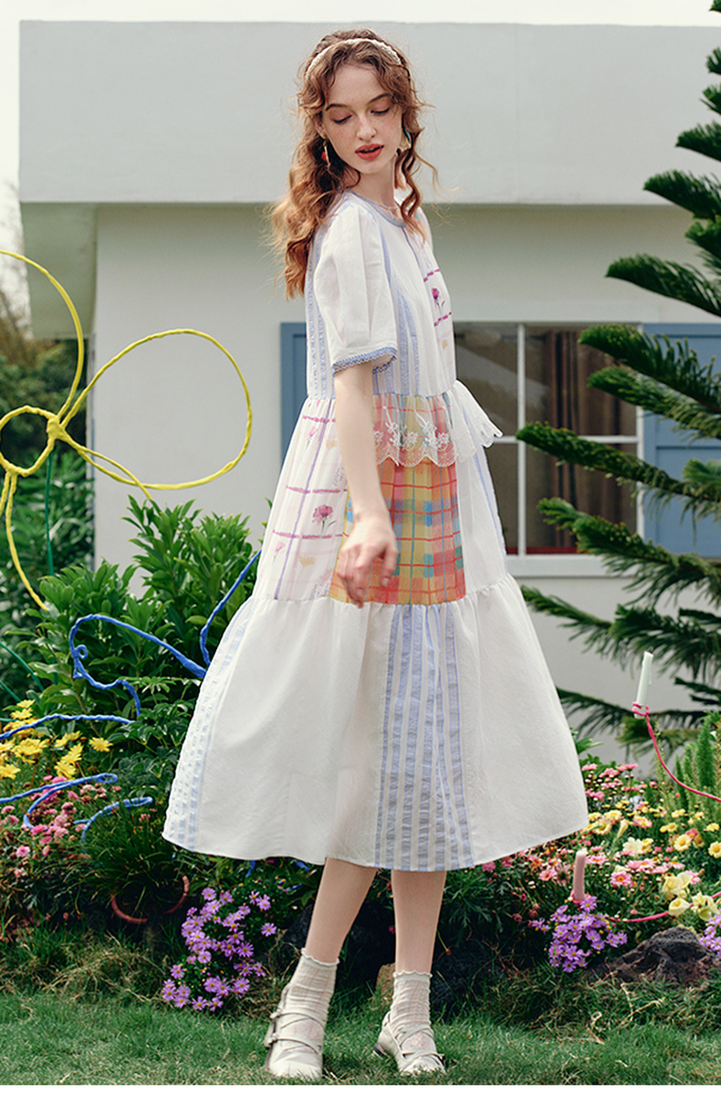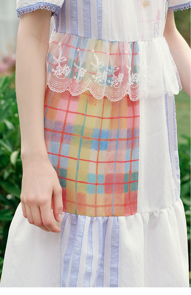 两三事 碎虹棱镜 2025夏季新款森女风蕾丝拼接拼布泡泡袖连衣裙