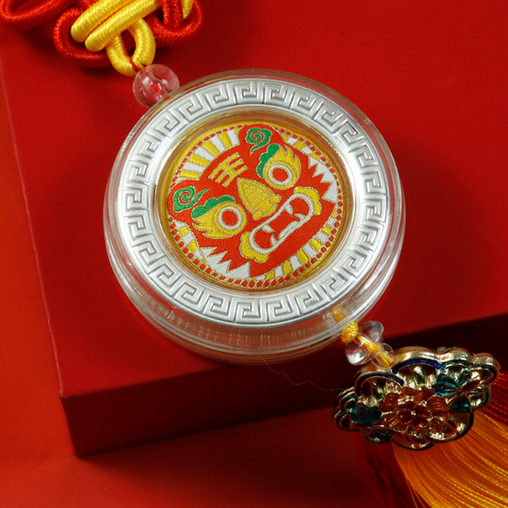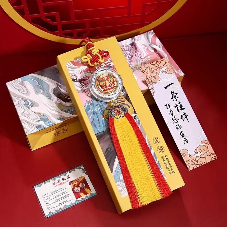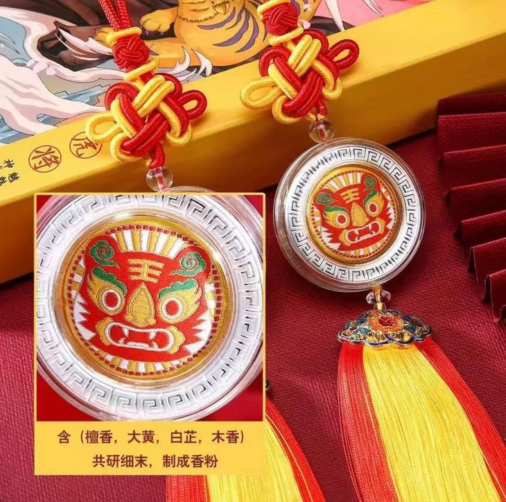 虎头造型香囊,采用刺绣工艺,精致秀丽,内含檀香等名贵香料,沁人心脾。虎乃百兽之王,邪祟不敢侵,魑魅恶魔难走近,神威远摄报平安