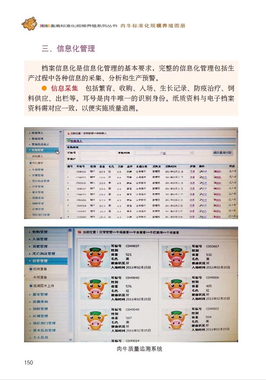 本书主要介绍肉牛标准化规模养殖全过程的关键技术和要点,包括肉牛场规划与建设、环境卫生与生物安全、肉牛的品种与繁殖技术、饲料与日粮配制、肉牛的饲养管理技术规程、肉牛常见疾病的诊断与防治、肉牛场经营管理与肉牛屠宰、分割及副产物的综合利用等内容,通过简练、易懂、富有趣味性的文字,精选简洁、真实的图片近800幅,以彩色图谱的形式,直观表现标准化规模养殖流程,可操作性强,一学就会,给肉牛养殖场及相关技术人员提供简单、实用的技术参考。也可作为扶贫攻坚项目辅助资料。