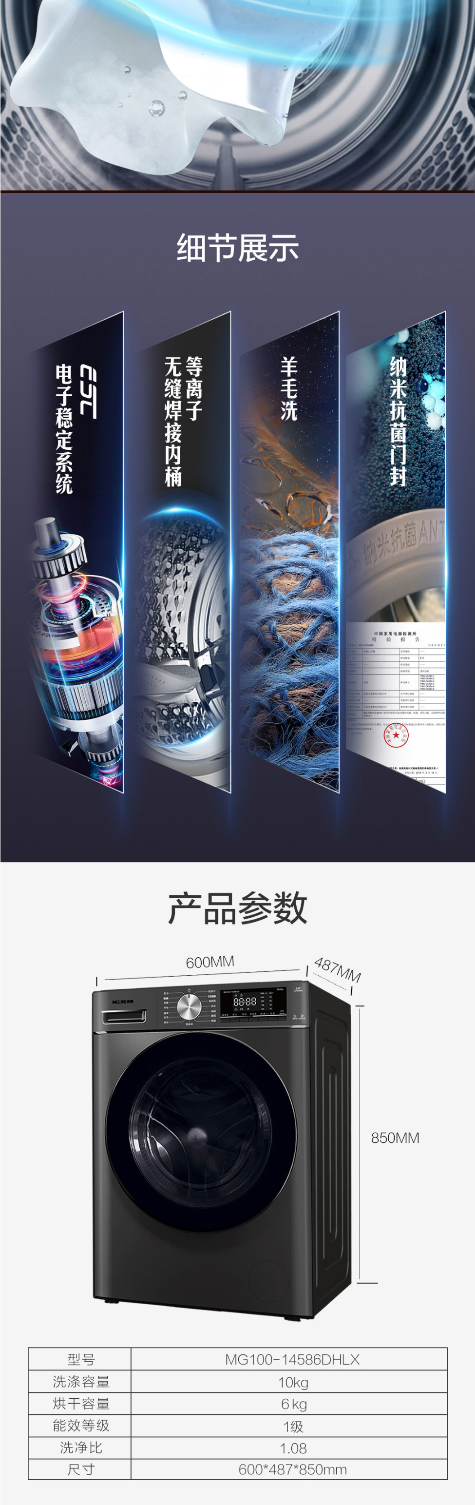 美菱(Meiling)10公斤除螨洗纯棉洗羊毛洗巴氏除菌洗衣机家用洗衣机 MG100-14586DHLX