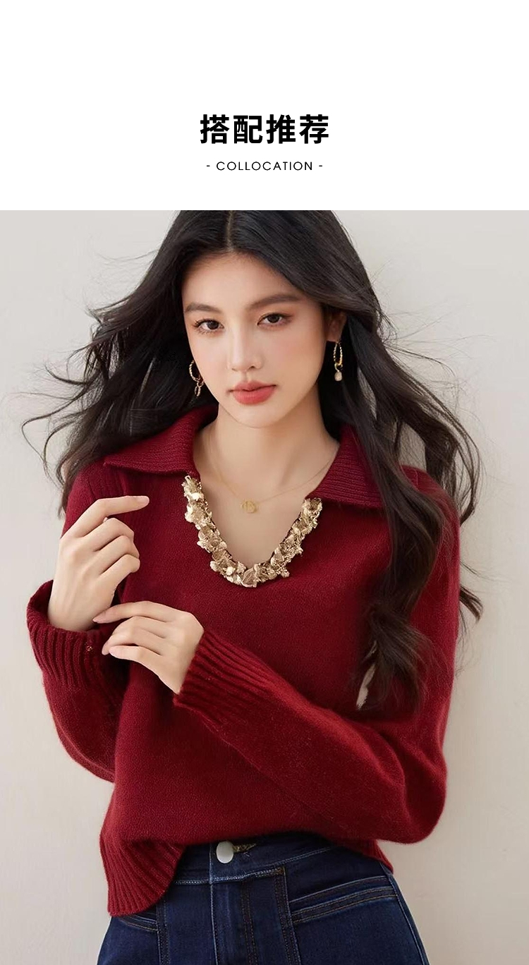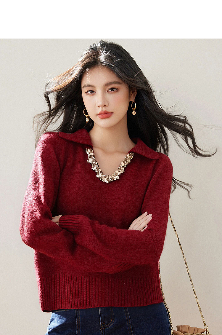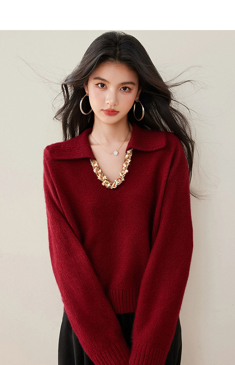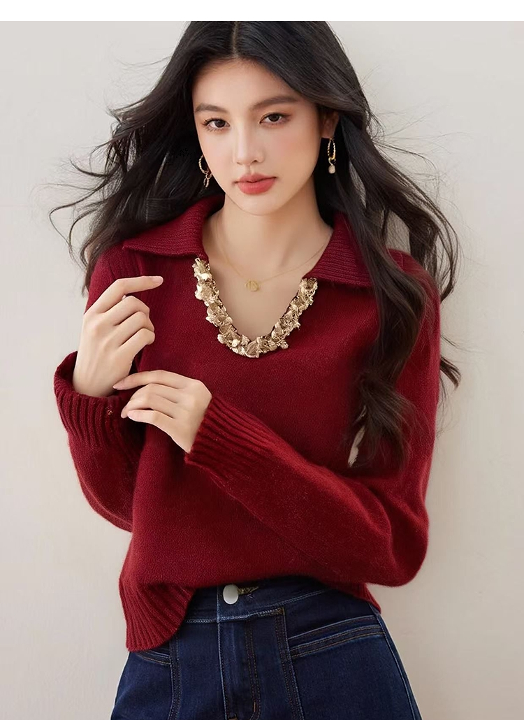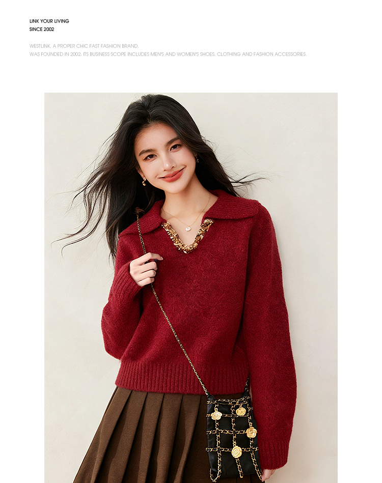 西遇红色毛衣女2025年冬季新款V领亮片宽松百搭打底针织衫SS060011