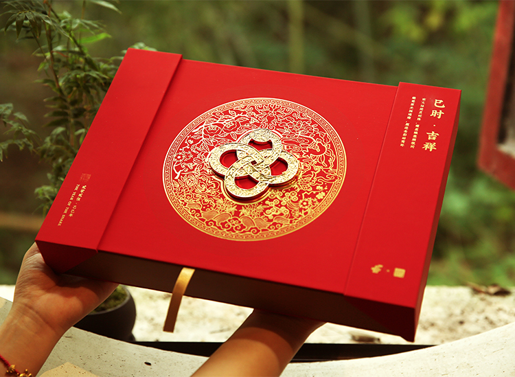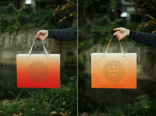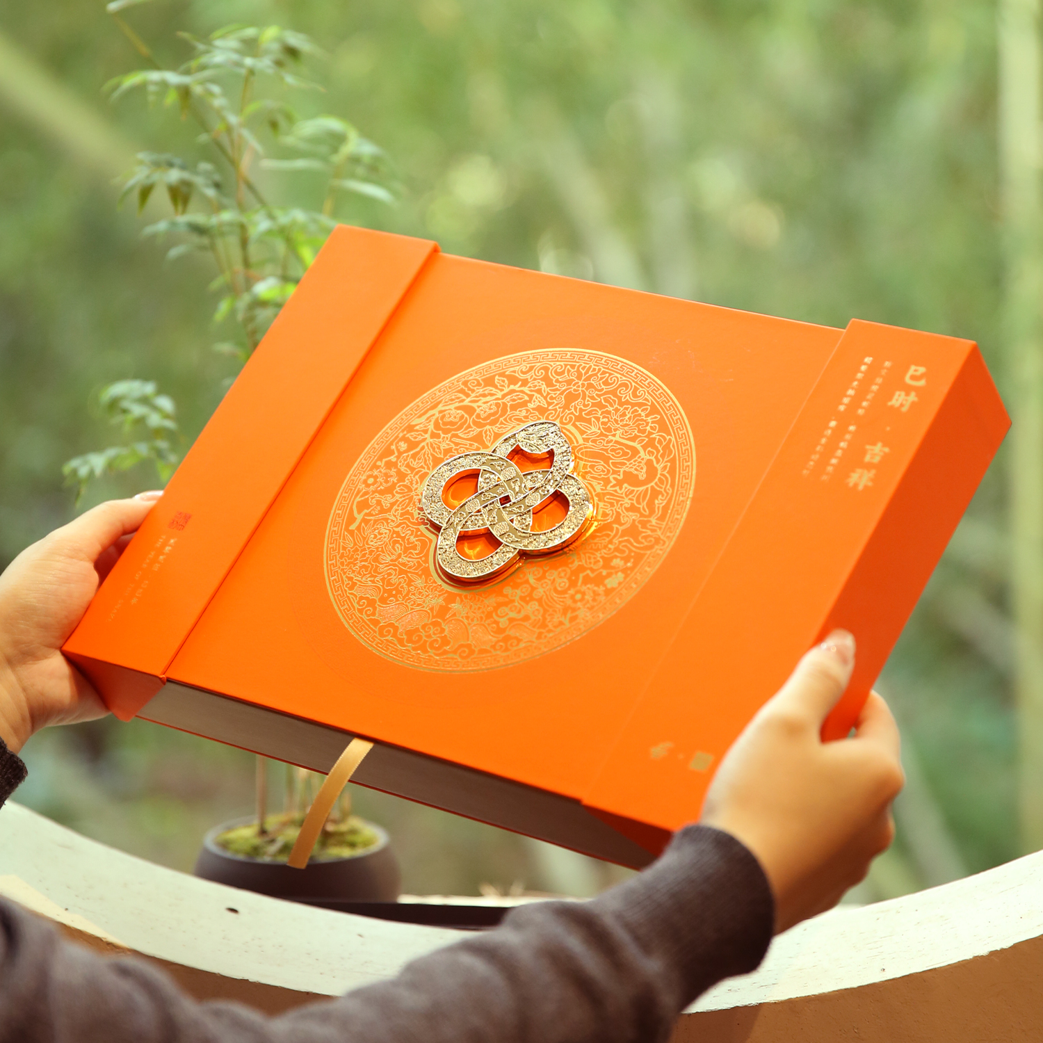 礼盒外附赠一只精美的手提袋,金色烫印的“巳时吉祥”字样与图案呼应,整体设计雅致大气,适合送礼或自。