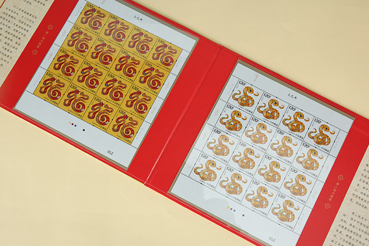 ▲蛇年邮票《蛇呈丰稔》和《福纳百祥》。