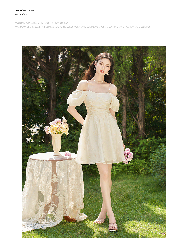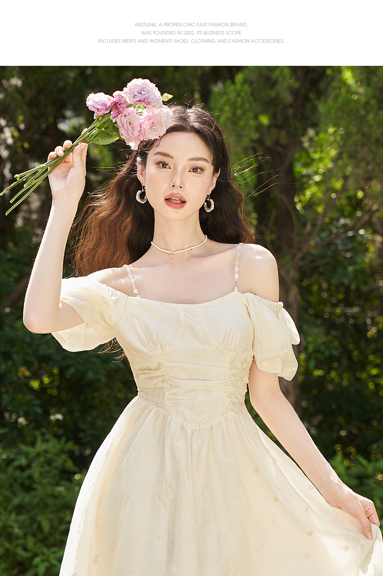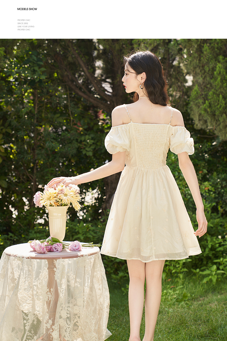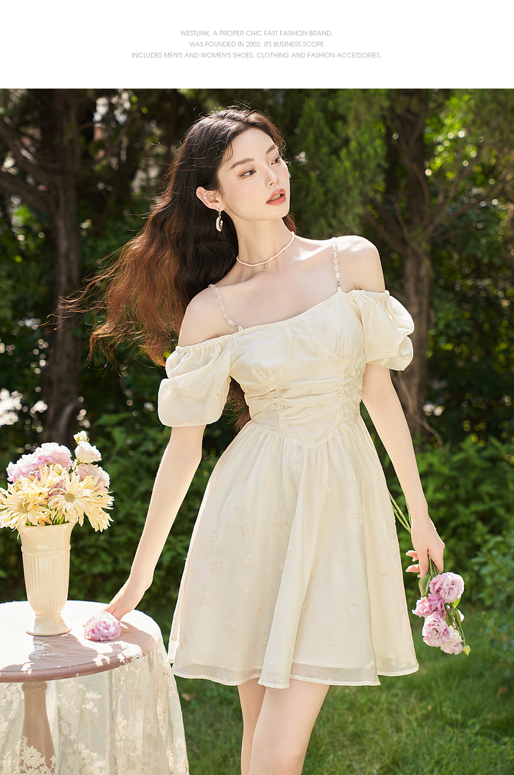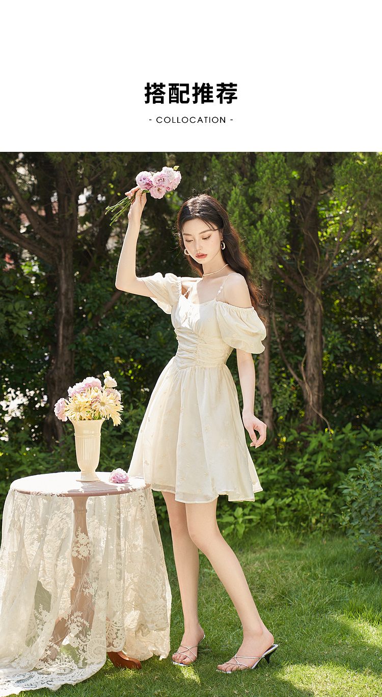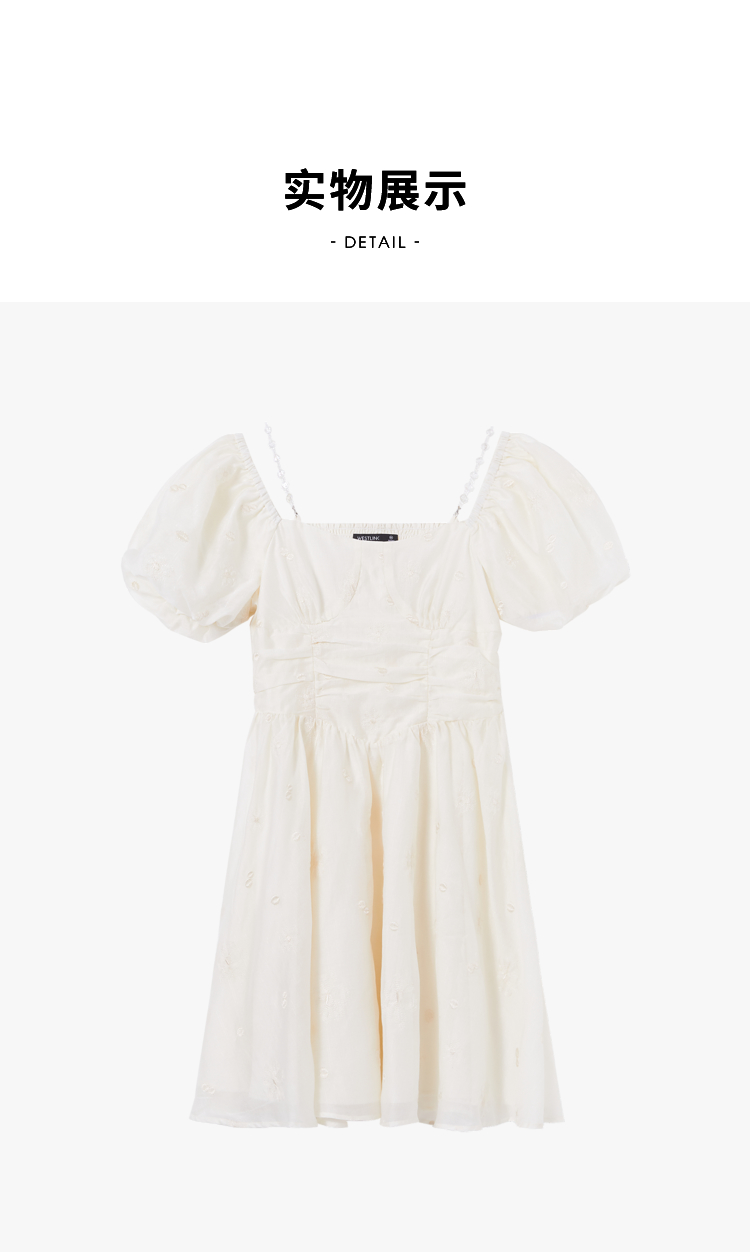 西遇甜美A字裙夏季新款泡泡袖气质淑方领短袖裙女V0031604