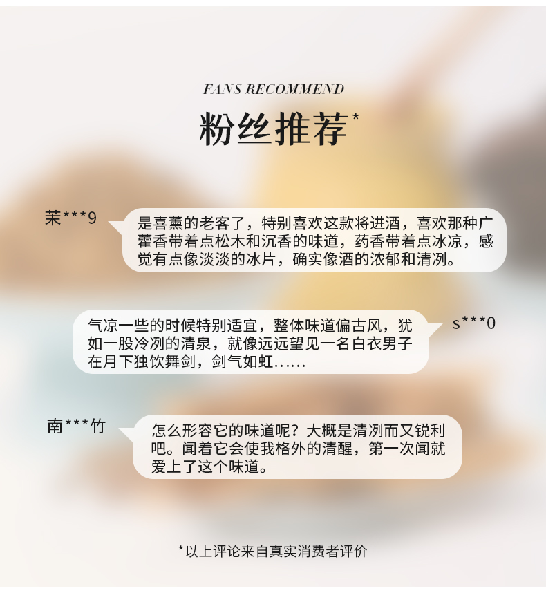 老粉最推荐香品之一!古韵新调的新中式合香,以沉香为主料,以广藿香、香根草等复构调和出酒意烟熏调,营造人生得意须尽欢的微醺香氛。