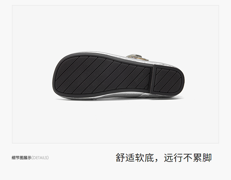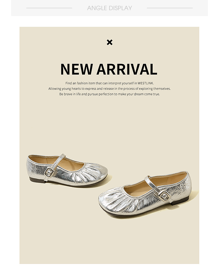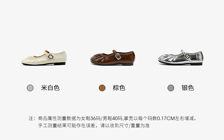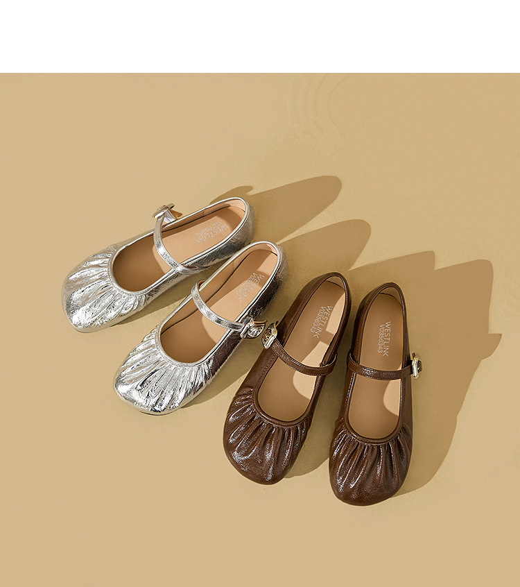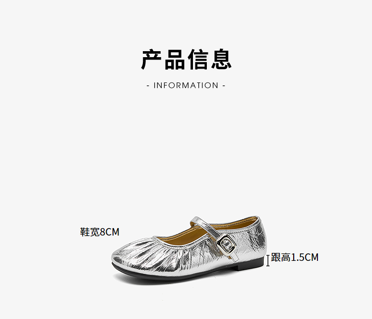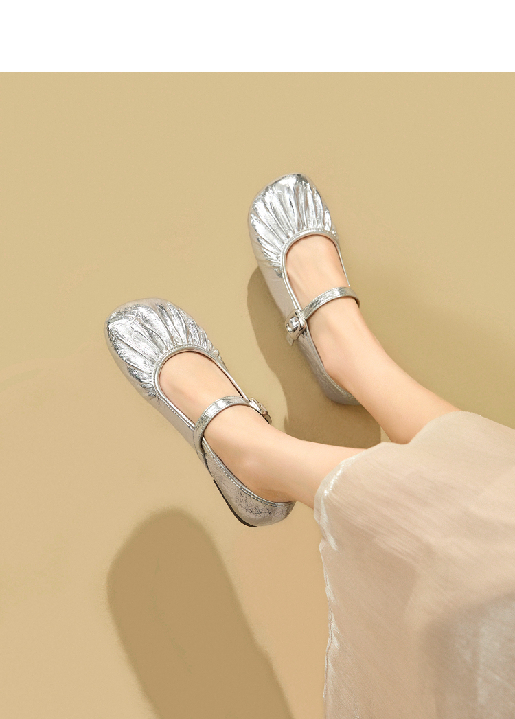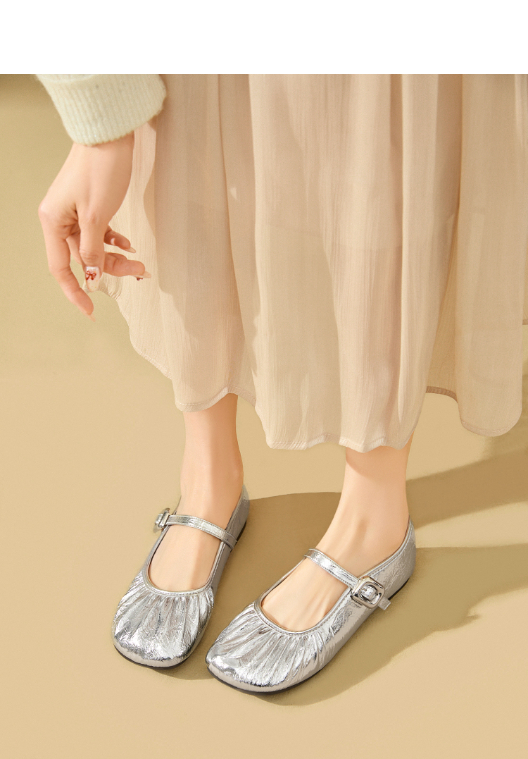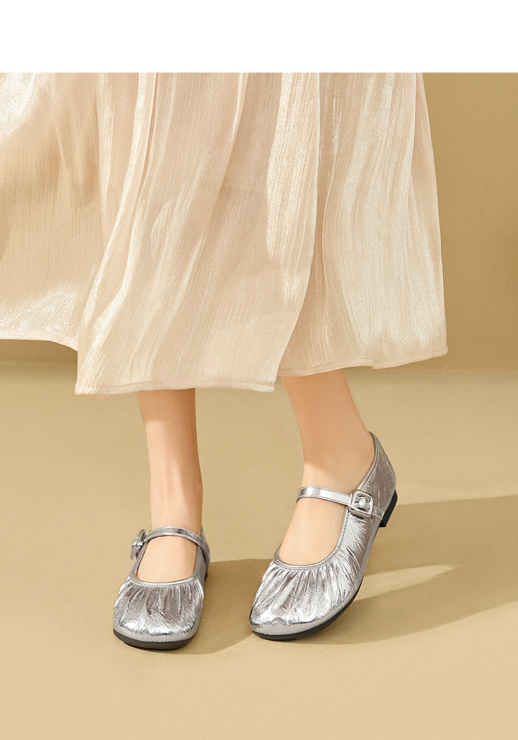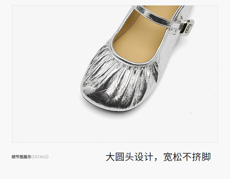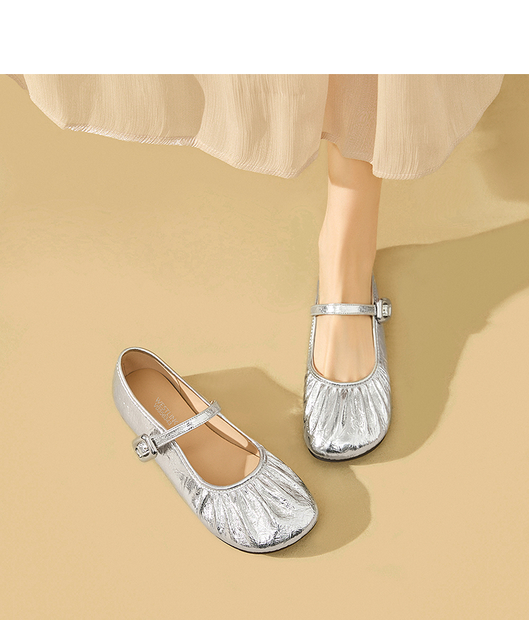 西遇法式单鞋女新款褶皱超软通勤圆头平底鞋银色玛丽珍鞋V0356343