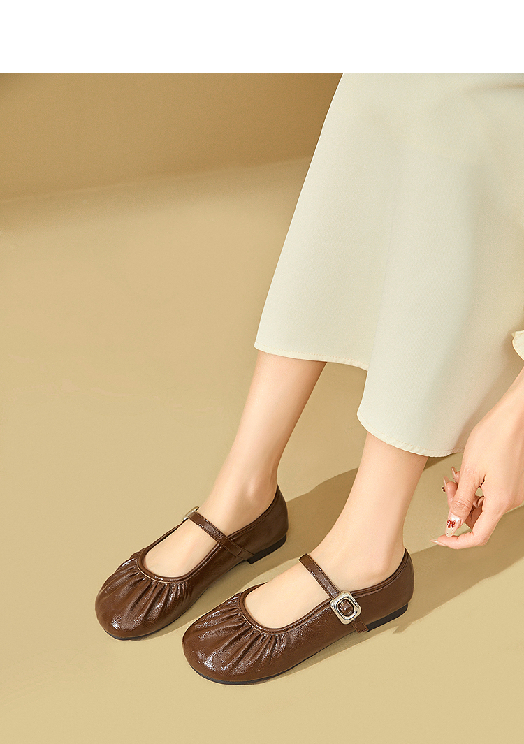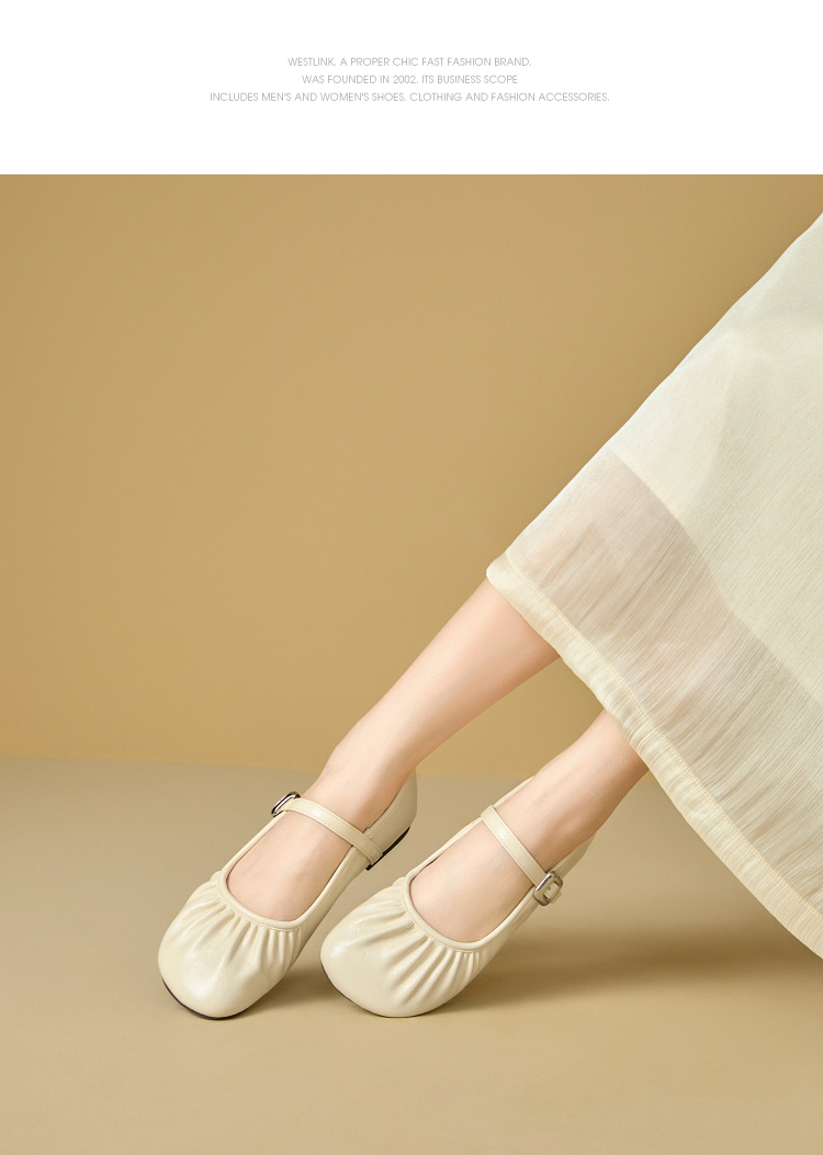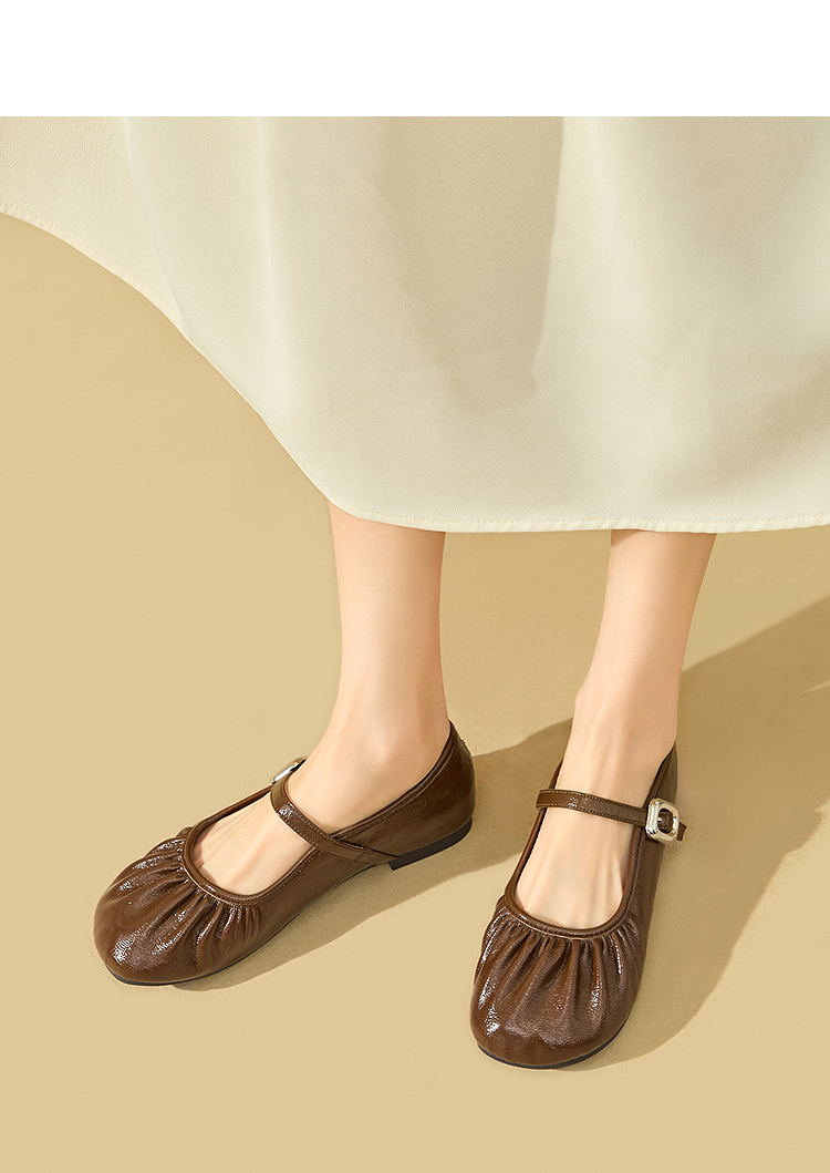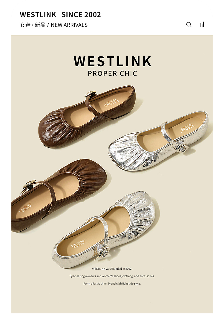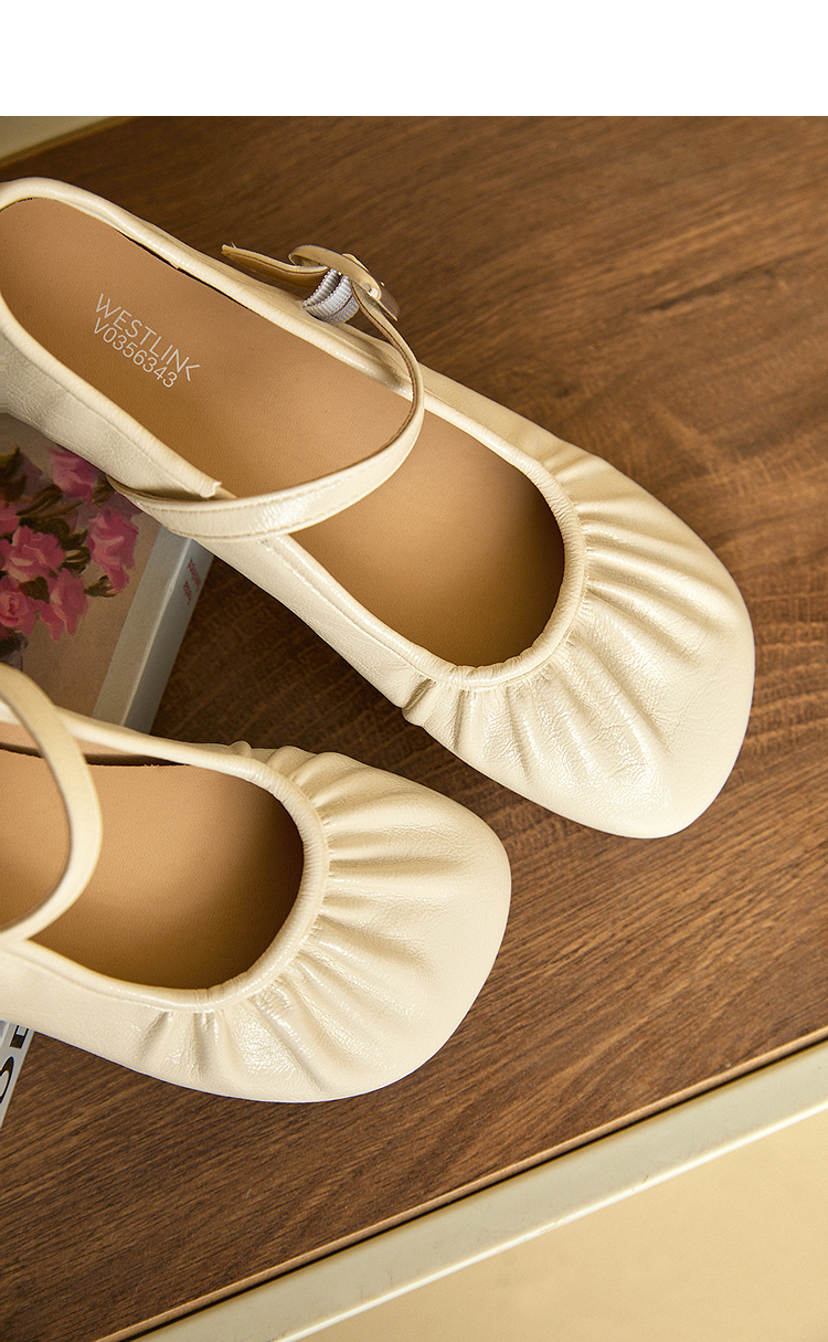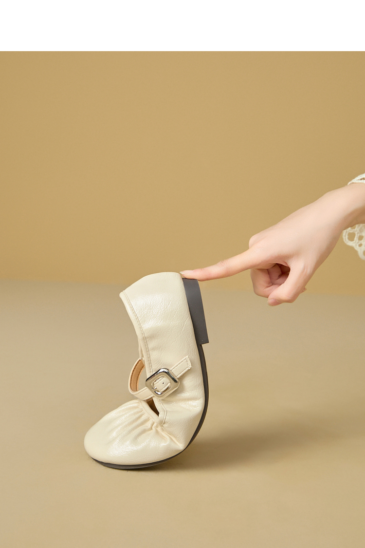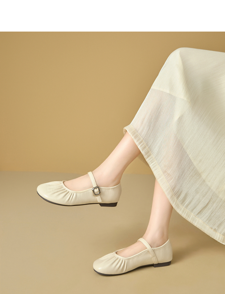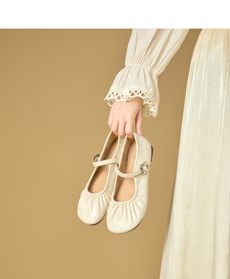 西遇法式单鞋女新款褶皱超软通勤圆头平底鞋银色玛丽珍鞋V0356343