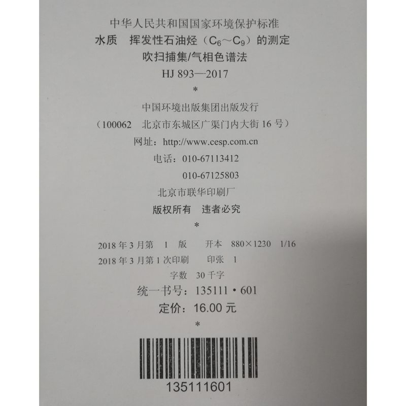 HJ 893—2017水质 挥发性石油烃(C6~C9)的测定 吹扫捕集/气相色谱法 国家标准GB 环境保护 环境科学 135111601