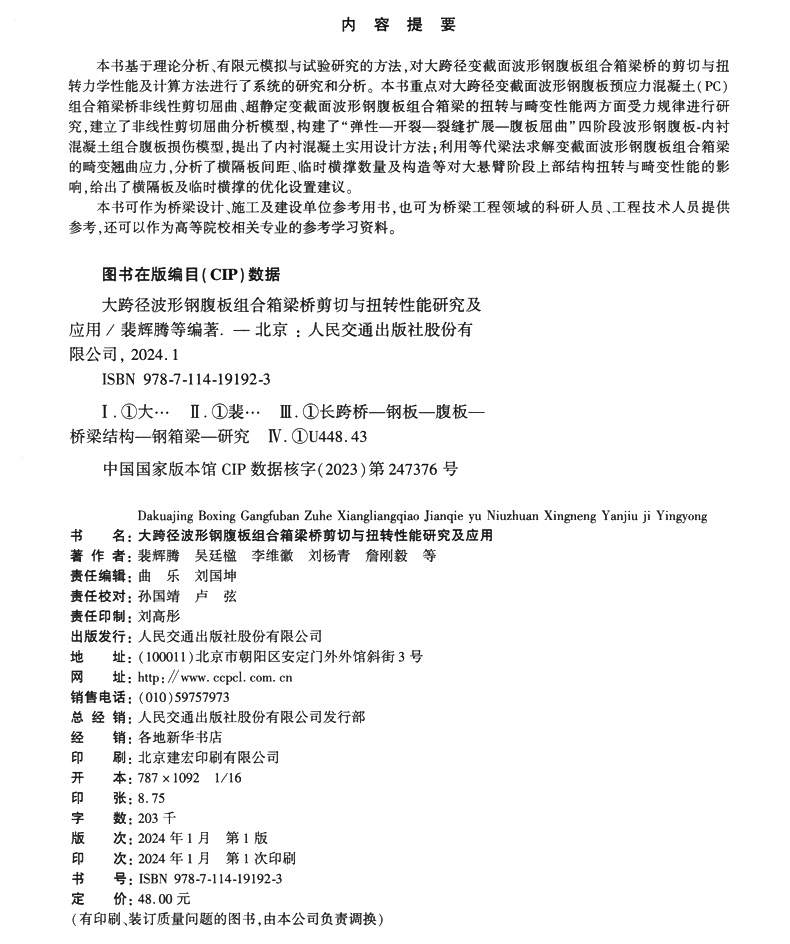 书名:大跨径波形钢腹板组合箱梁桥剪切与扭转性能研究及应用