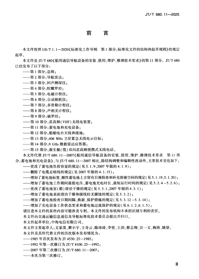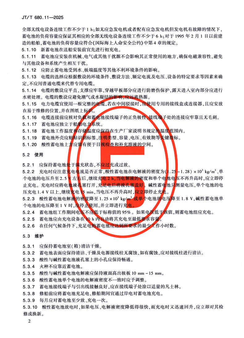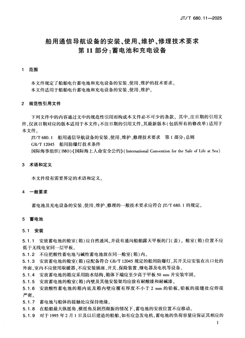 书名:船用通信导航设备的安装、使用、维护、修理技术要求 第11部分:蓄电池和充电设备(JT/T 680.11—2025)