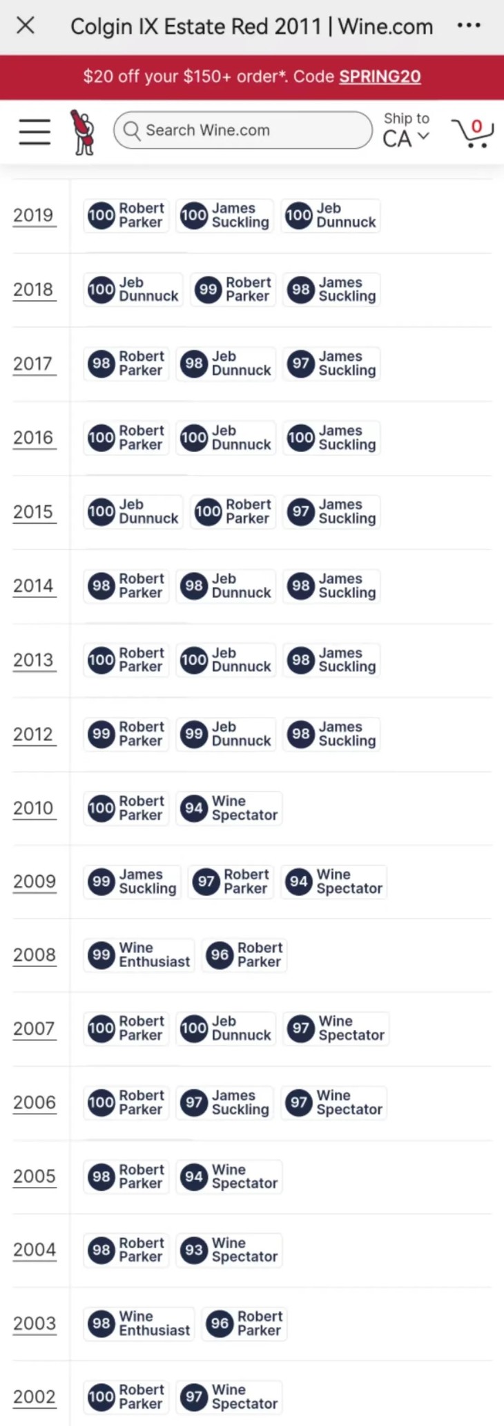 这款酒至今累计23个满分,满屏都是,这大概是美国满分巨多的大酒了。2002年是这款酒推出的第一个年份,就获得了帕克和Falstaff 双100分,帕克直言“perfect”,还说“比我七年前预期的还要好”,目前已经累计获得8个帕克满分。