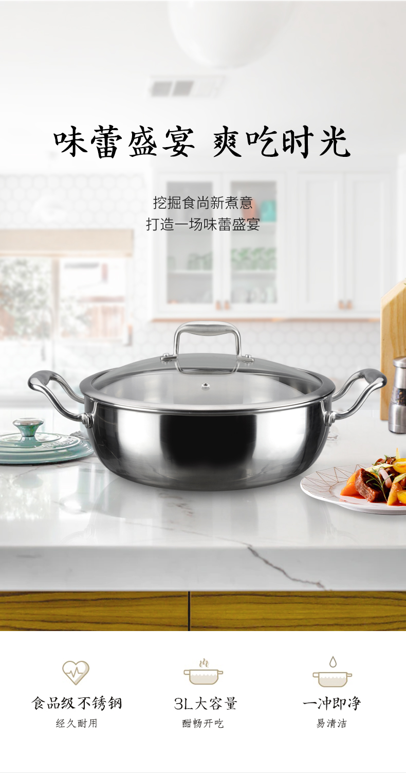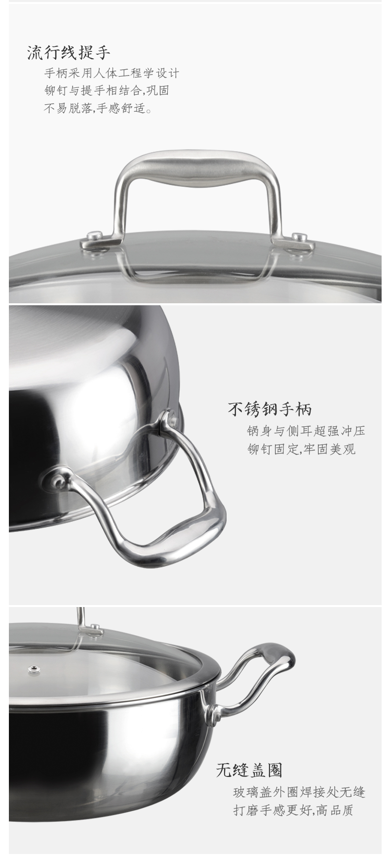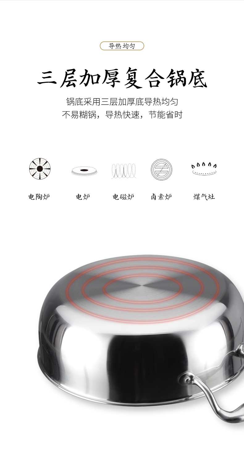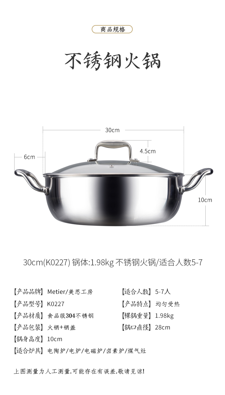 美思工房304不锈钢无涂层加厚火锅30cm燃气电磁炉通用K0227