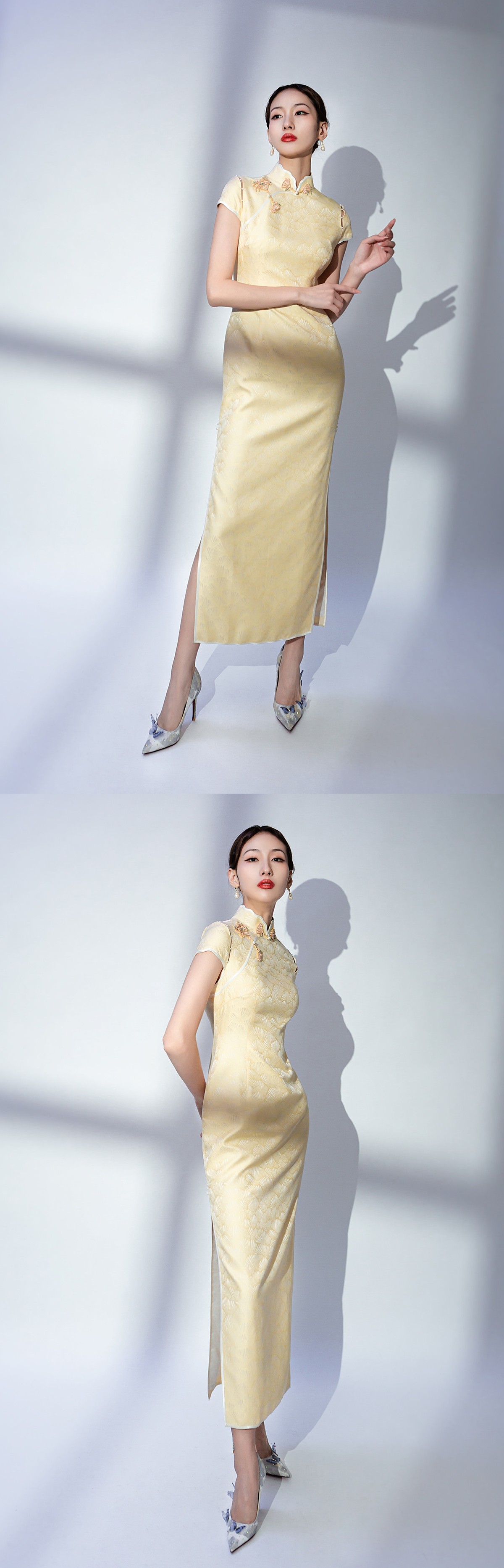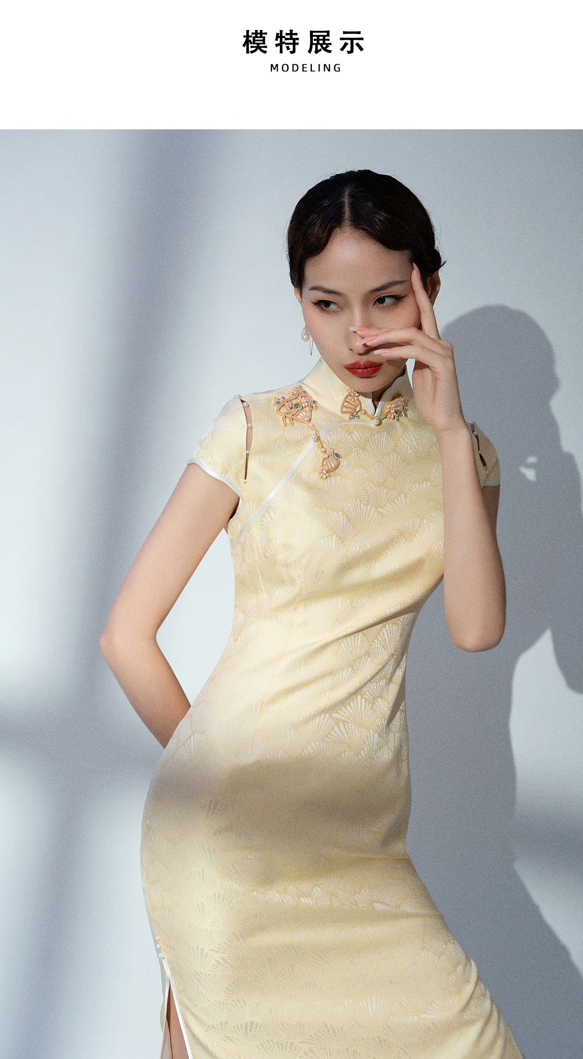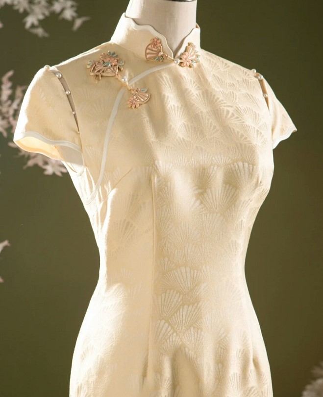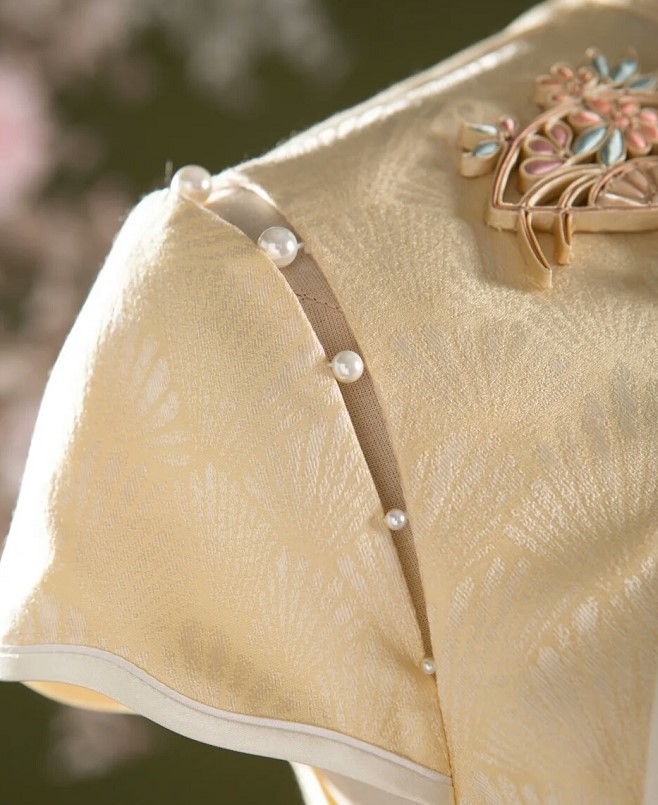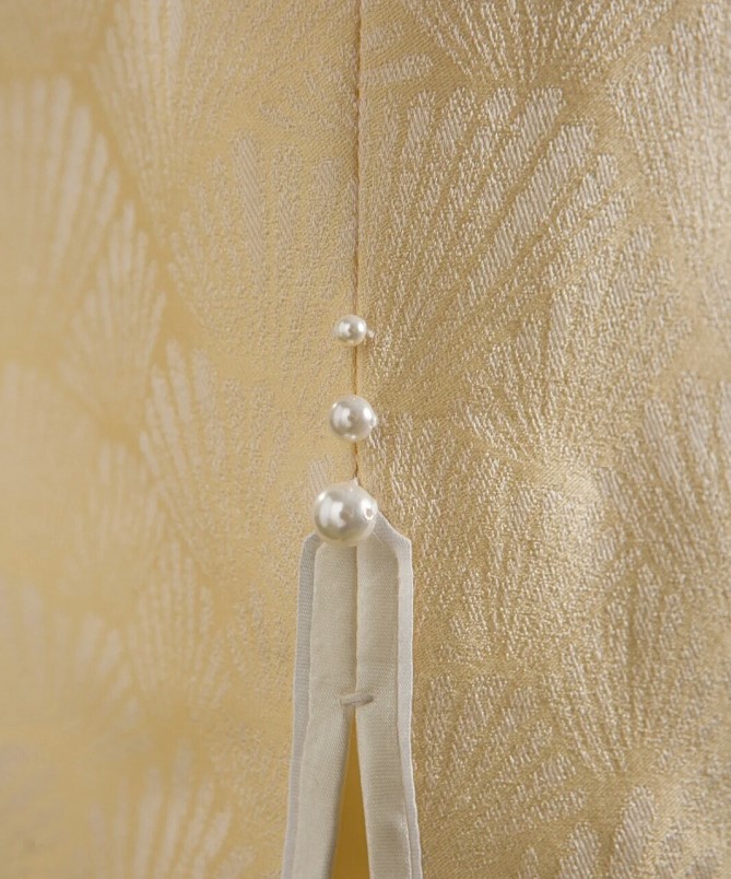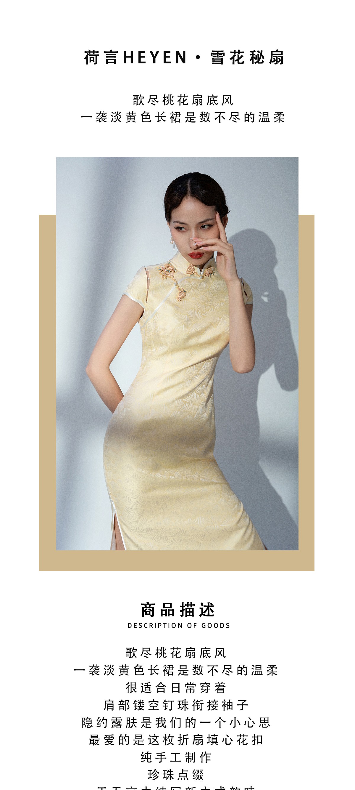 荷言HEYEN 雪花秘扇 时装周款 扇纹真丝提花缎+花朵折扇填心花扣+珍珠连接袖
