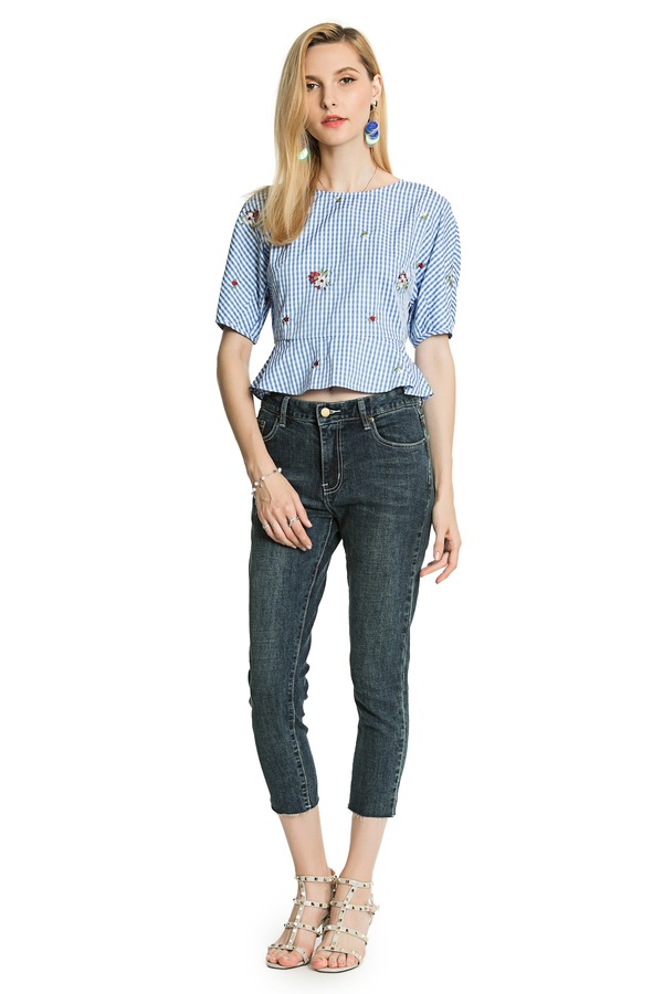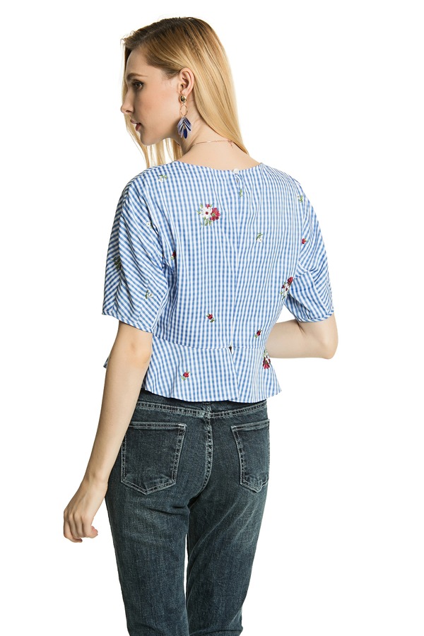 SUMMER & SAGE 蓝色绣花格纹上衣 3305